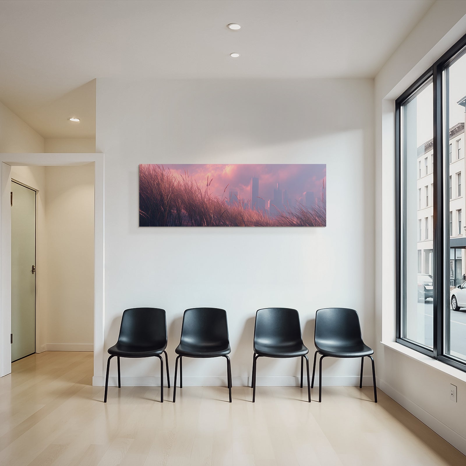Setz ein Statement: „Ruhige Landschaft Grasstadt Skyline Sunset“ im Stil Dünen und Heide wird im FameFrame™ zum echten Kunstobjekt an Deiner Wand.