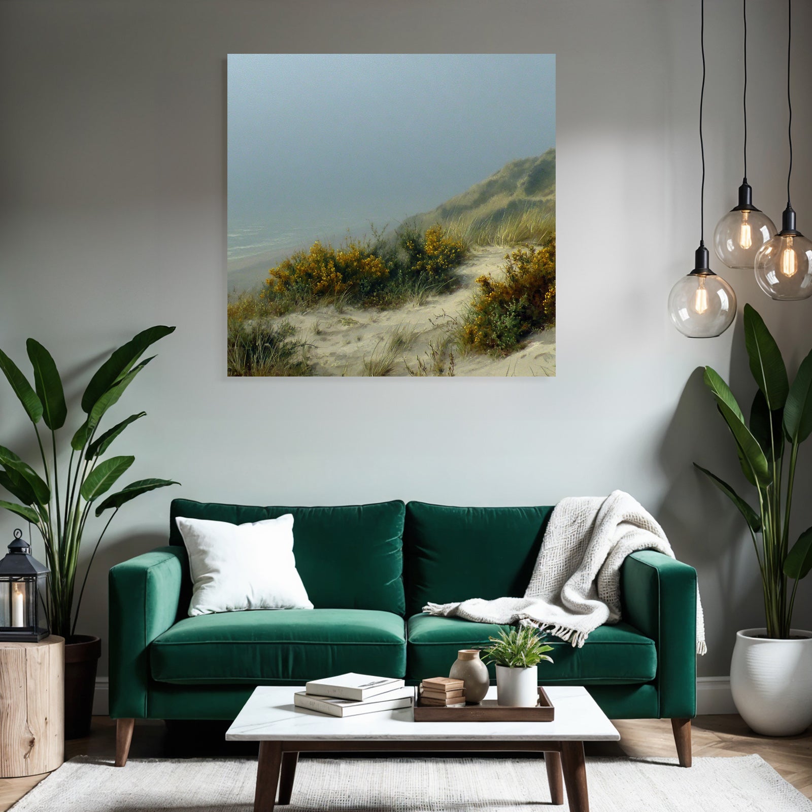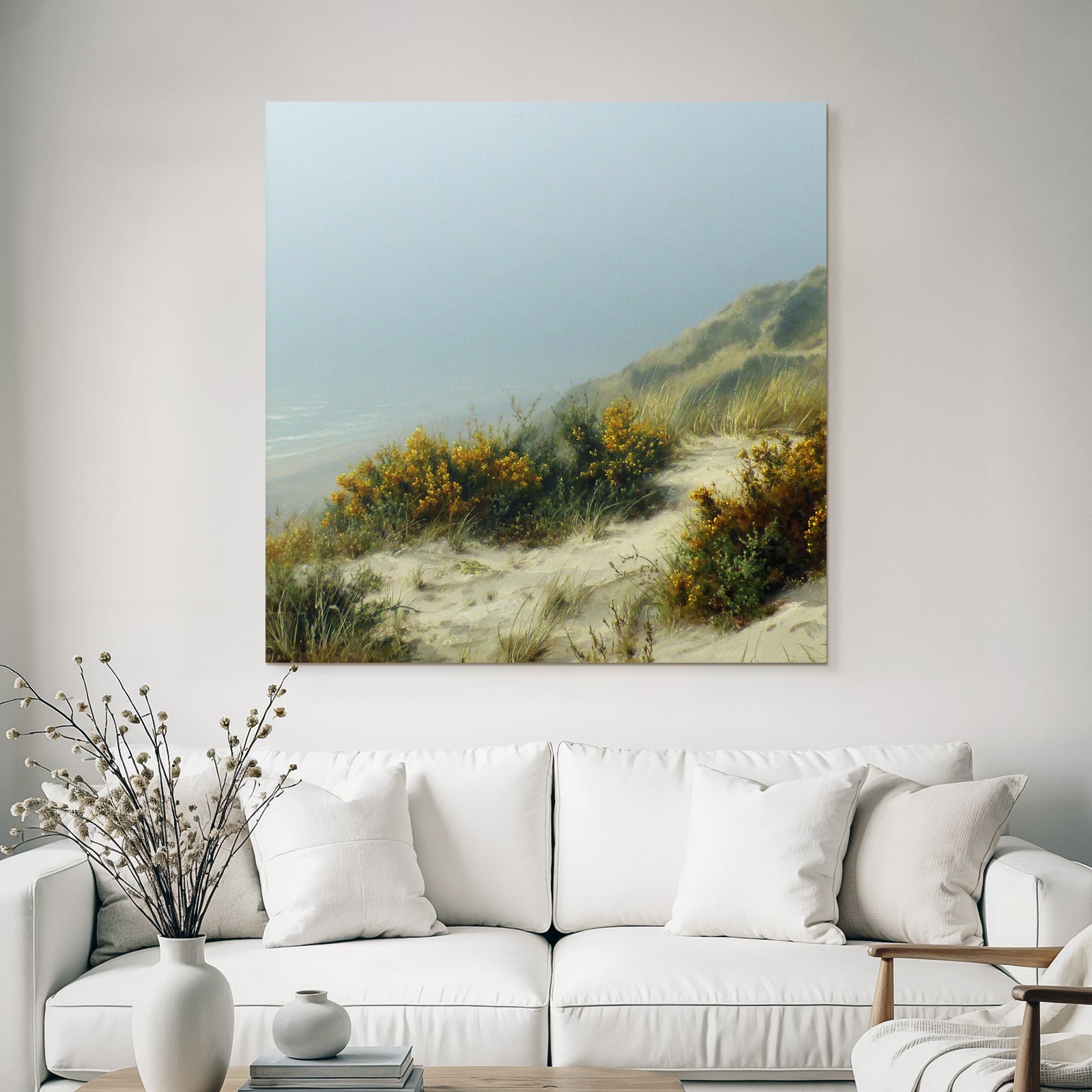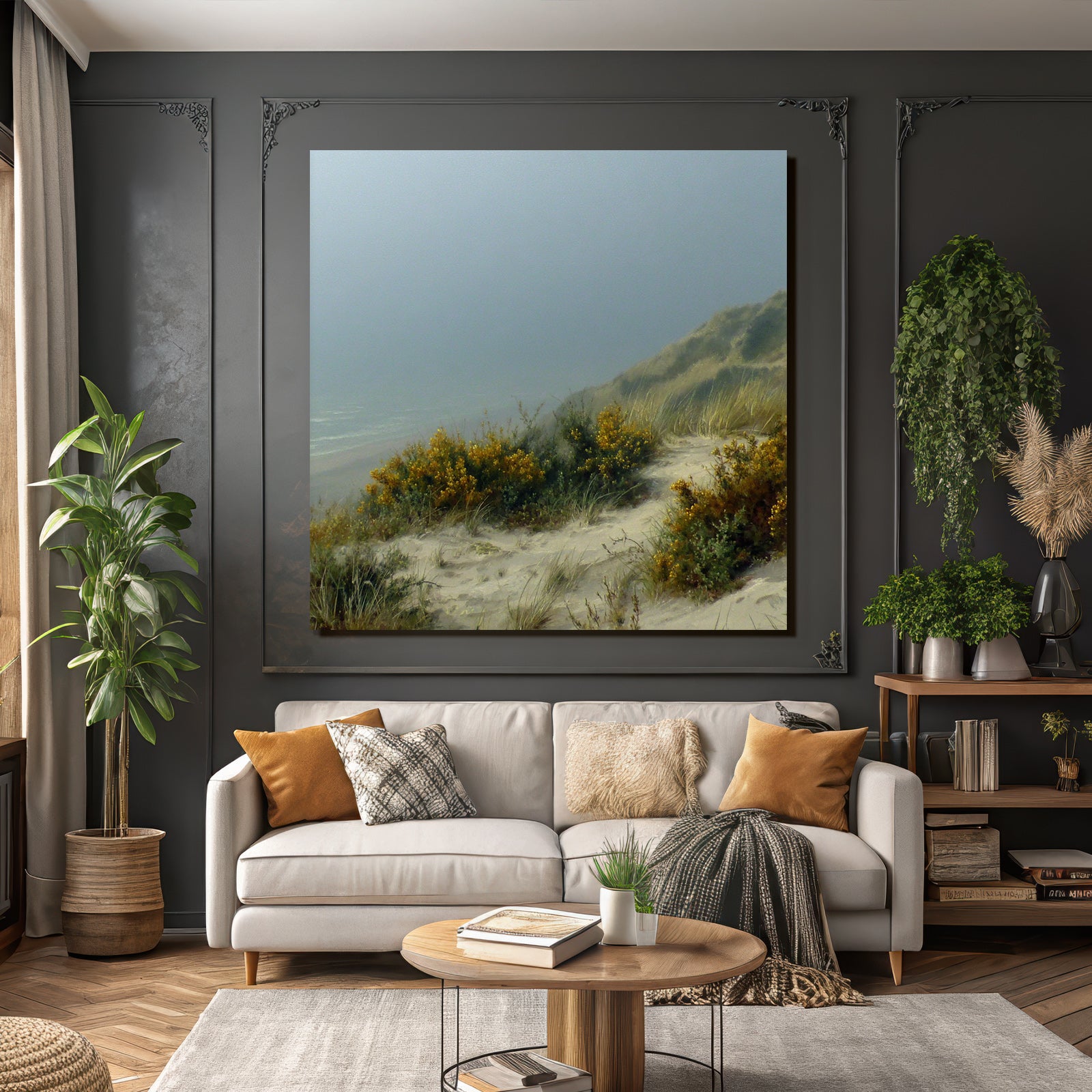 „Küstenlandschaft Mit Sanddünen Und Nebelartige Atmosphäre“ verleiht Ihrem Raum Charakter. Die Anlehnung an den Stil Dünen und Heide, kombiniert mit der schlichten Eleganz des FameFrame™, schafft eine einzigartige Atmosphäre.