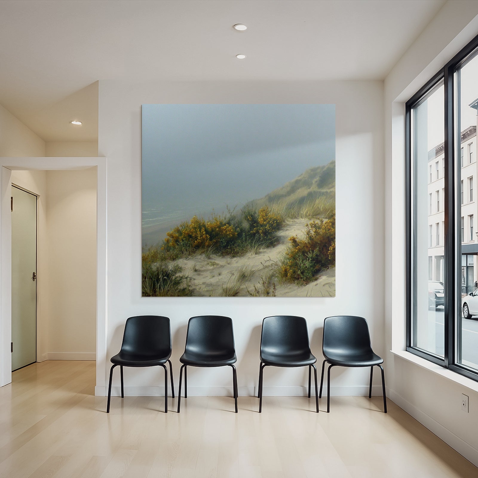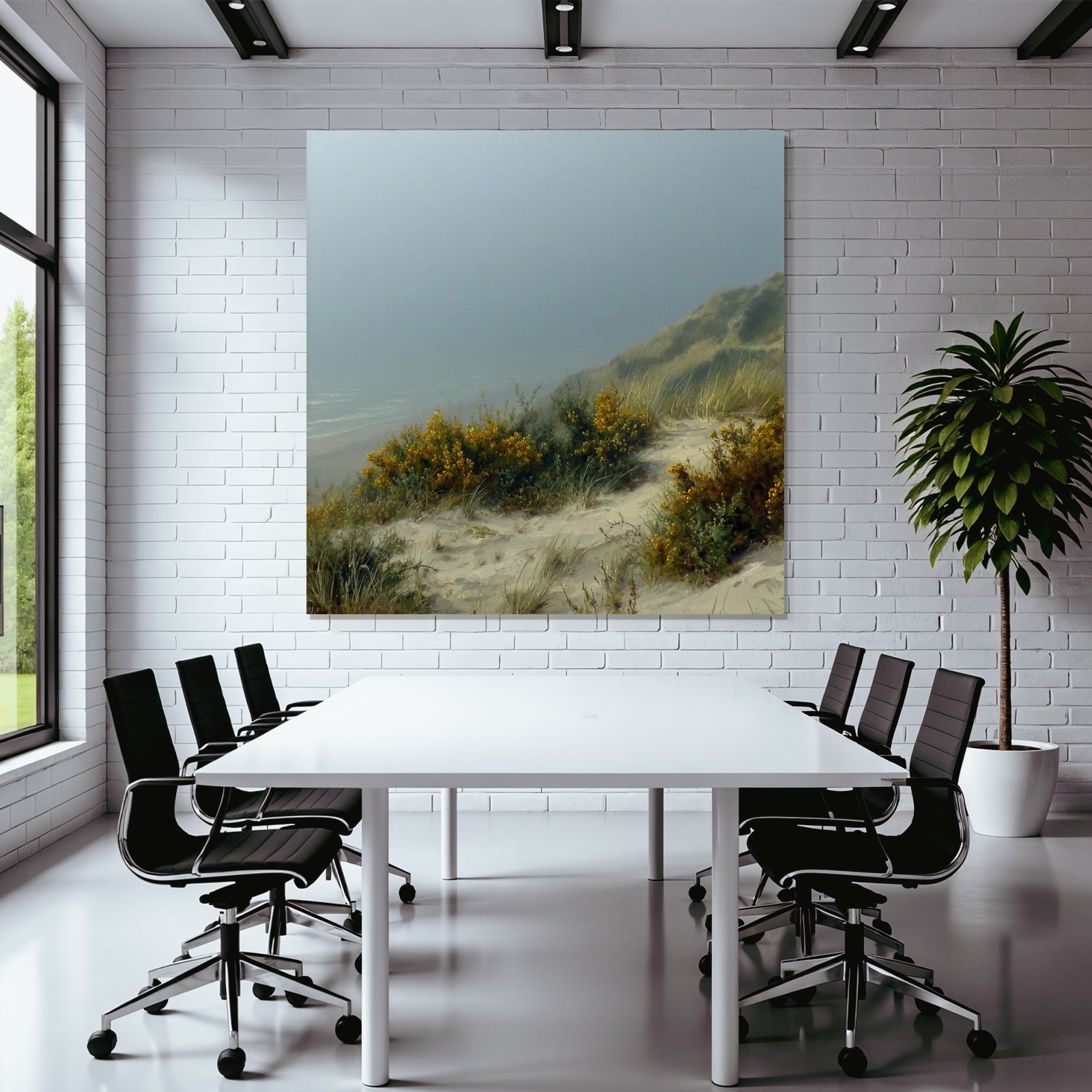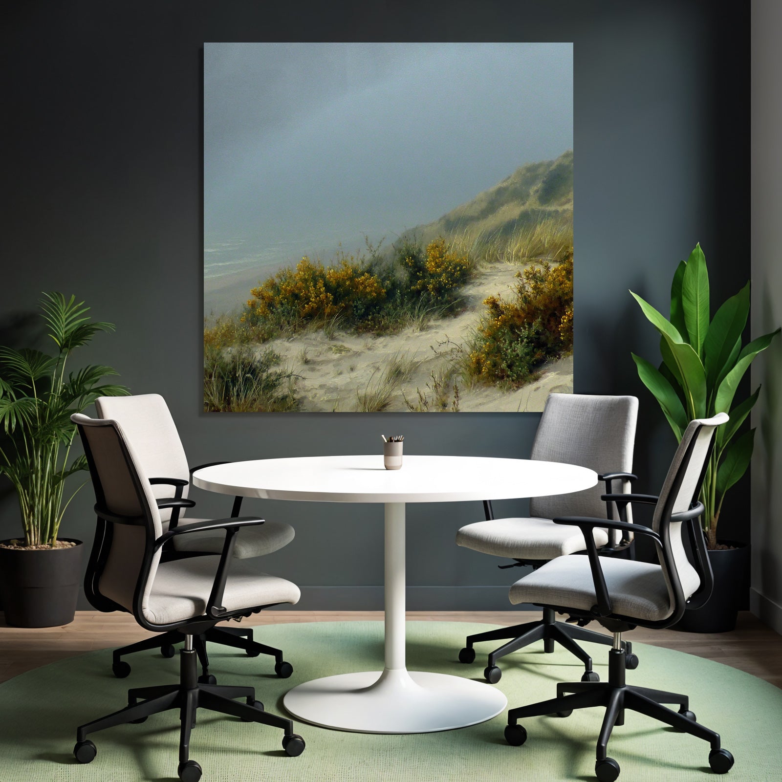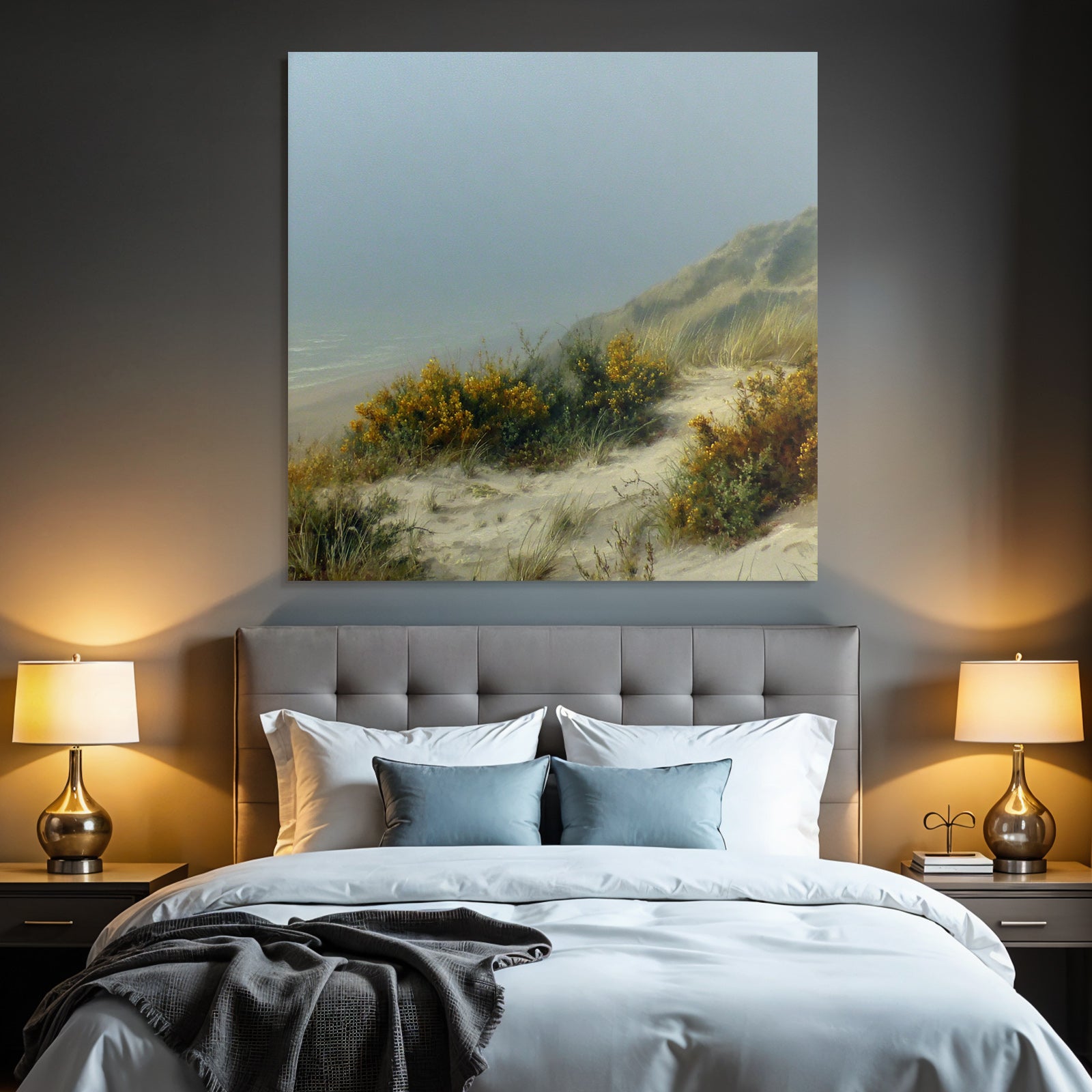 „Küstenlandschaft Mit Sanddünen Und Nebelartige Atmosphäre“ verleiht Ihrem Raum Charakter. Die Anlehnung an den Stil Dünen und Heide, kombiniert mit der schlichten Eleganz des FameFrame™, schafft eine einzigartige Atmosphäre.