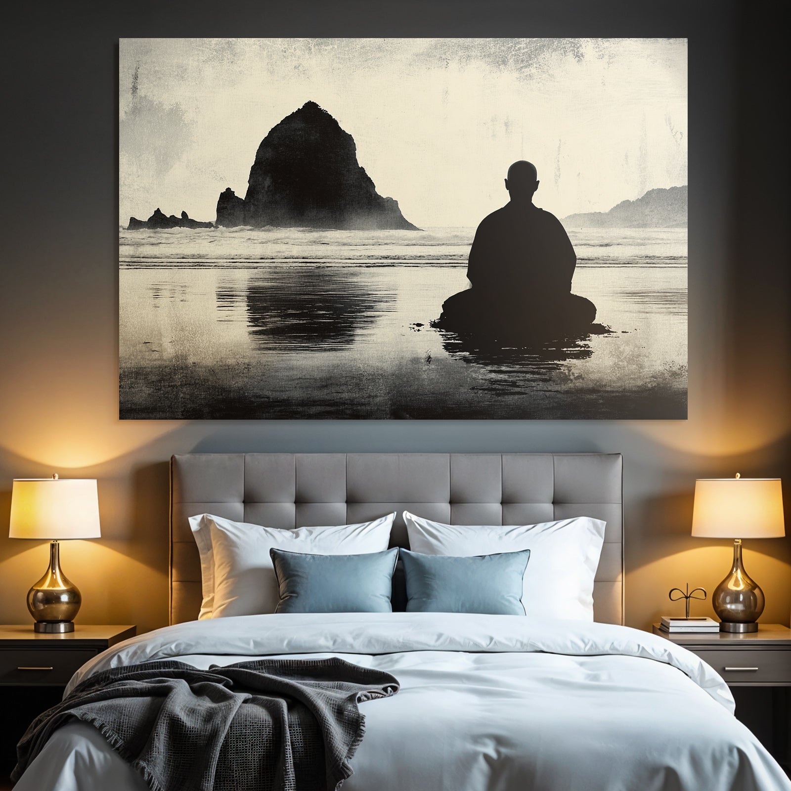 Eine Symbiose aus Kunst und Technik: Das Motiv „Yoga Meditation Meditierende Person Am Ozean Mit Felseninsel Hintergrund Ruhige Stimmung“ im Stil Yoga und Meditation entfaltet auf dem Hightech-Textil des FameFrame™ eine unvergleichliche Tiefenwirkung.