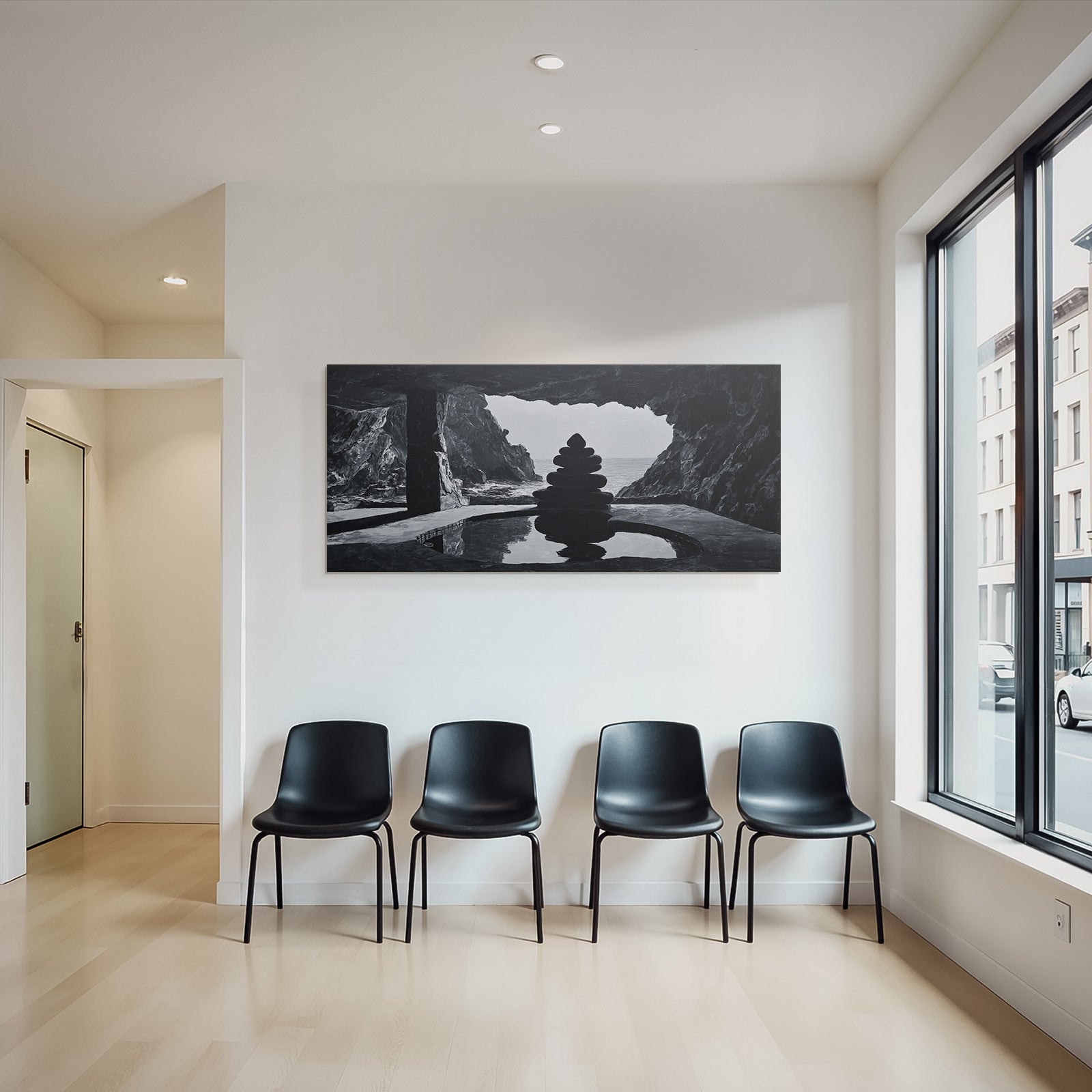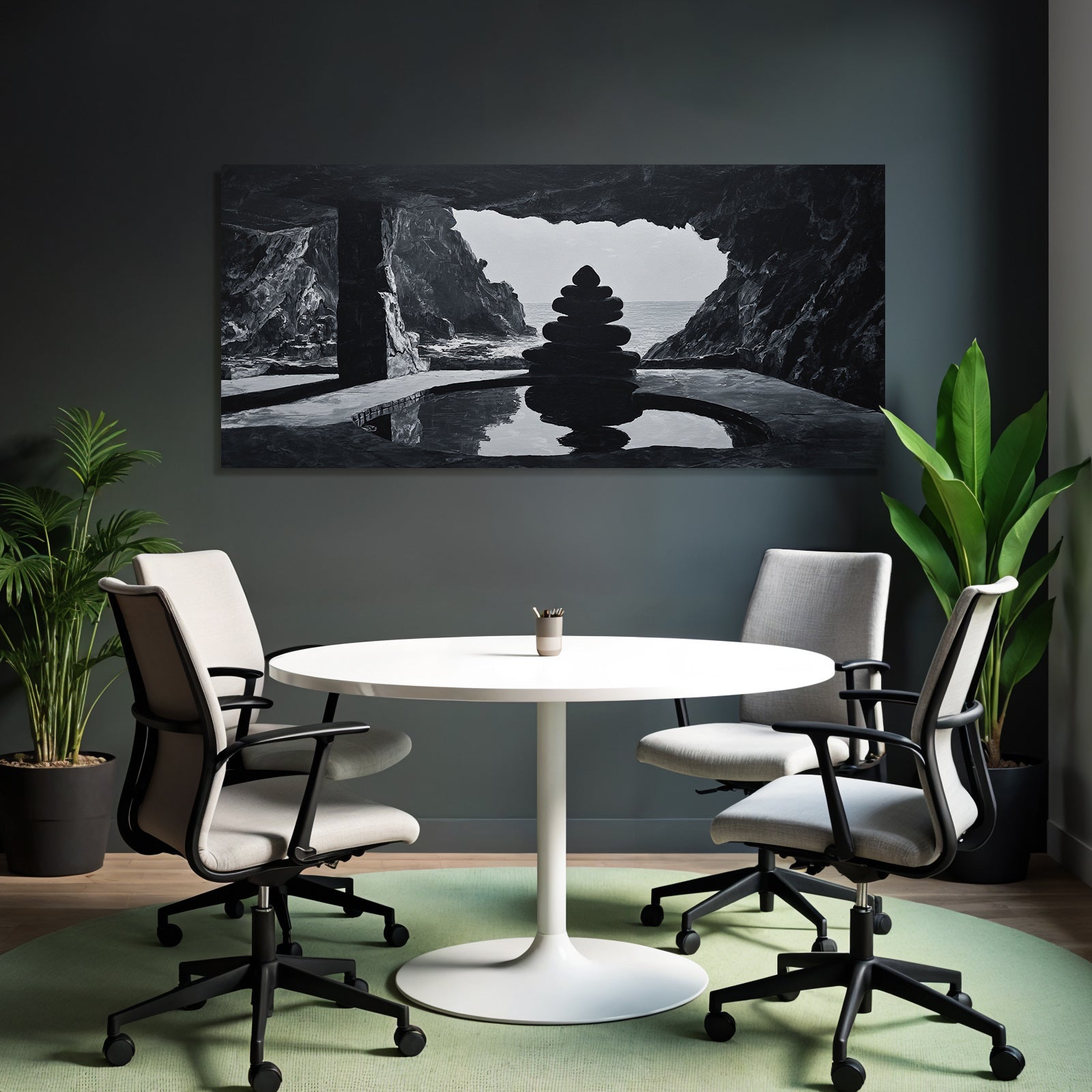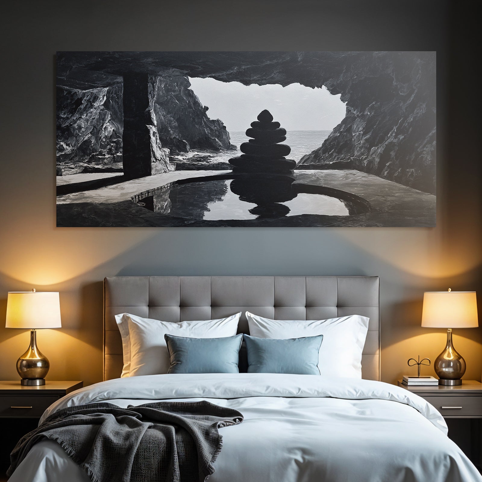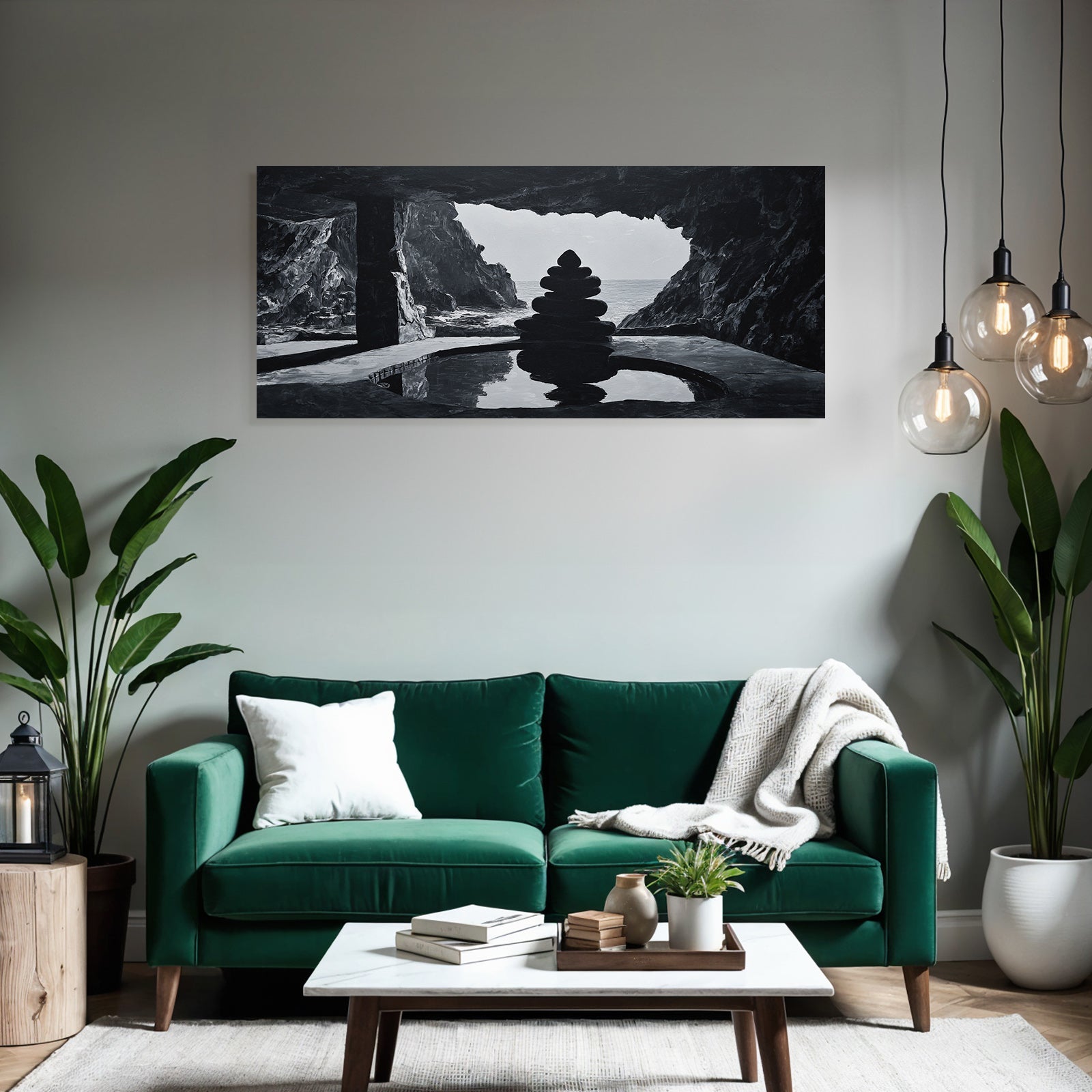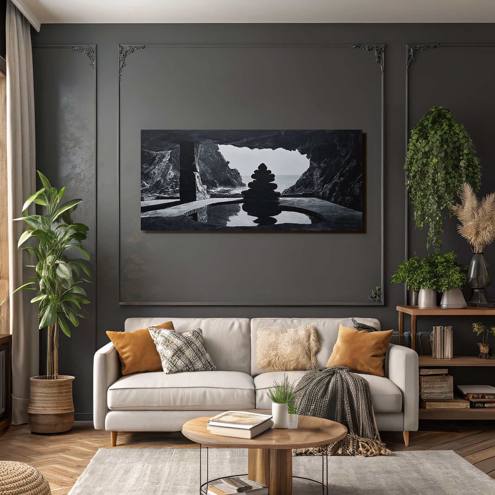 Kunst trifft Design: „Yoga Meditation Monochromes Gebirgslandschaft Mit Kies Stapel Und Meeröffnung“ im Stil Yoga und Meditation entfaltet im FameFrame™ seine volle Ausdruckskraft.