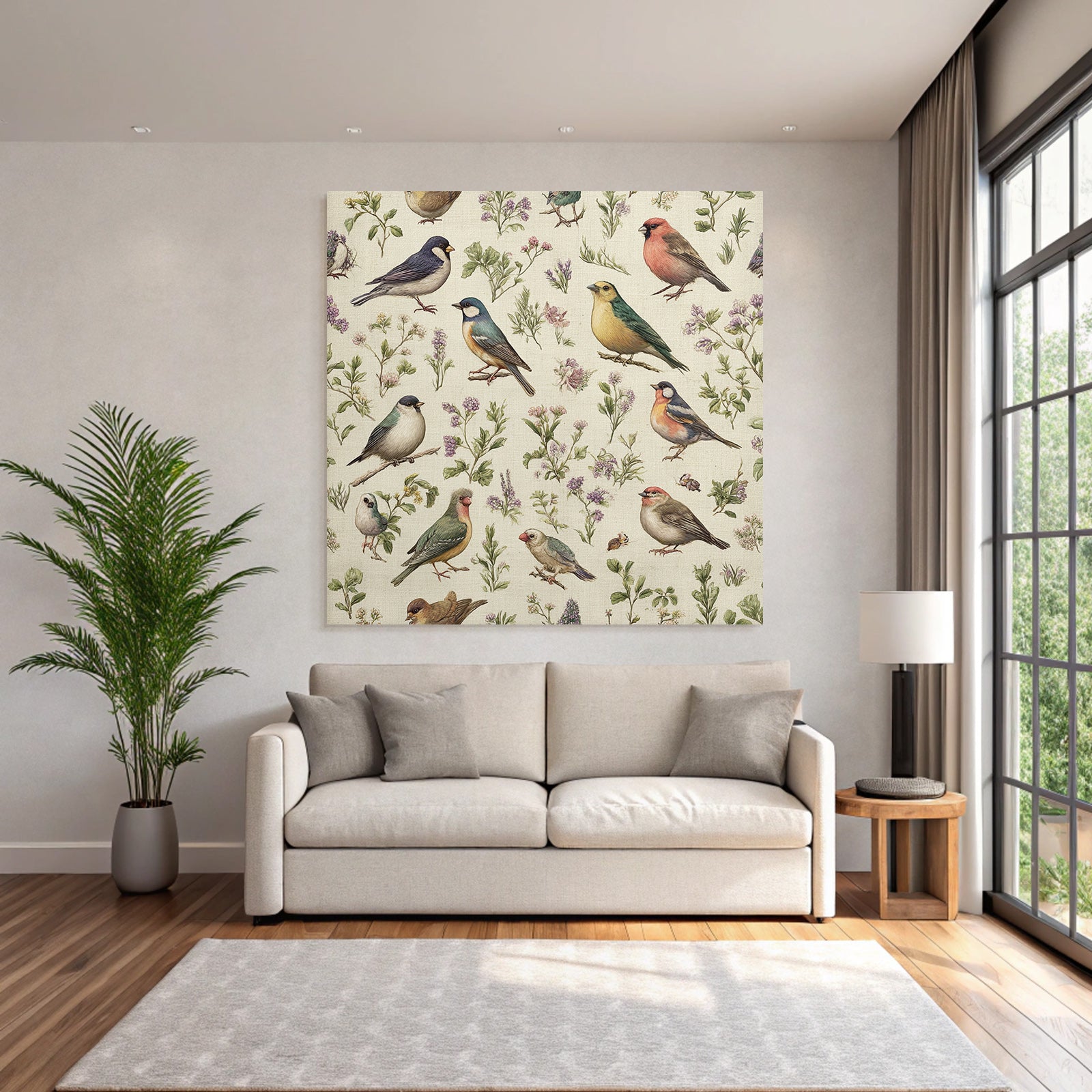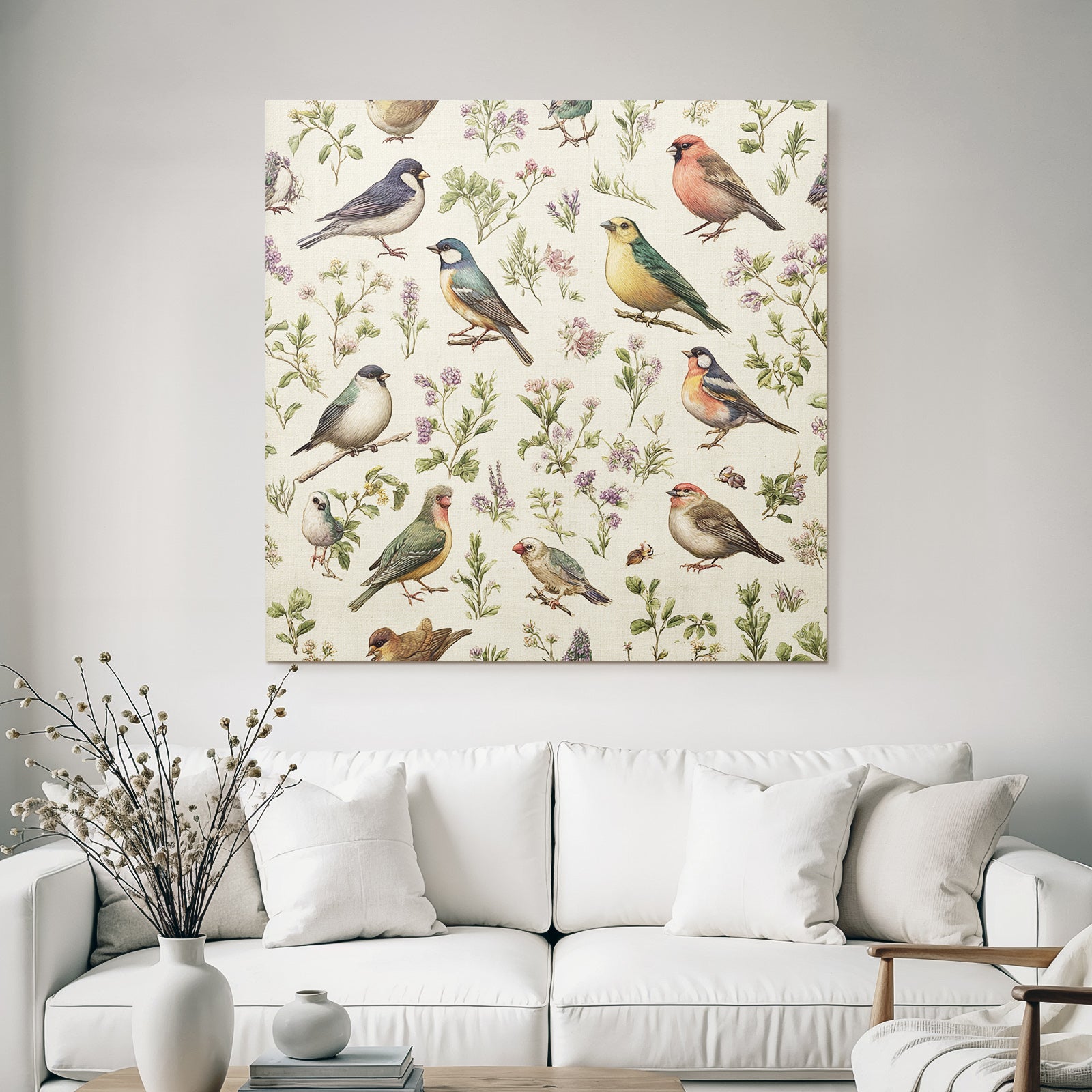 „„Voegel Und Blumen Muster““ bringt den Stil Romantisch und Landhaus an Deine Wand – perfekt für Schlafzimmer, Homeoffice oder Besprechungsräume, edel gerahmt im FameFrame.