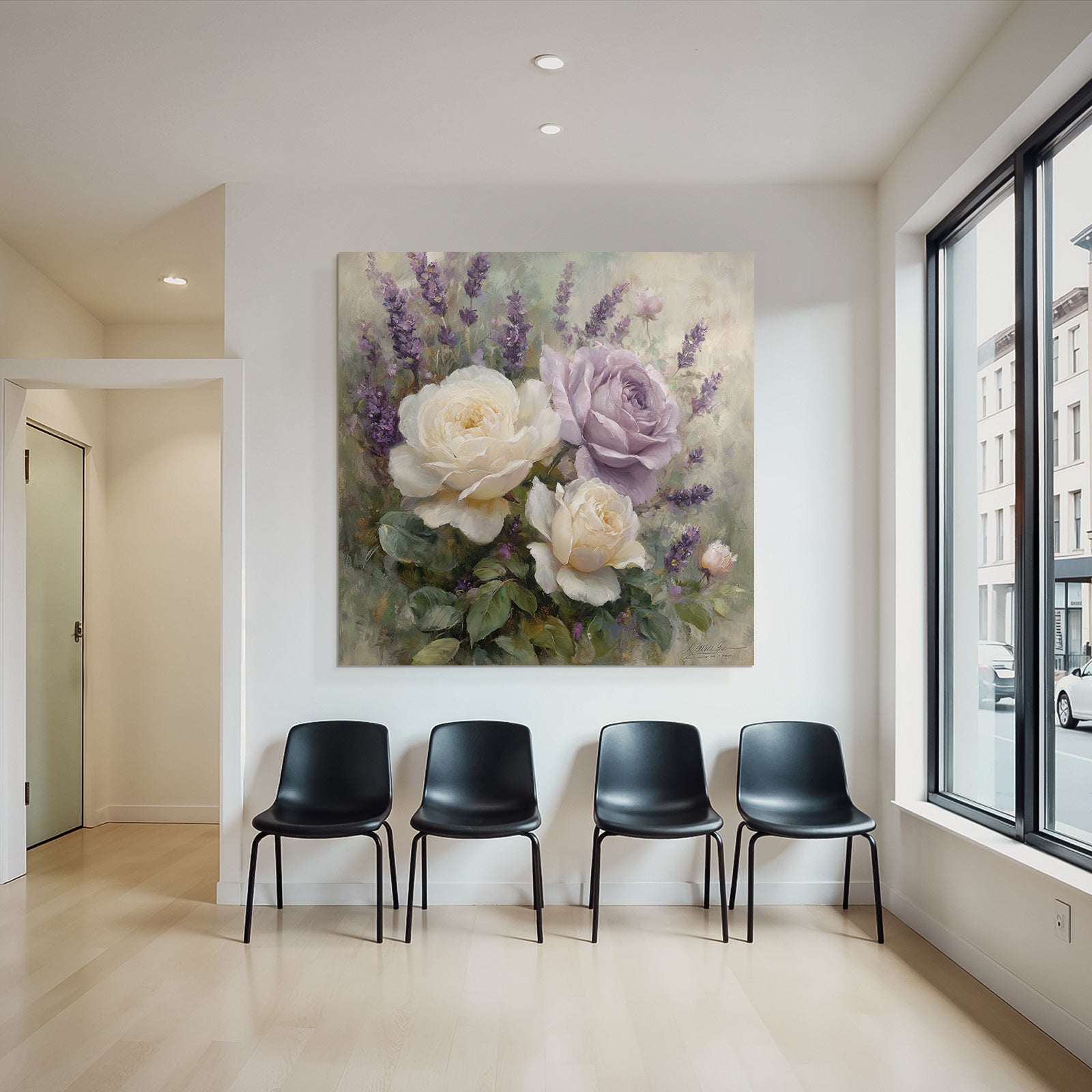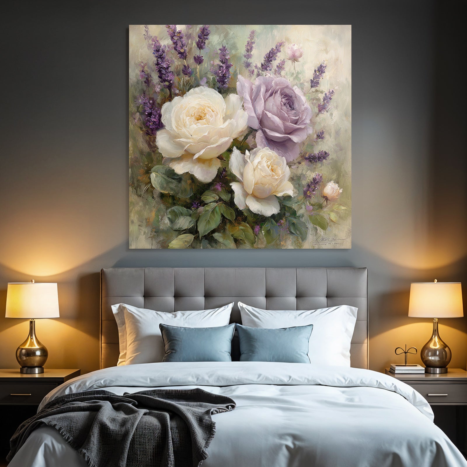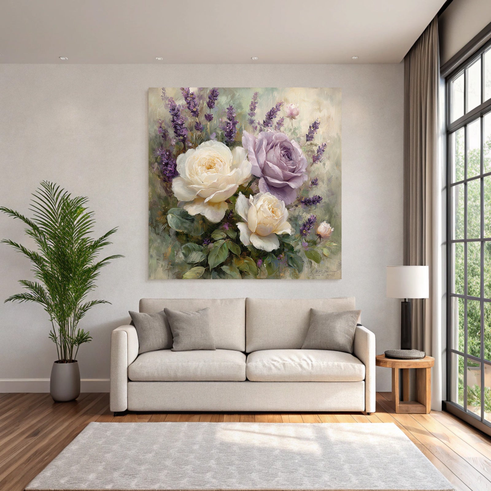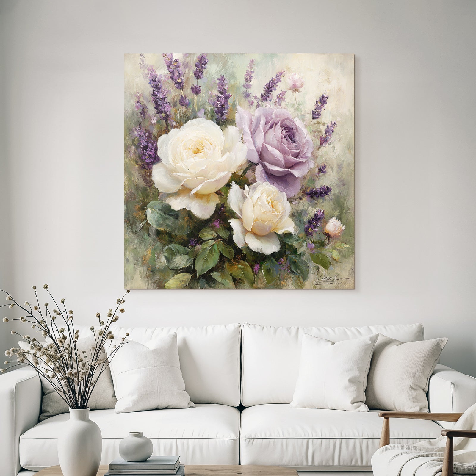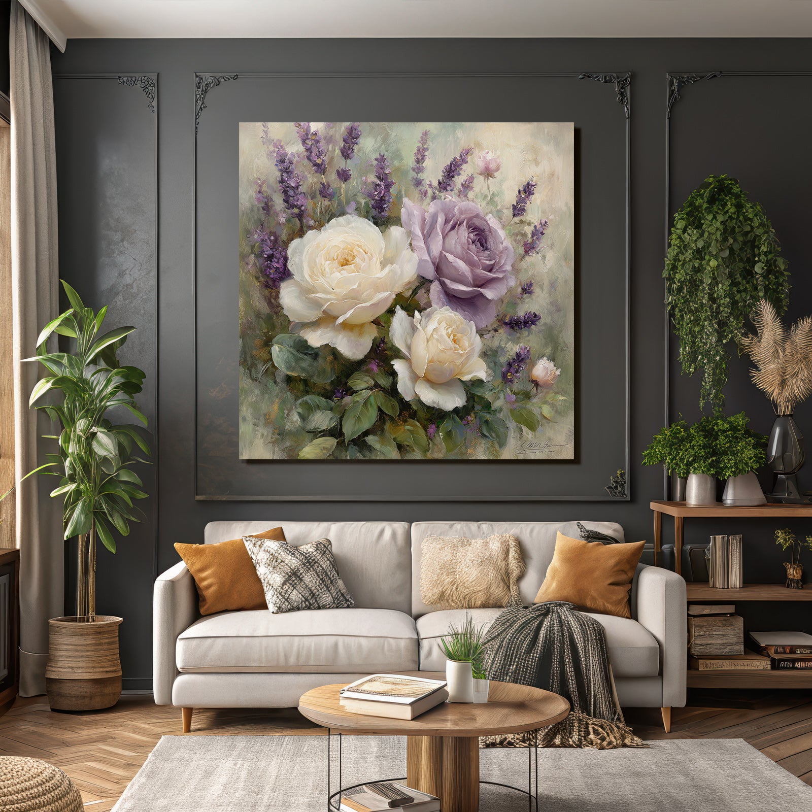 Mit Rosen Tulpen Lavendel-Elementen und klarer Wirkung verleiht „Anmutige Komposition Mit Weissen Und Lavendelfarbenen Rosen“ Deinem Raum Persönlichkeit – eingerahmt im exklusiven FameFrame.
