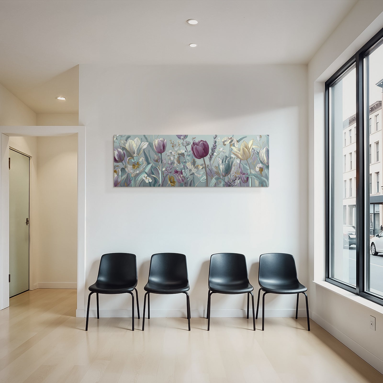 Mit dem Werk „Florales Botanisches Muster Mit Tulpen“ im Stil Rosen Tulpen Lavendel gestaltest Du Dein Wartezimmer oder Deine Hotel-Lobby eindrucksvoll und modern – auf Stoff im FameFrame.