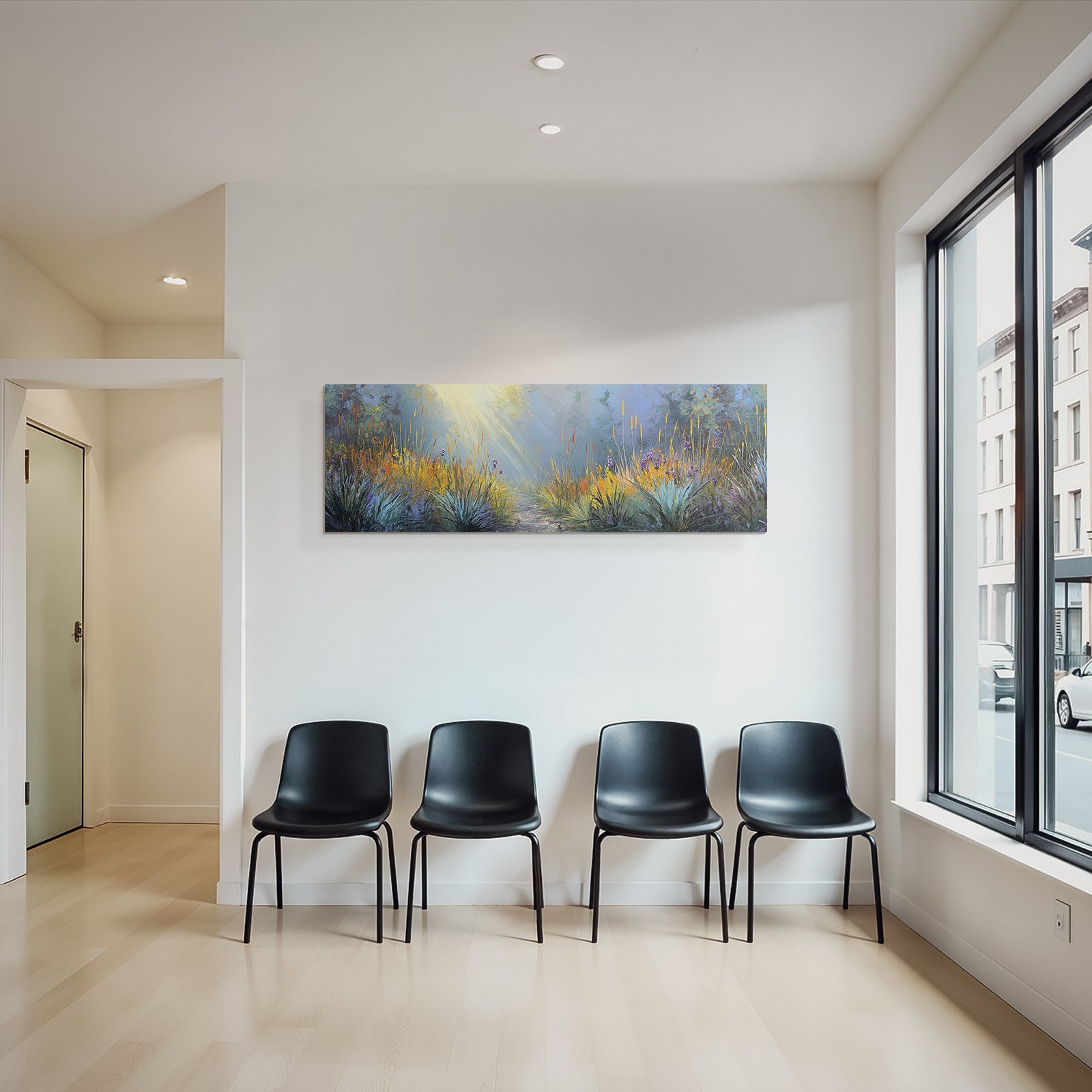 Ideal für Innenräume mit Stil: „Landschaft Mit Bunten Nebel Und Lichtstrahlen“ im Stil Rosen Tulpen Lavendel zieht im FameFrame die Blicke auf sich – egal ob Zuhause oder im Geschäft.