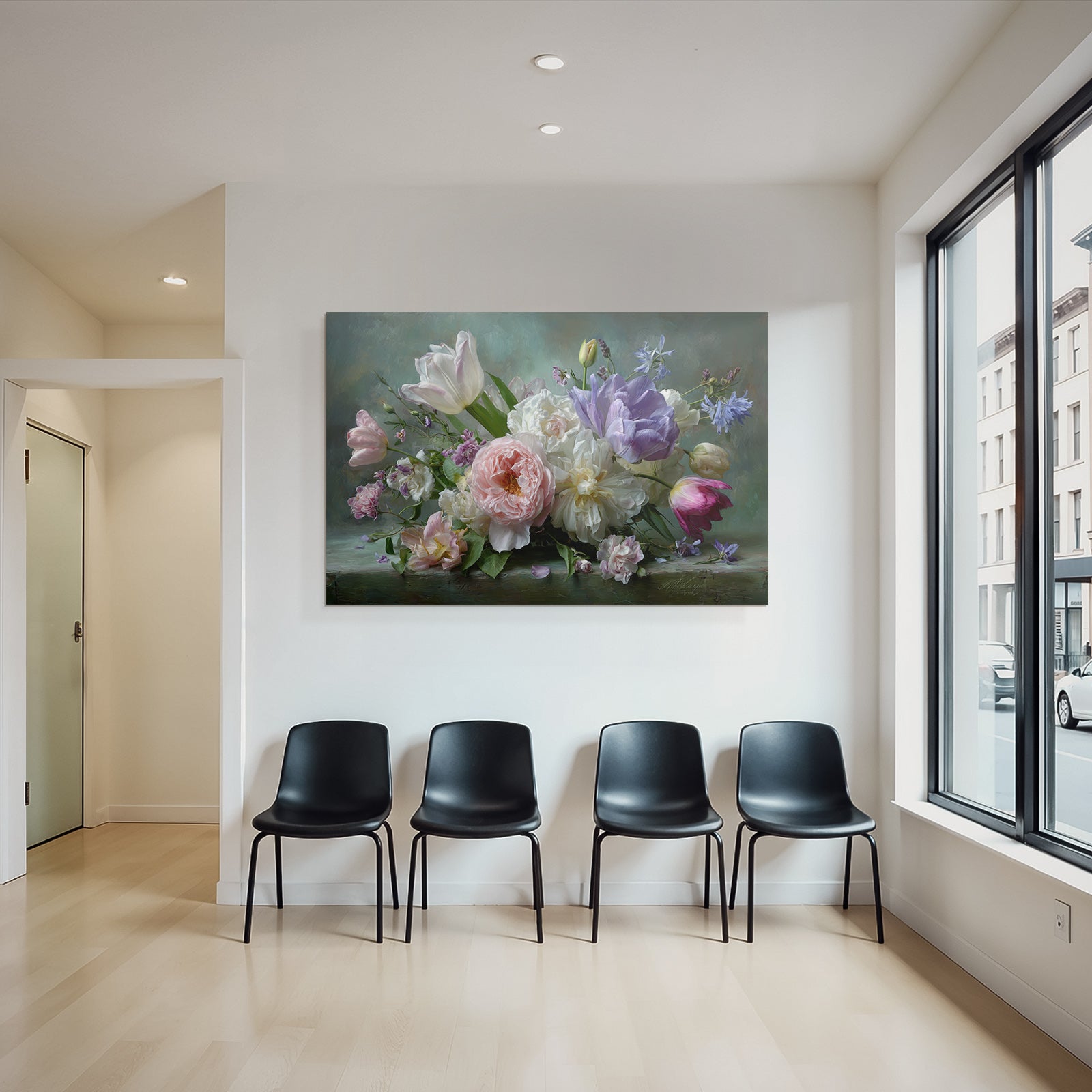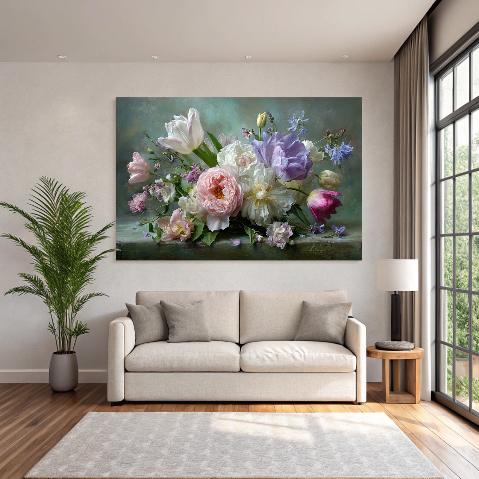 Verleihe Lobby, Wartezimmer oder Studio eine besondere Atmosphäre mit „Lebhafter Strauss Mit Pfingstrosen Und Tulpen“ im Stil Rosen Tulpen Lavendel – eindrucksvoll im FameFrame präsentiert.