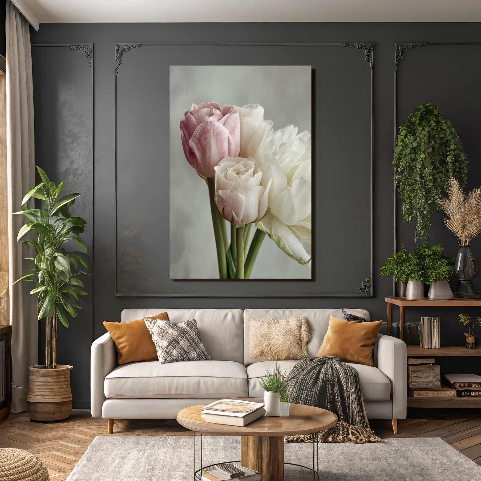 Erlebe Kunst im Stil Rosen Tulpen Lavendel neu: „Nahaufnahme Von Rosa Und Weisser Rose Mit Tulpen“ wird durch den eleganten FameFrame zum Blickfang in jedem Raum.