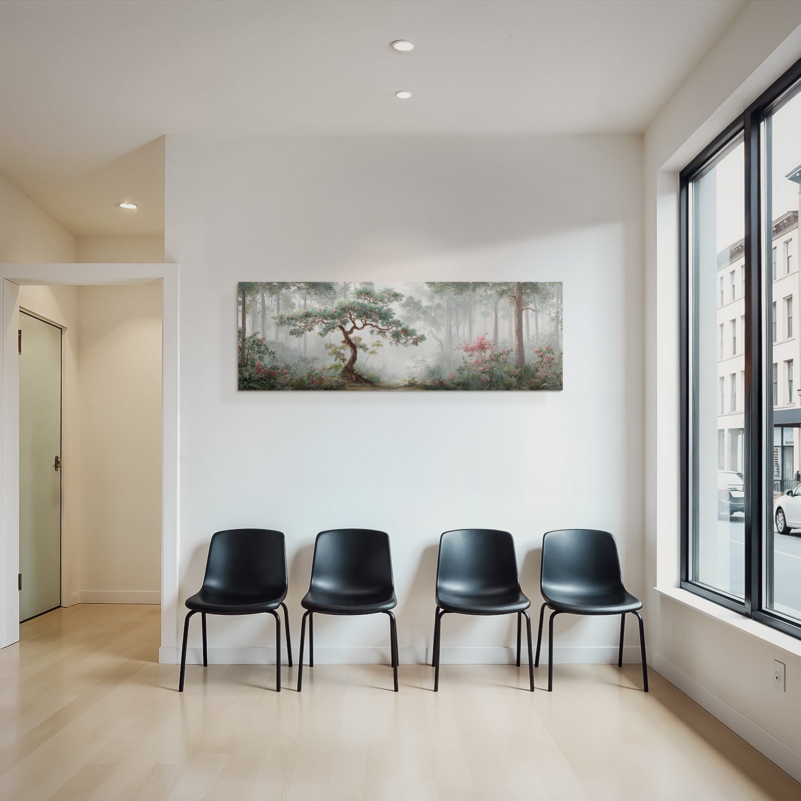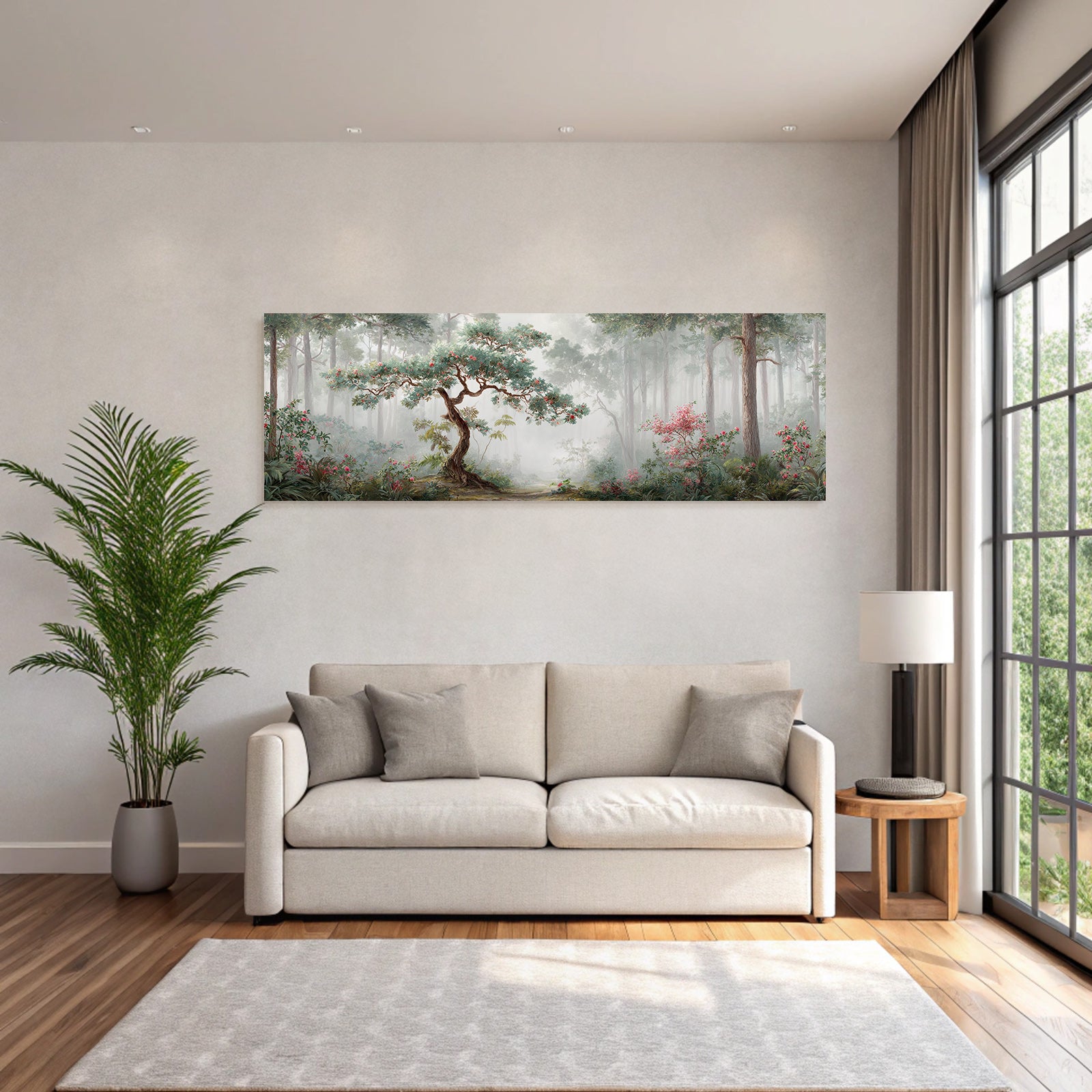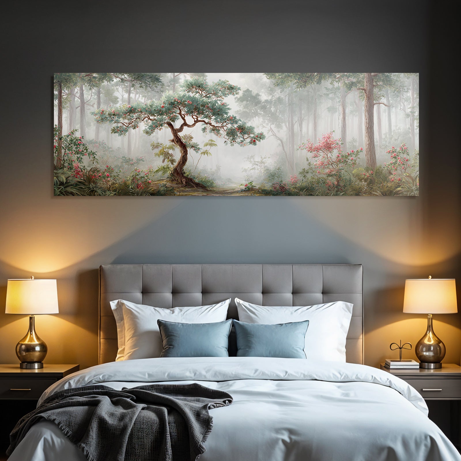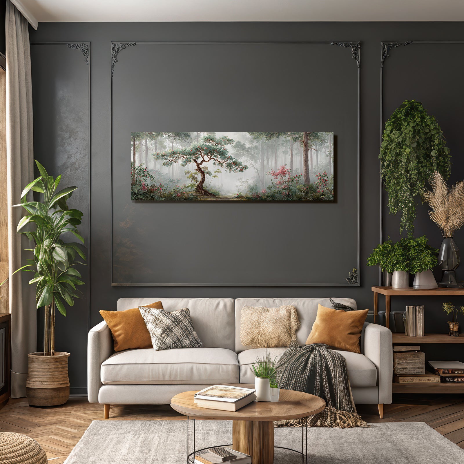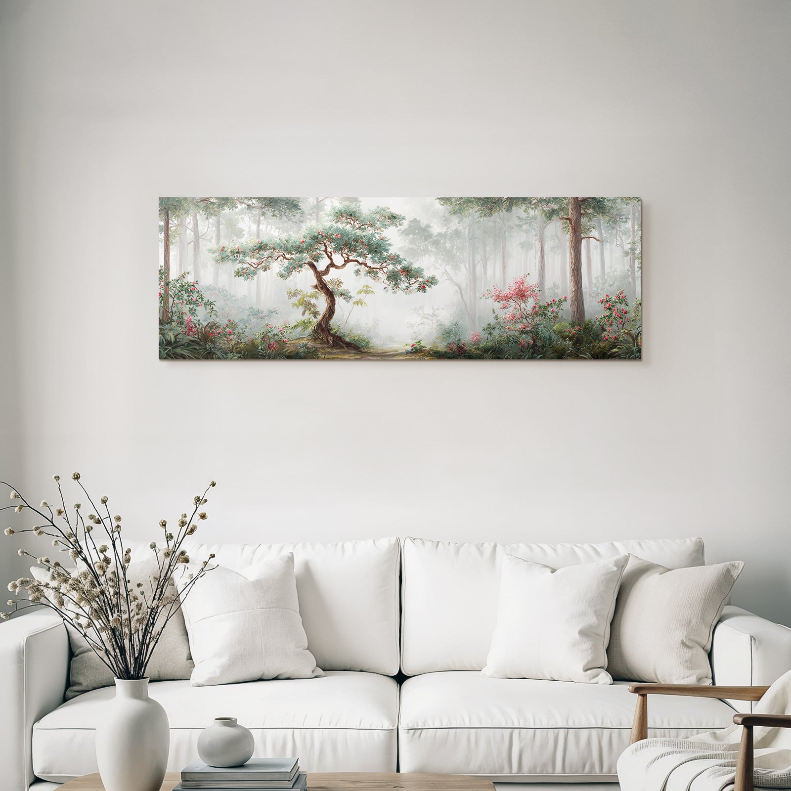 „Nebelwaldszene Mit Knorrigem Baum Und Pracht“ verbindet das Beste aus Rosen Tulpen Lavendel mit modernem Textildruck – edel präsentiert im hochwertigen FameFrame.