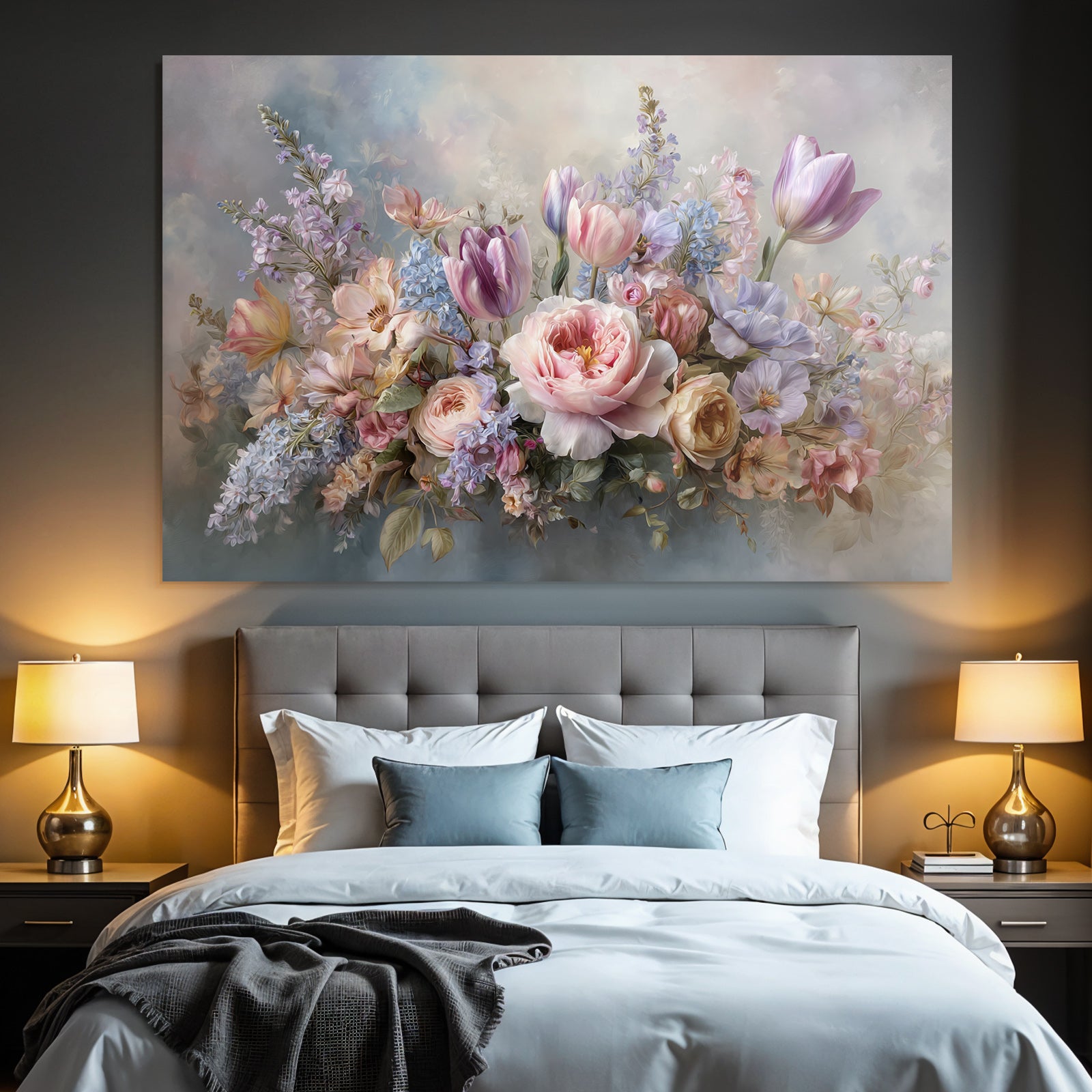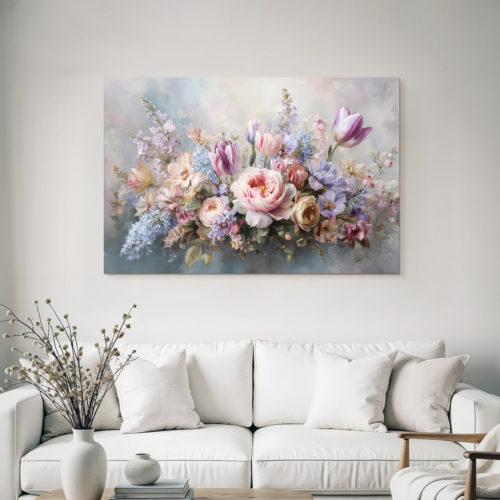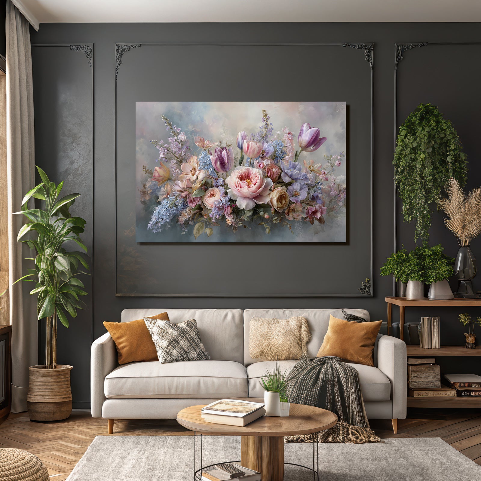 „Sanfte Komposition In Pastelltönen“ verleiht Ihrem Raum Charakter. Die Anlehnung an den Stil Rosen Tulpen Lavendel, kombiniert mit der schlichten Eleganz des FameFrame, schafft eine einzigartige Atmosphäre.