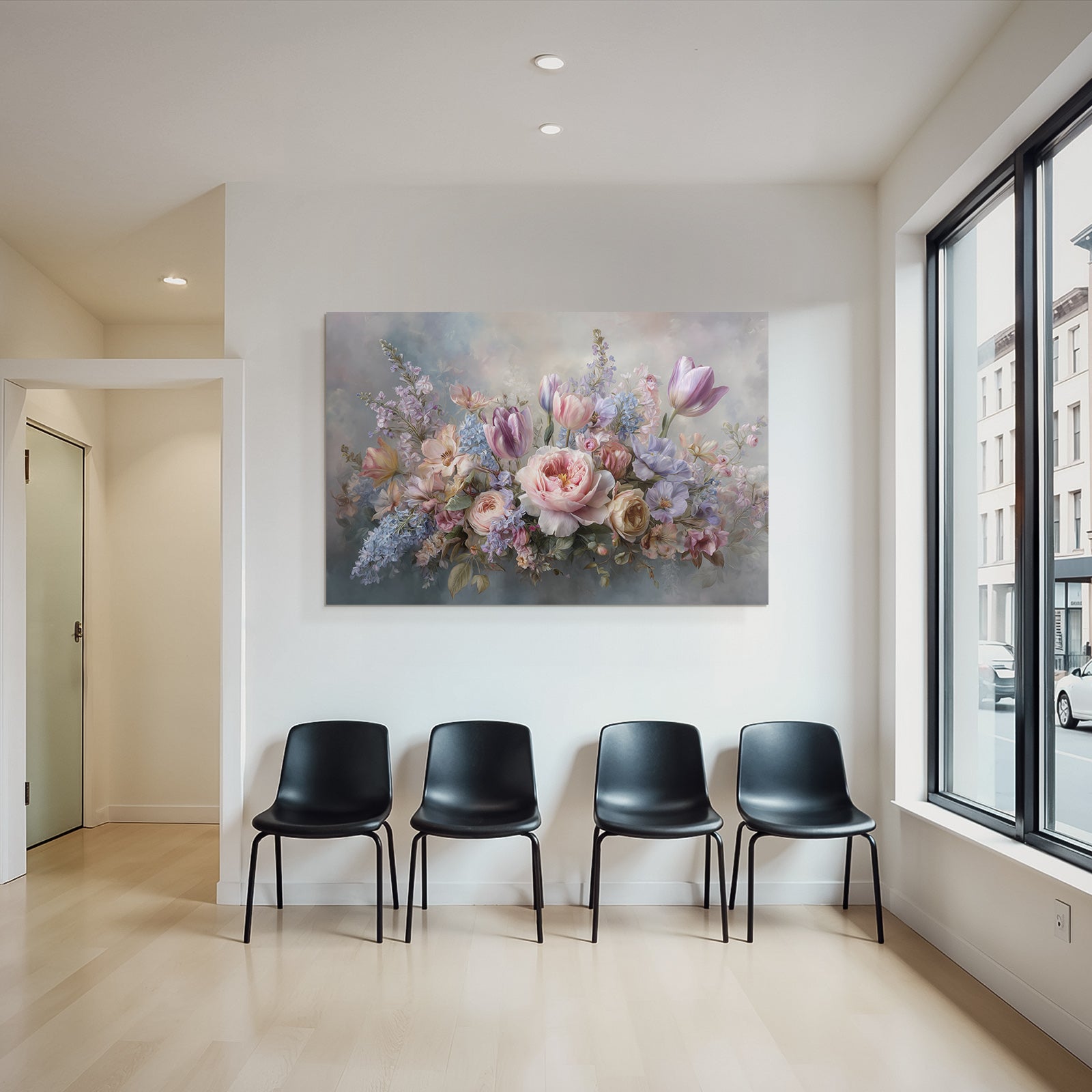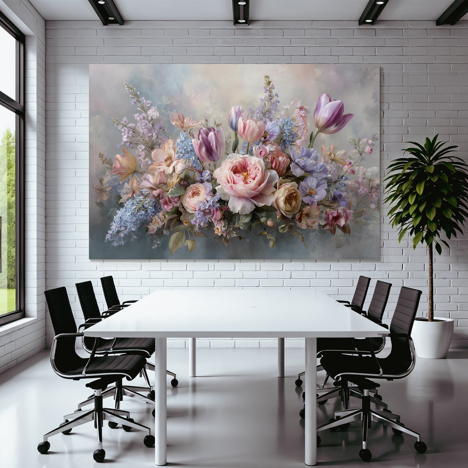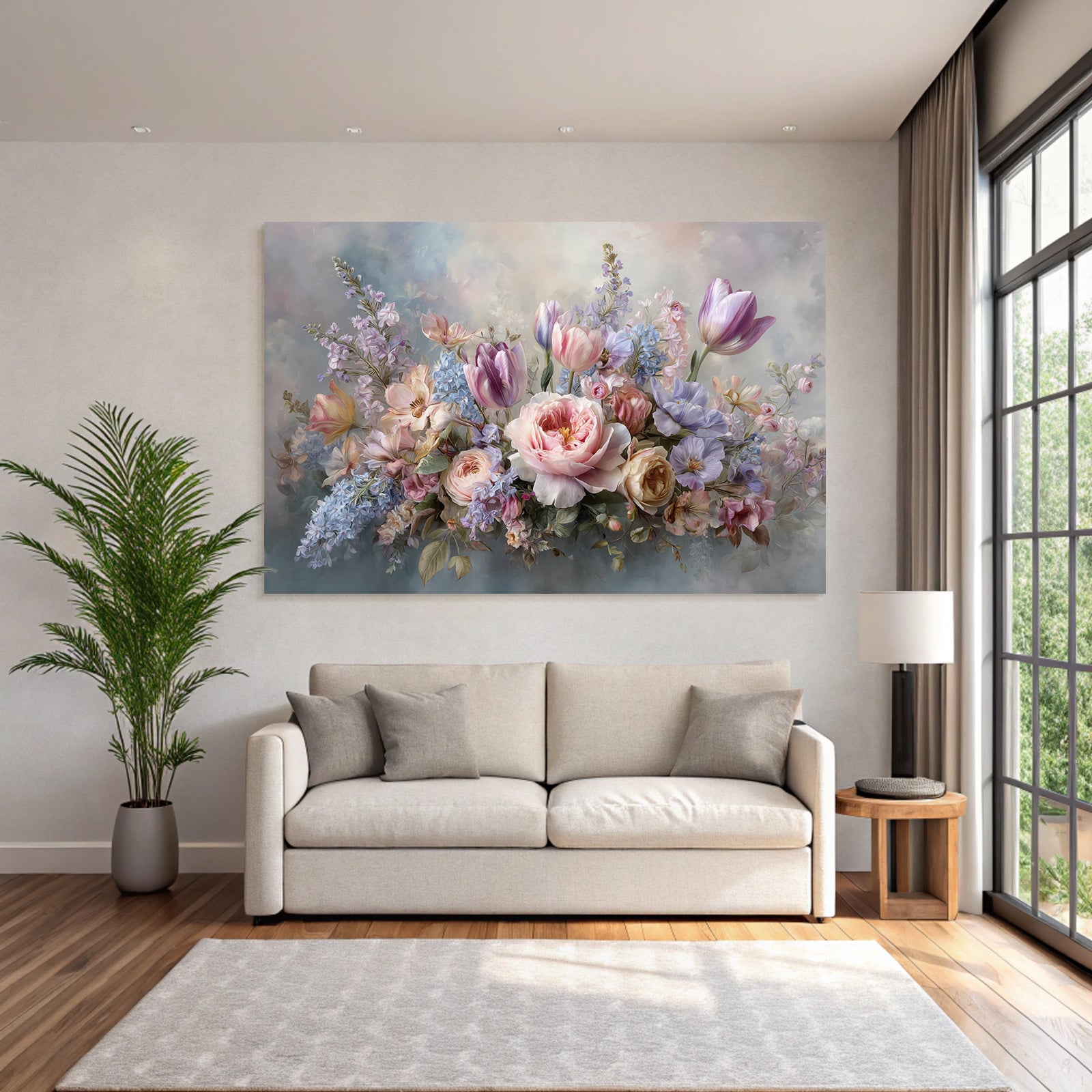 „Sanfte Komposition In Pastelltönen“ verleiht Ihrem Raum Charakter. Die Anlehnung an den Stil Rosen Tulpen Lavendel, kombiniert mit der schlichten Eleganz des FameFrame, schafft eine einzigartige Atmosphäre.