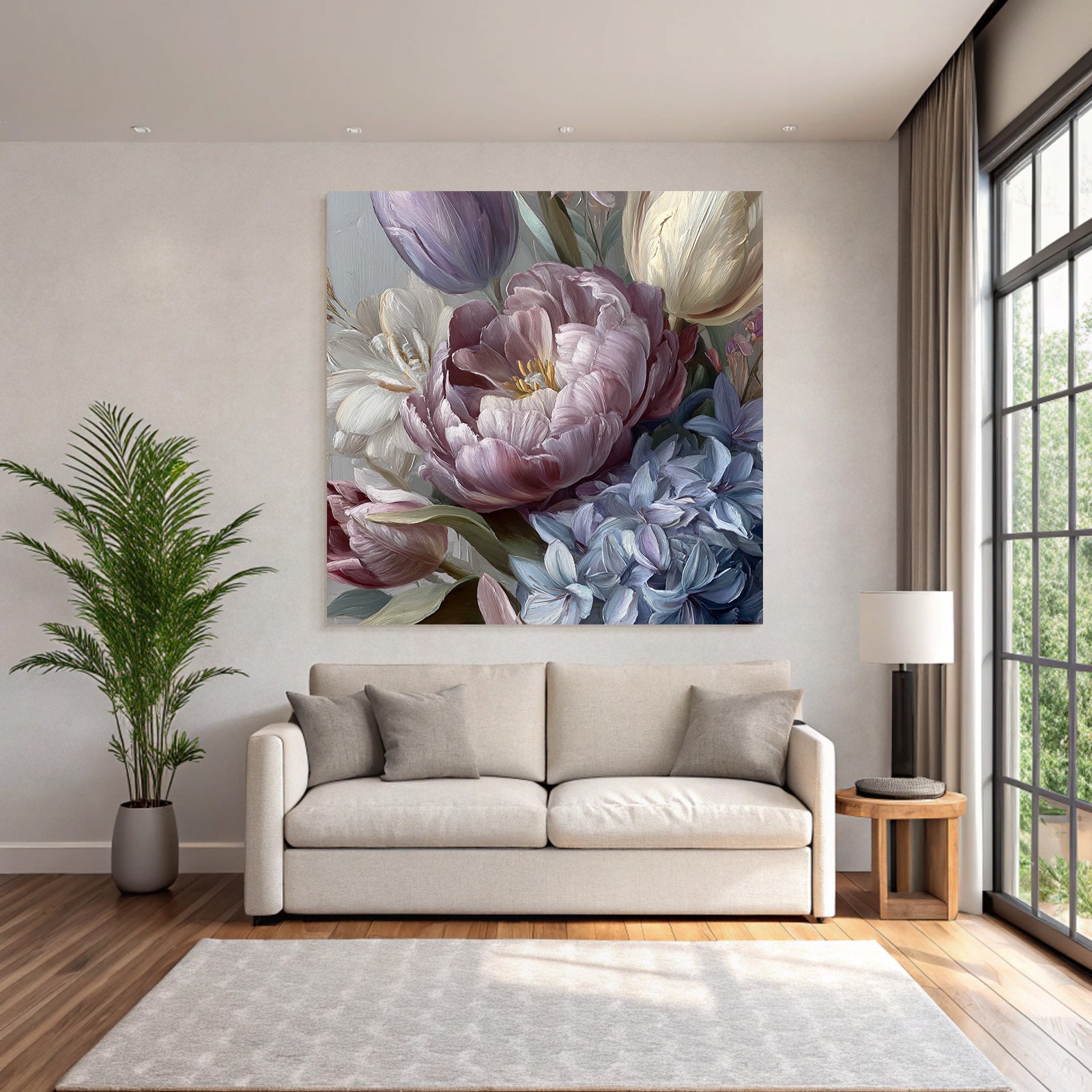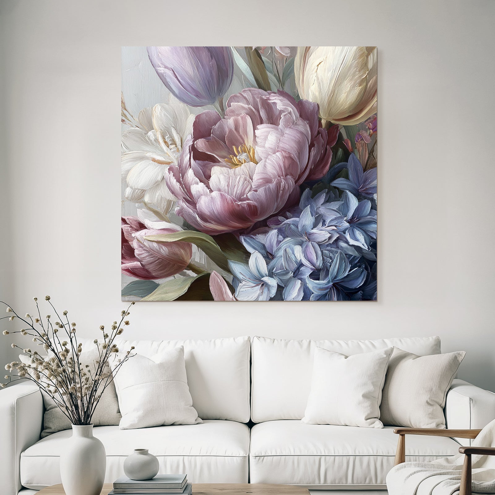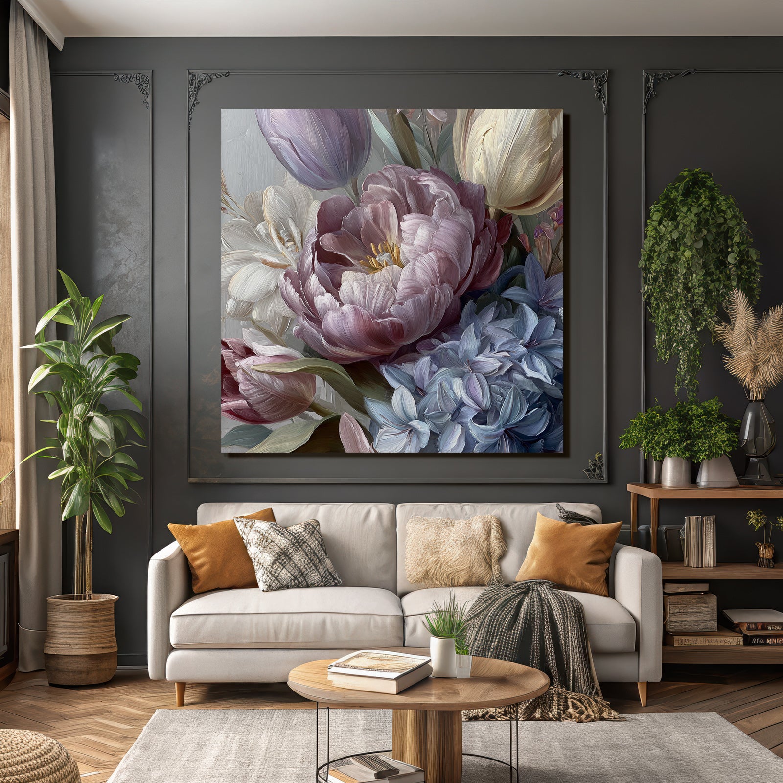 „Schöne Frühlings Mit Tulpen Und Pfingstrosen“ verbindet das Beste aus Rosen Tulpen Lavendel mit modernem Textildruck – edel präsentiert im hochwertigen FameFrame.
