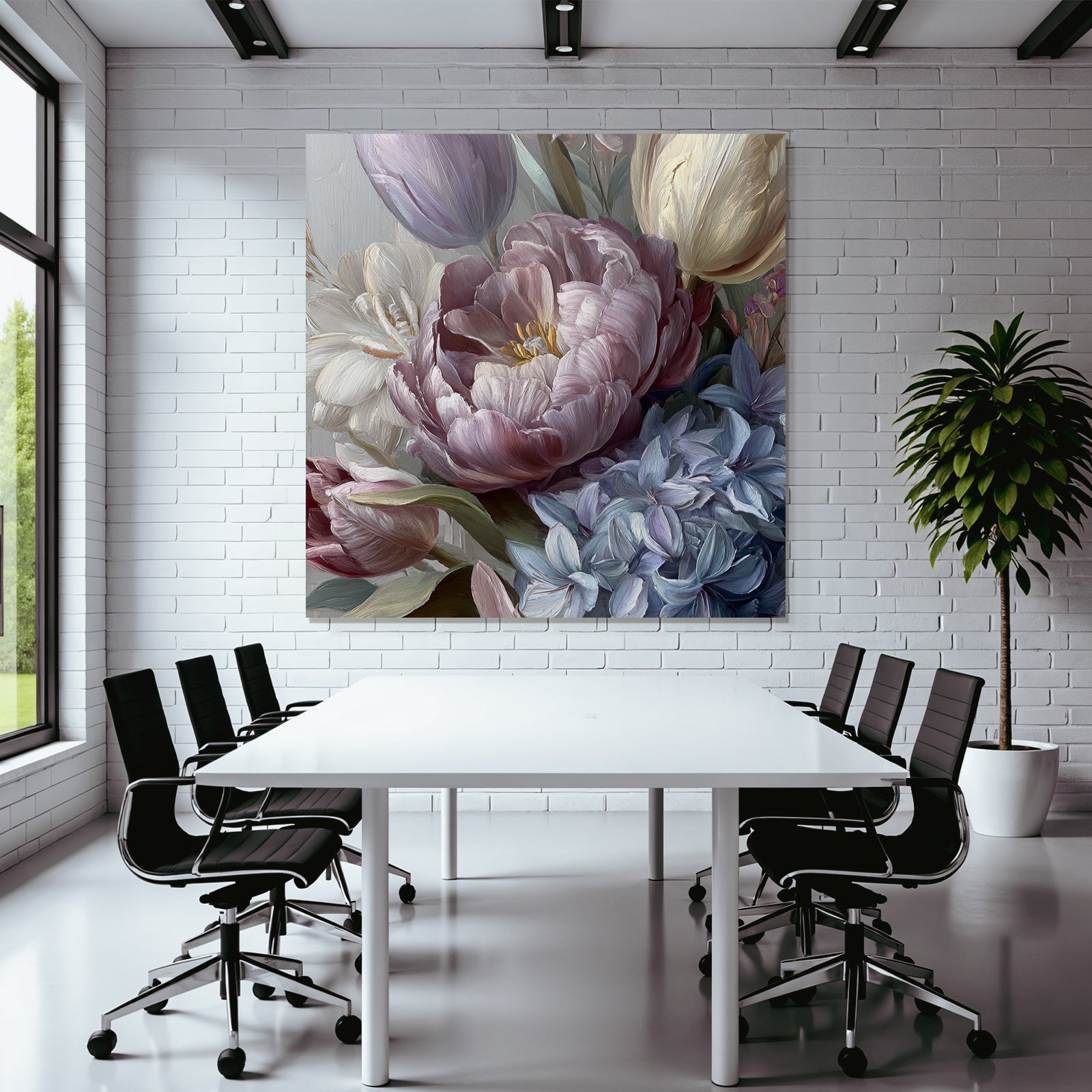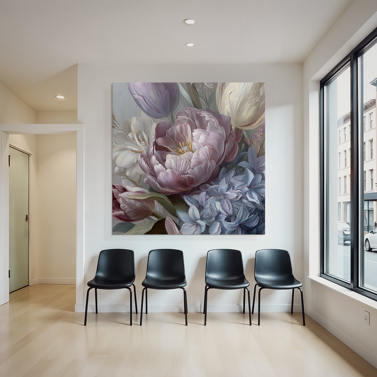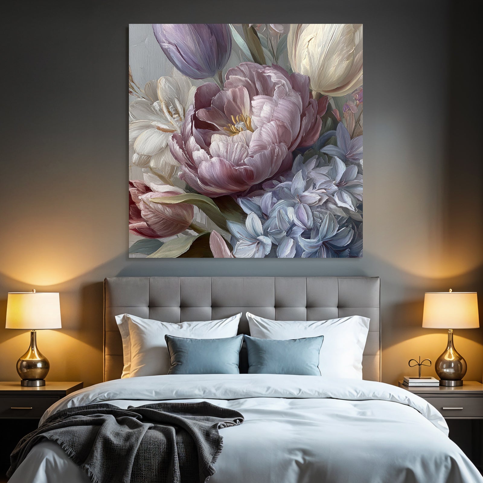 „Schöne Frühlings Mit Tulpen Und Pfingstrosen“ verbindet das Beste aus Rosen Tulpen Lavendel mit modernem Textildruck – edel präsentiert im hochwertigen FameFrame.