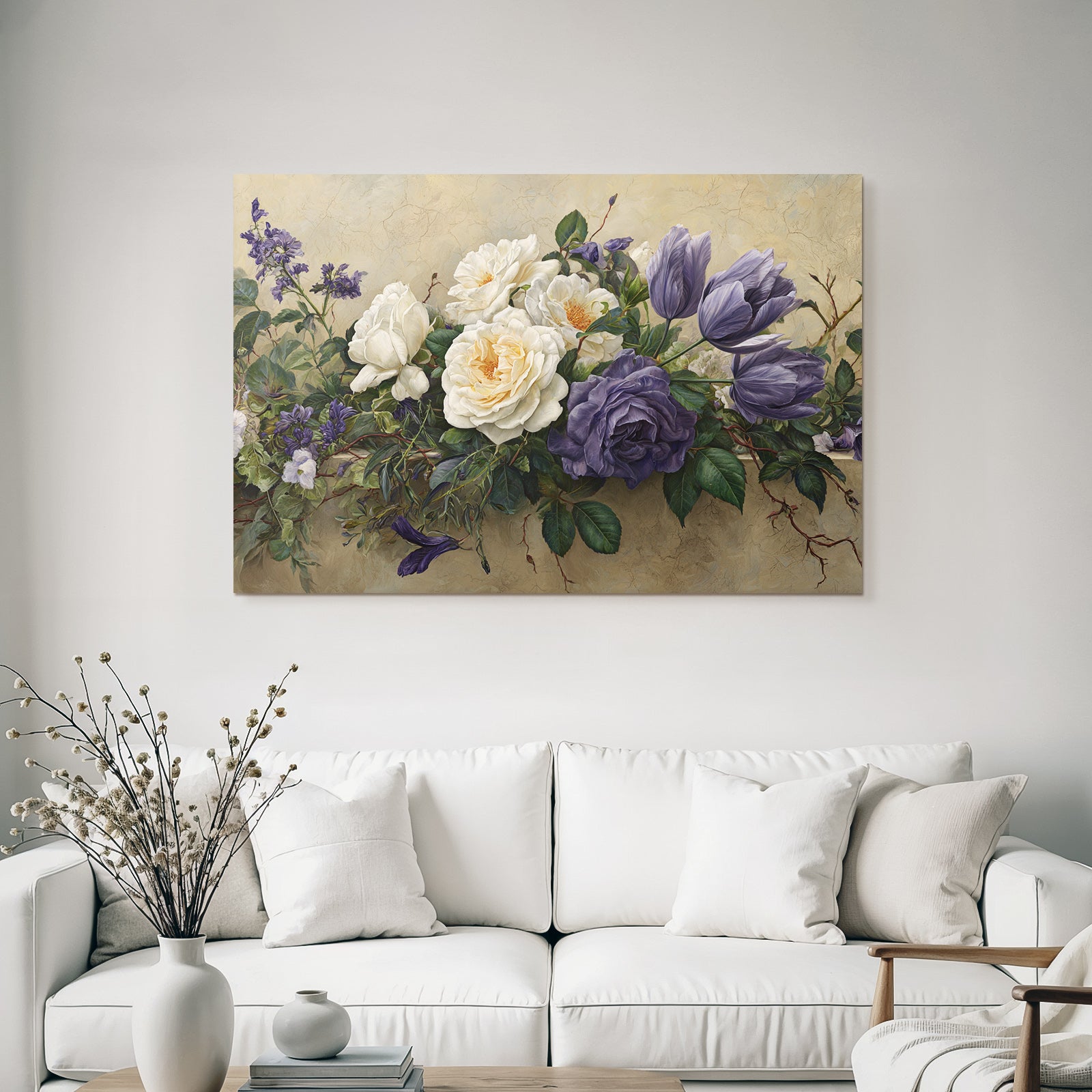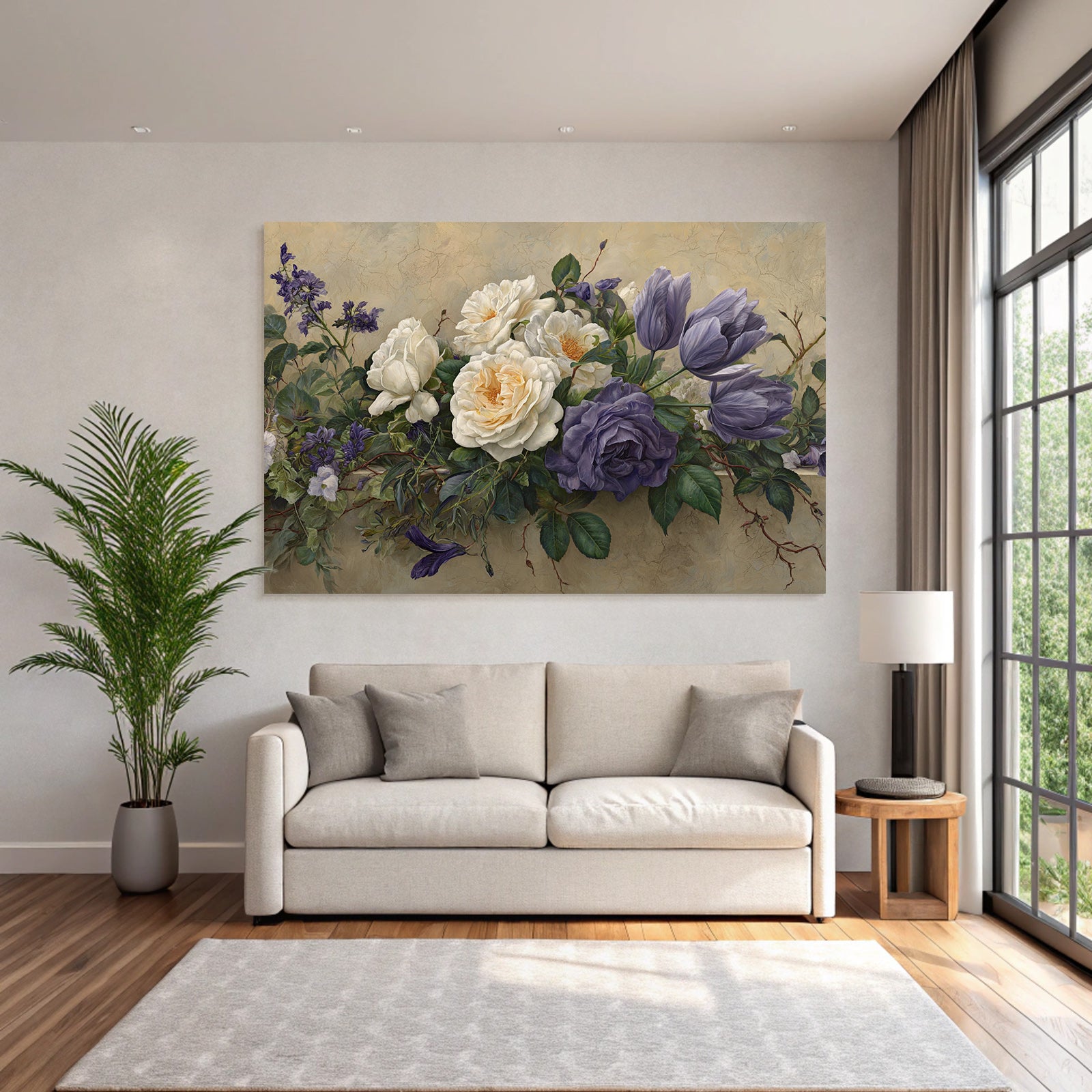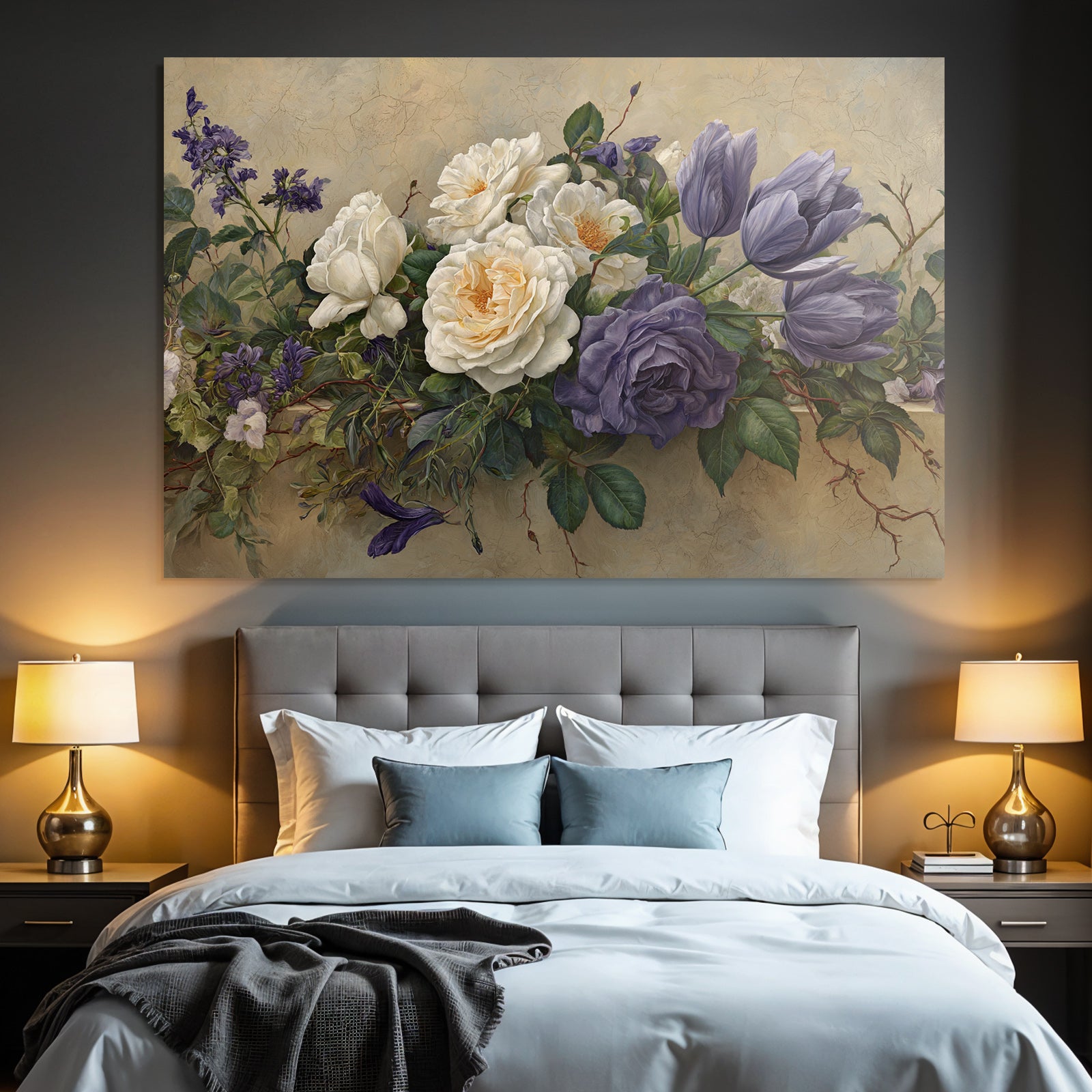 „Schöne Stillleben Mit Weissen Und Lila Rosen Und Grün“ bringt den Stil Rosen Tulpen Lavendel an Deine Wand – perfekt für Schlafzimmer, Homeoffice oder Besprechungsräume, edel gerahmt im FameFrame.
