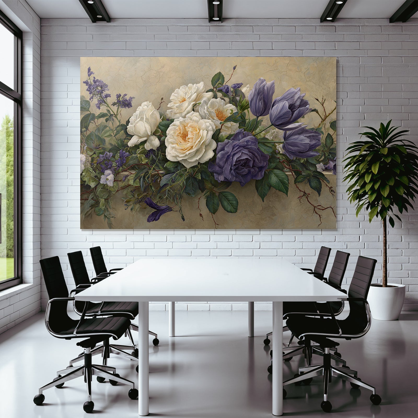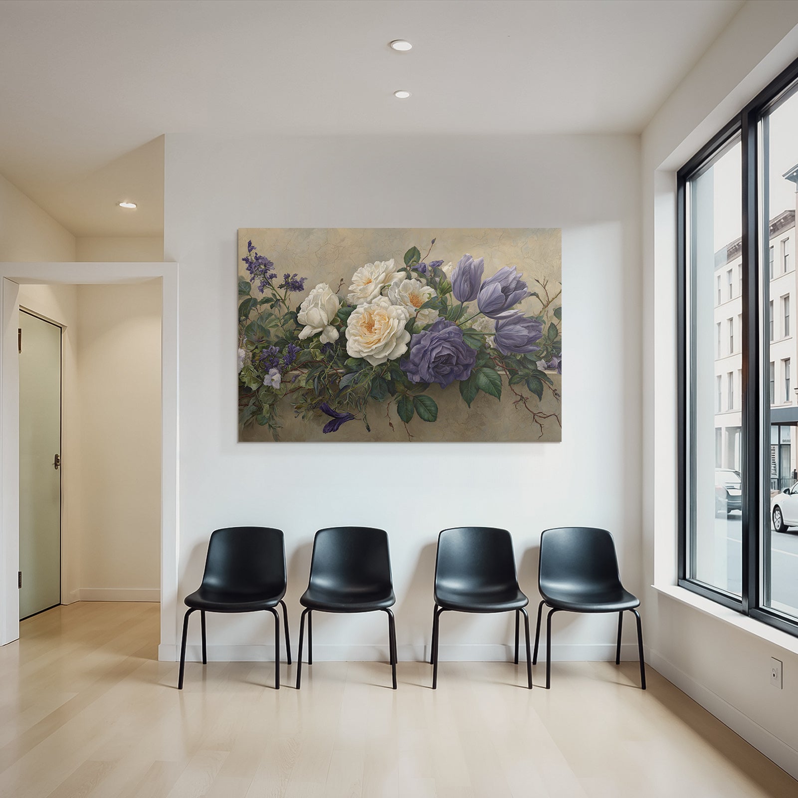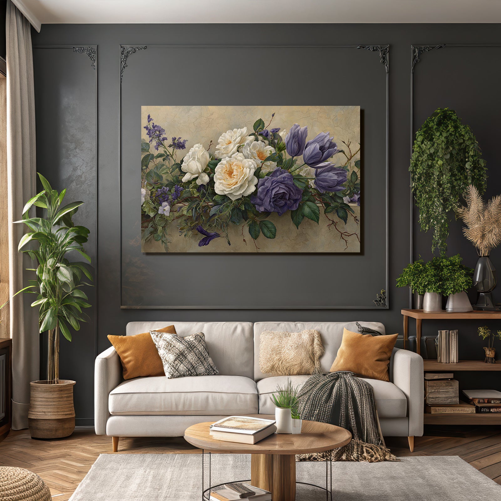 „Schöne Stillleben Mit Weissen Und Lila Rosen Und Grün“ bringt den Stil Rosen Tulpen Lavendel an Deine Wand – perfekt für Schlafzimmer, Homeoffice oder Besprechungsräume, edel gerahmt im FameFrame.