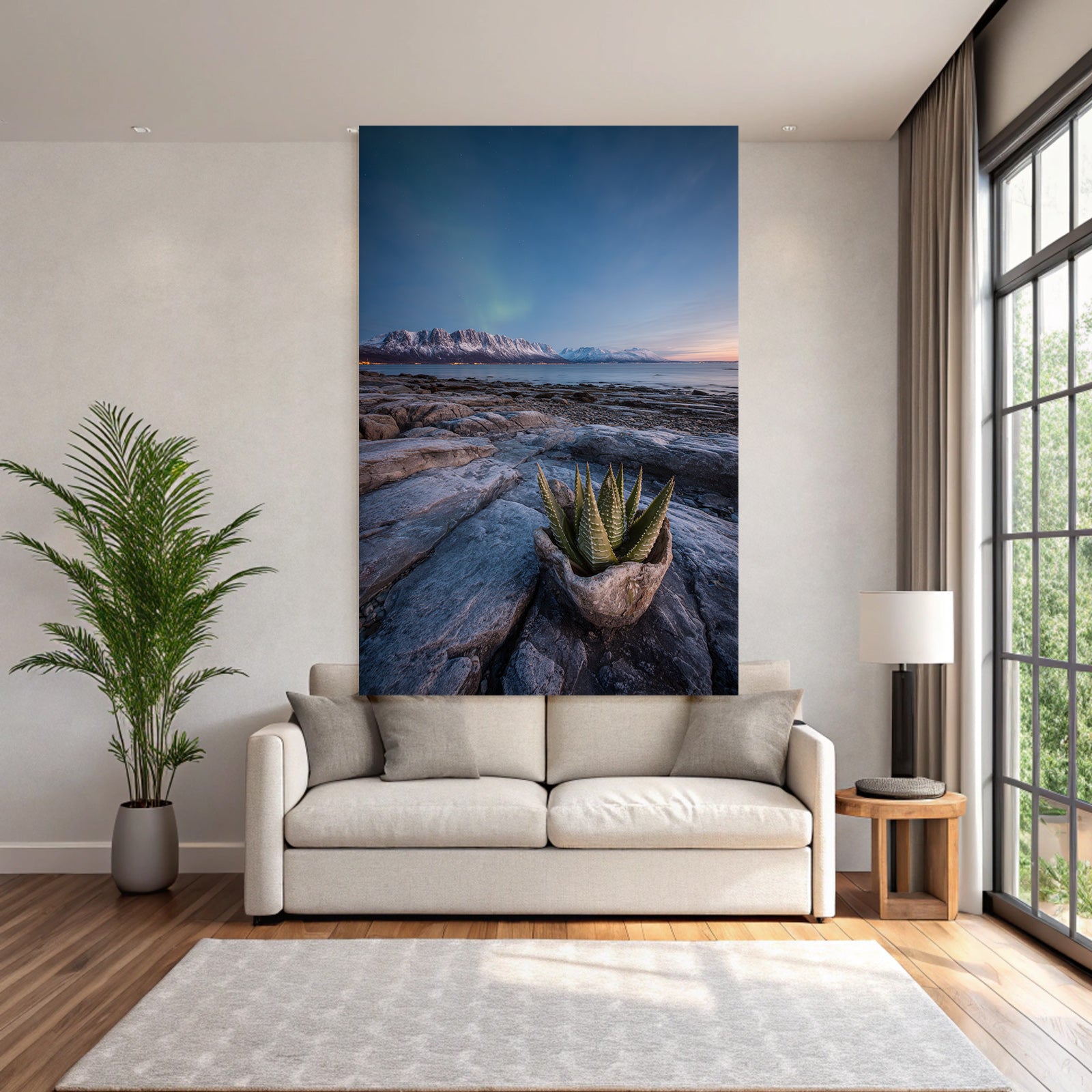 „Polarlicht Rockige Küste Mit Sukkulente Und Schneebedeckte Berge Bei Dämmerung“ im Stil Fjorde und Gletscher sorgt für stilvolle Ruhe im Schlafzimmer oder inspirierende Energie im Büro – perfekt im FameFrame™ inszeniert.