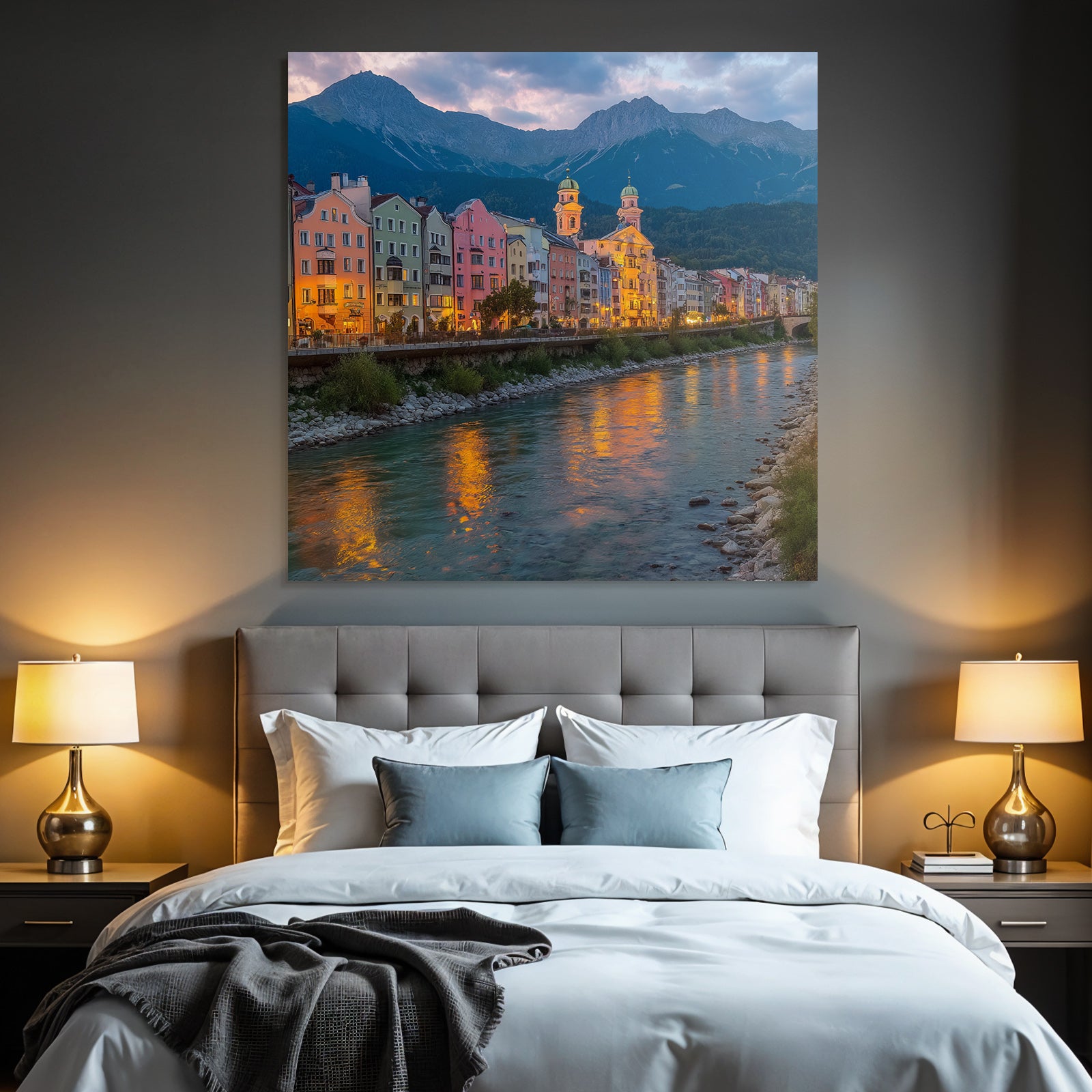 „Bunte Flussufer Stadtlandschaft Mit Bergen“ bringt den Stil Seen und Unterwasserwelten an Deine Wand – perfekt für Schlafzimmer, Homeoffice oder Besprechungsräume, edel gerahmt im FameFrame™.
