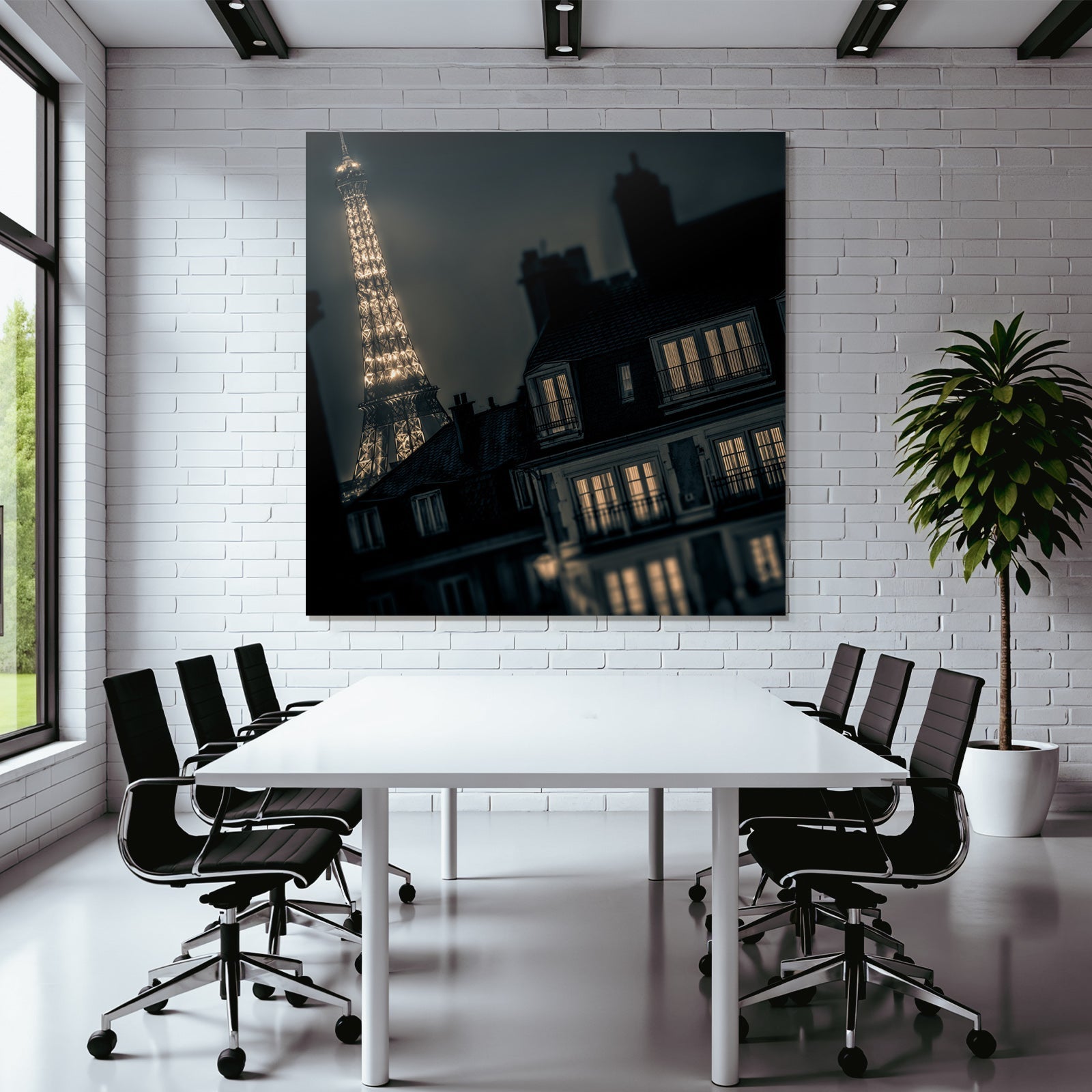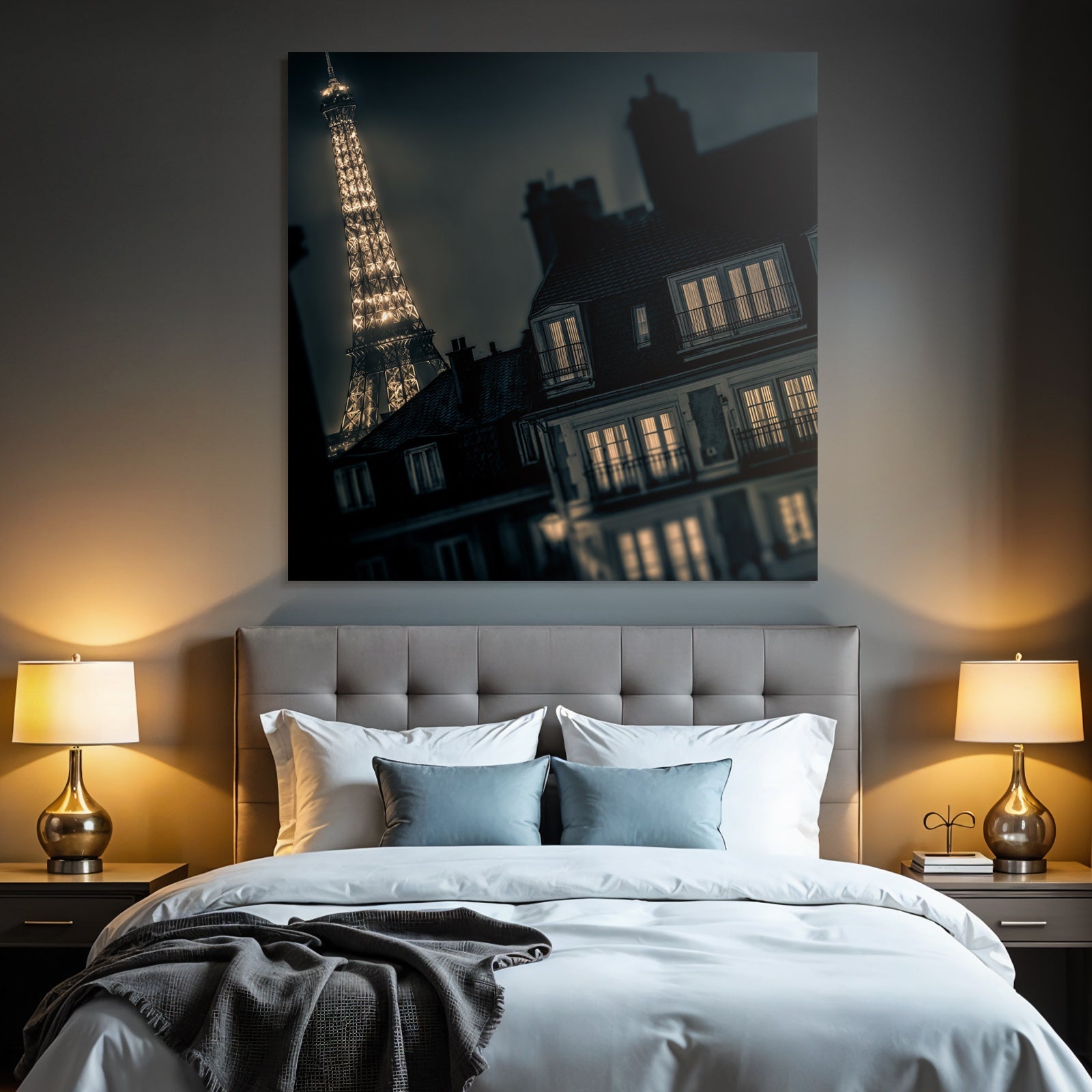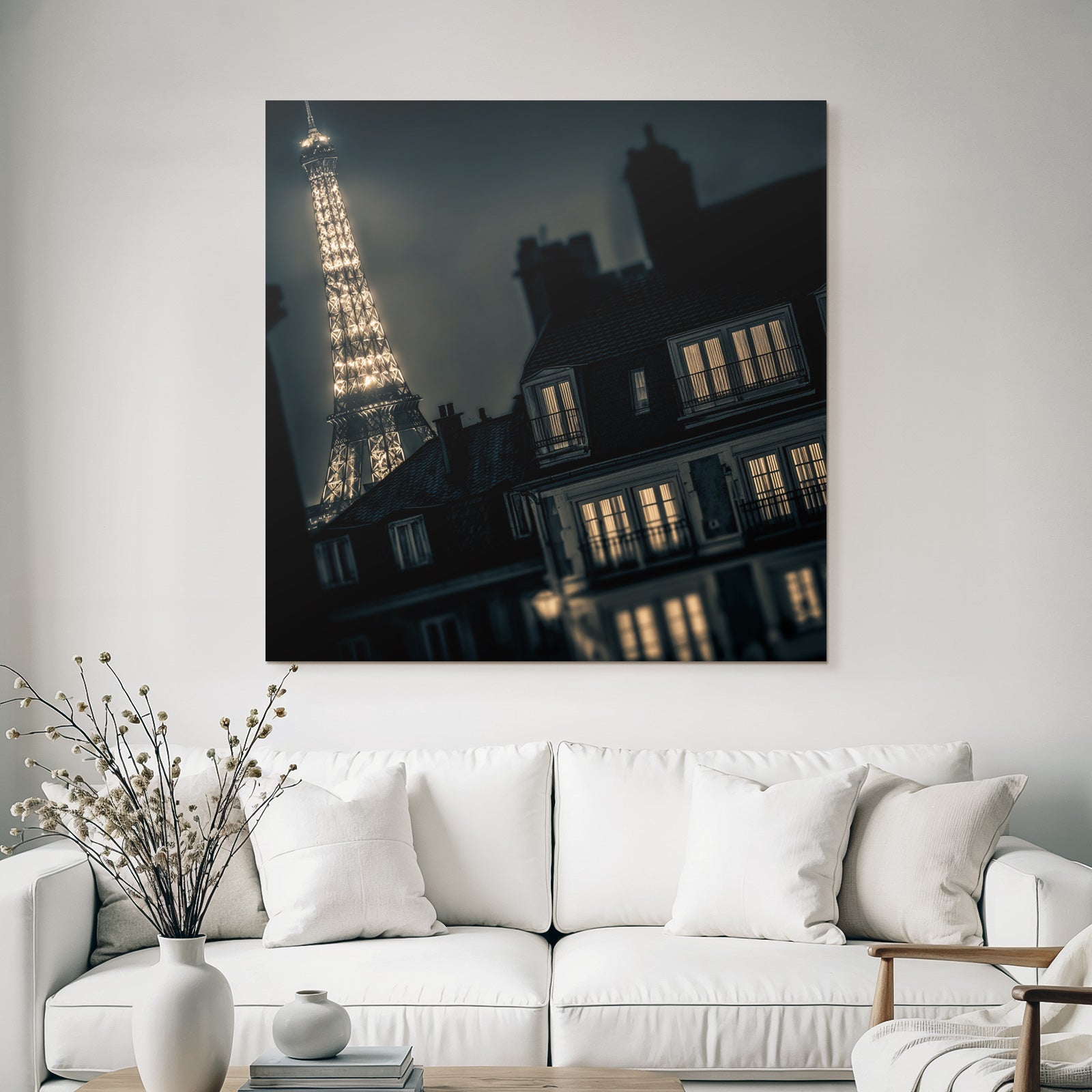 Setze Akzente im Esszimmer, Salon oder Praxisraum mit dem Kunstwerk „Nachtszene Eiffelturm Beleuchtete Fenster“ im Stil Staedtekunst – gespannt im edlen FameFrame.