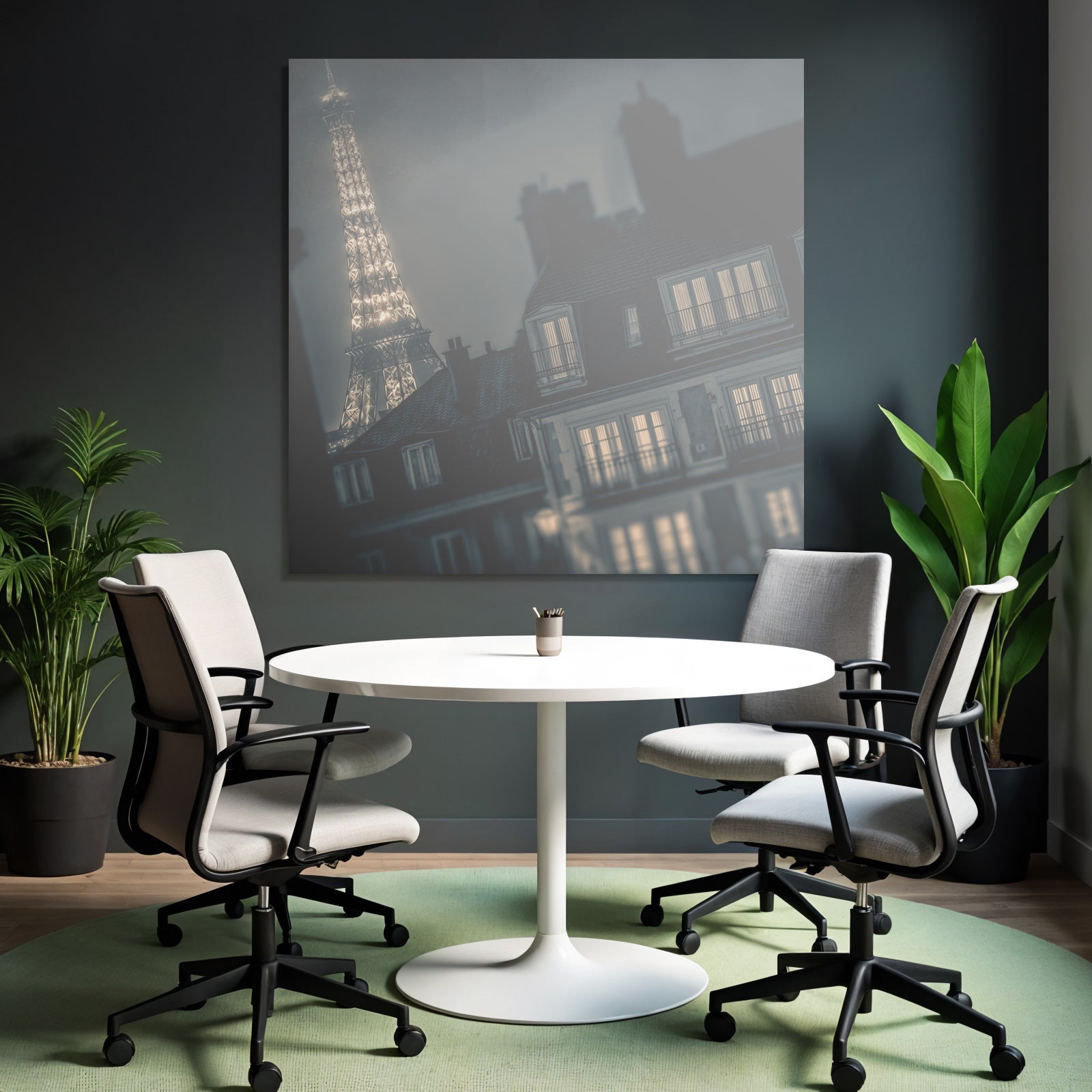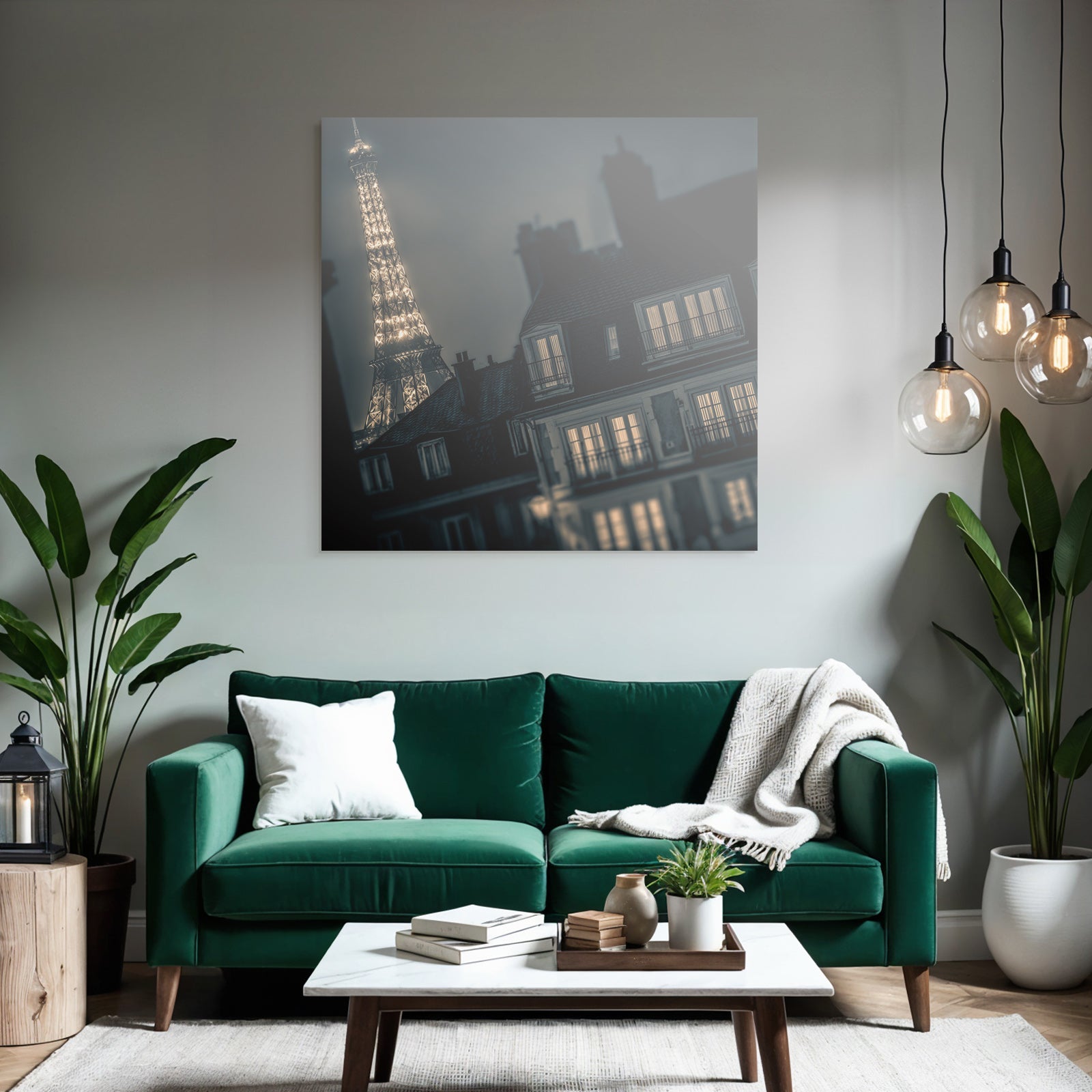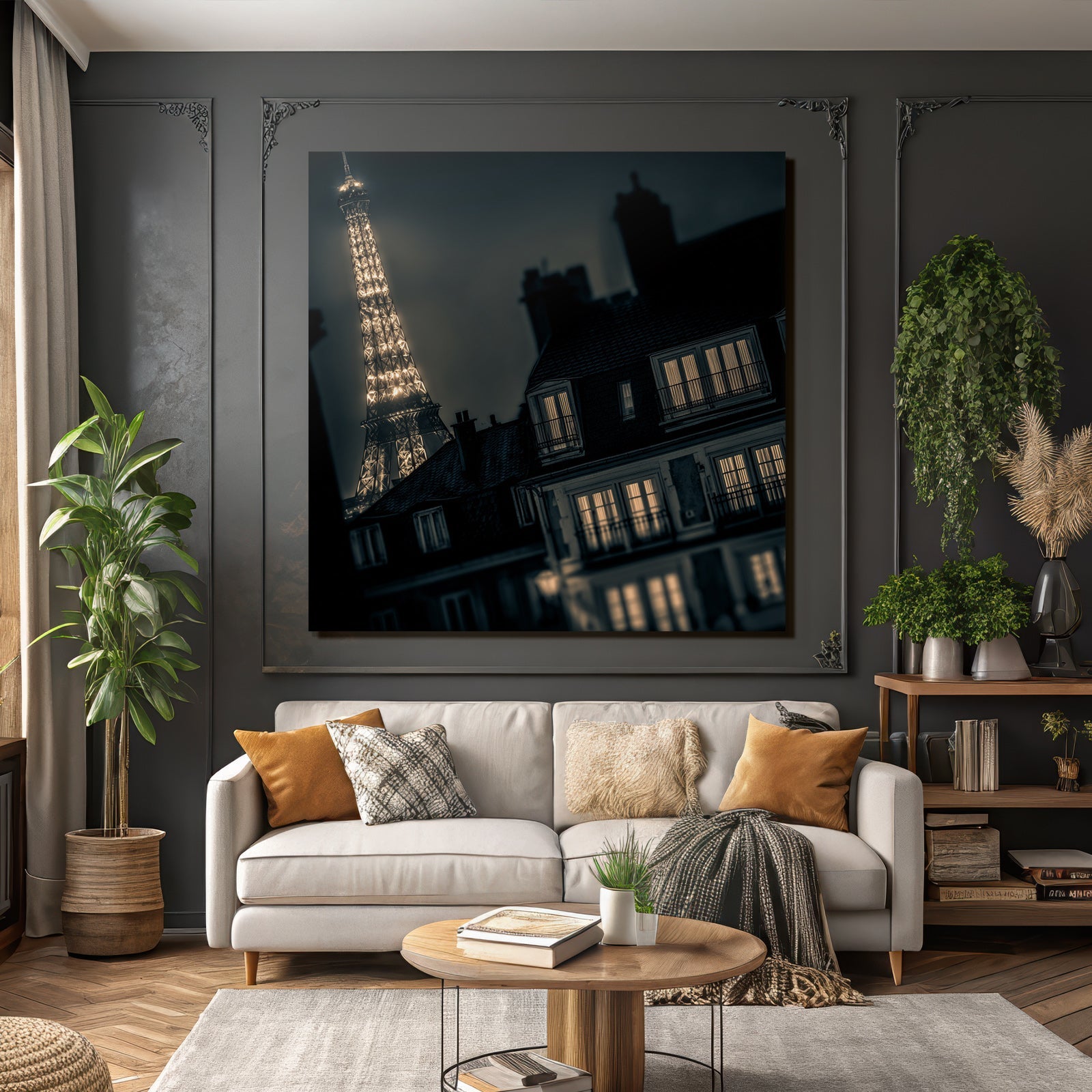 Setze Akzente im Esszimmer, Salon oder Praxisraum mit dem Kunstwerk „Nachtszene Eiffelturm Beleuchtete Fenster“ im Stil Staedtekunst – gespannt im edlen FameFrame.