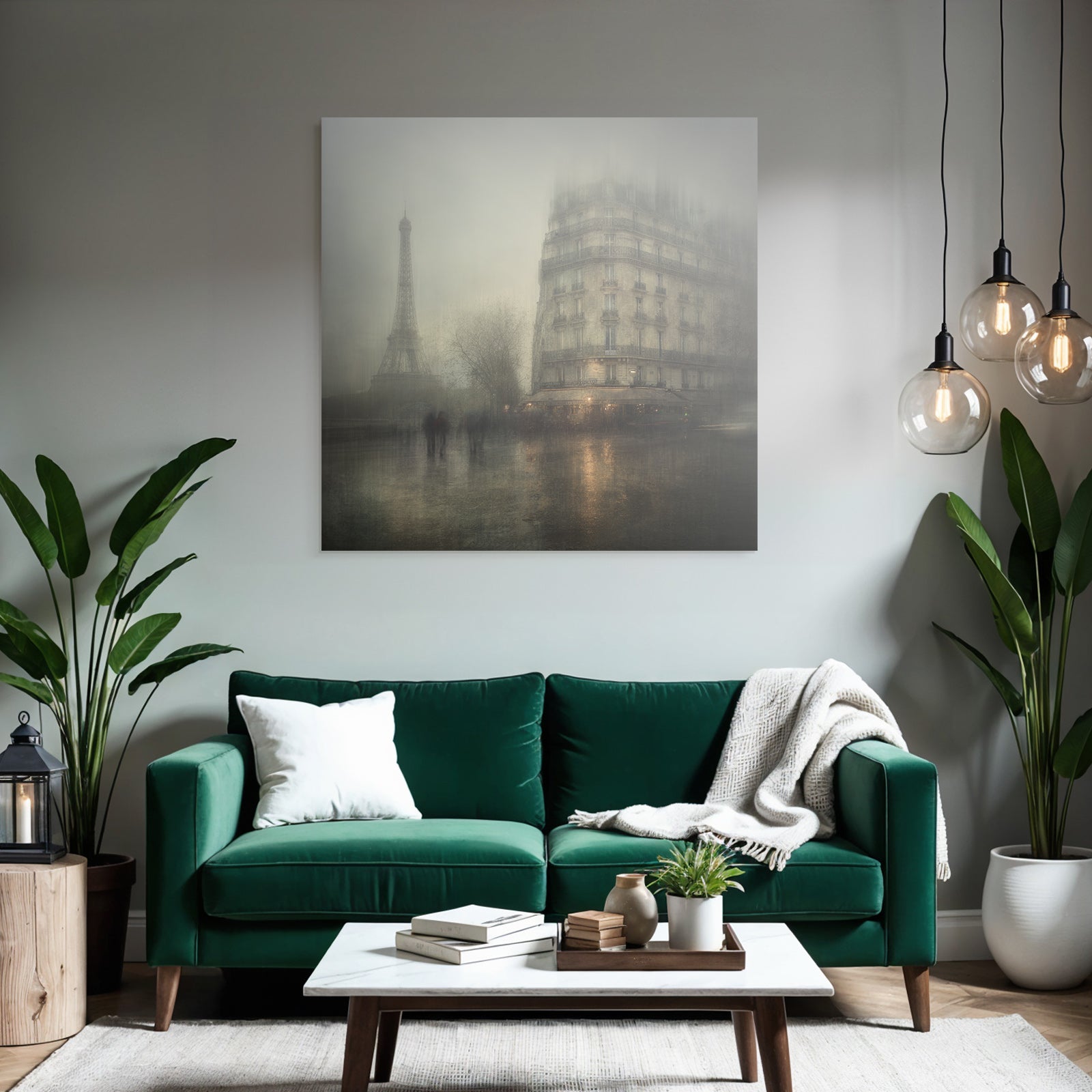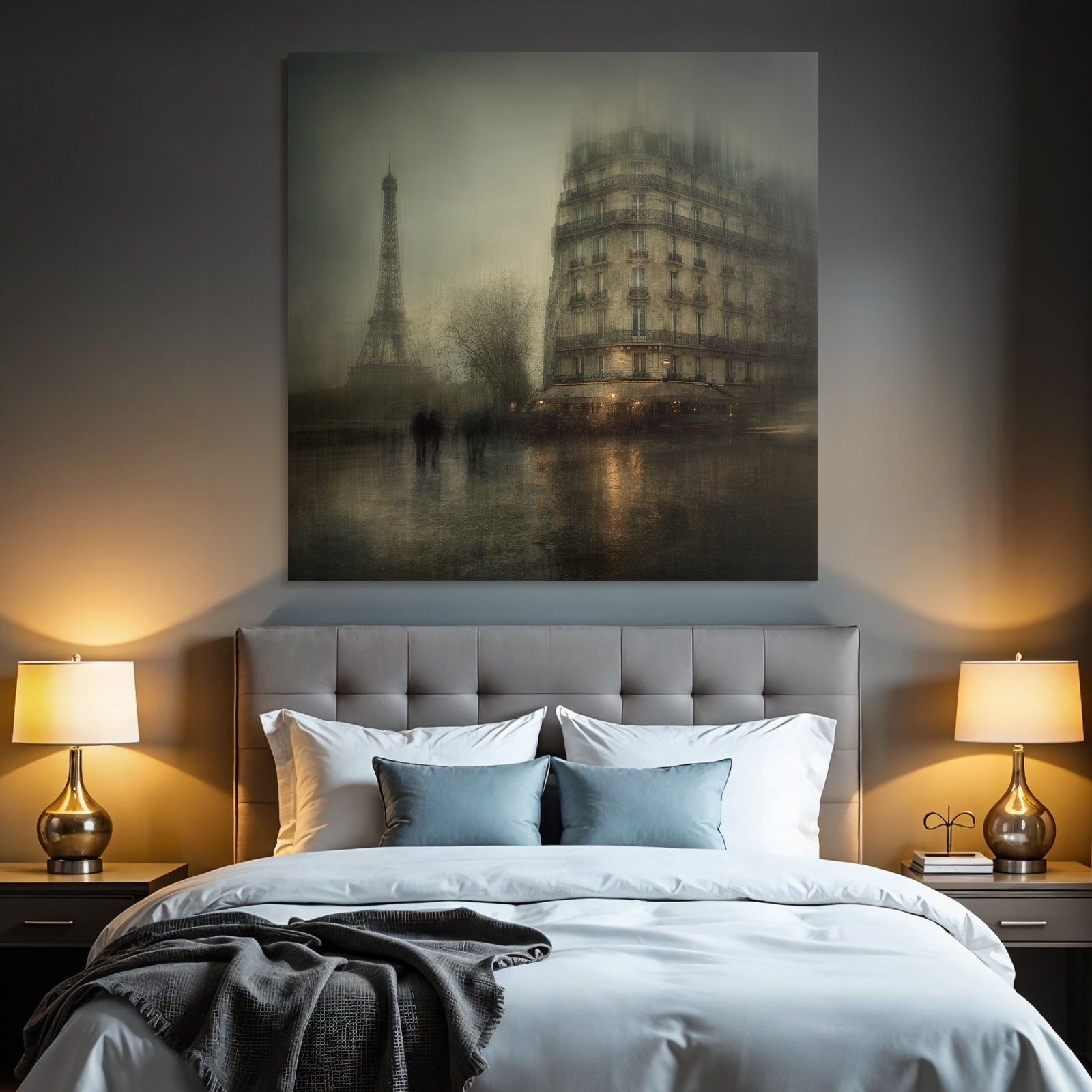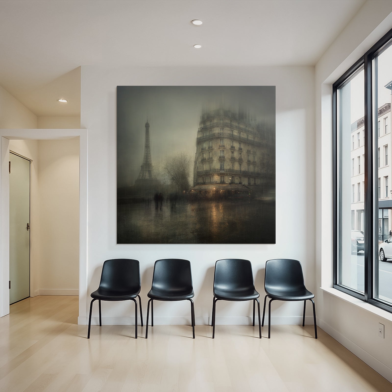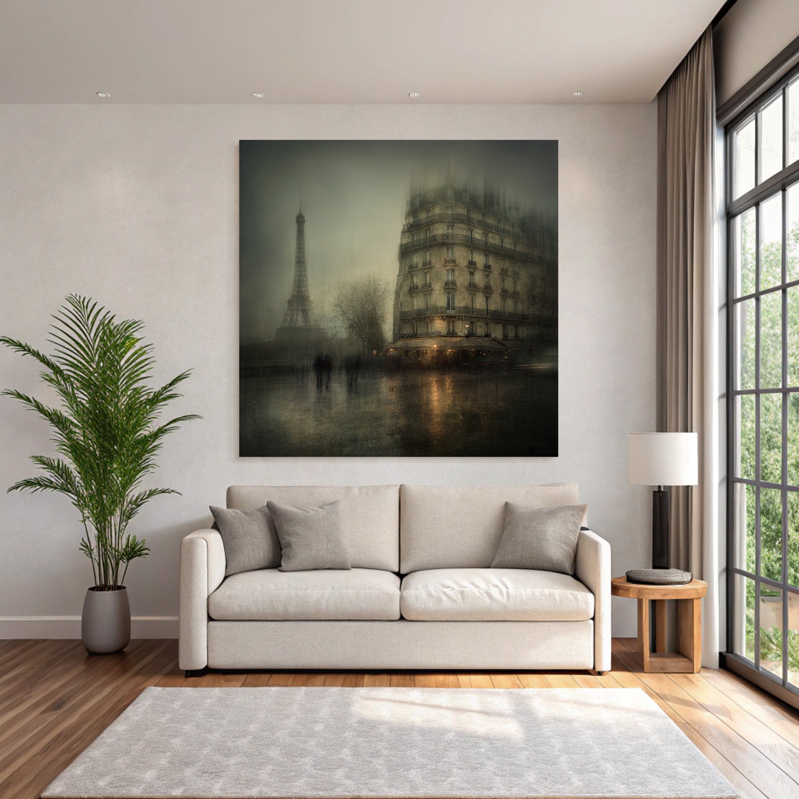 Ein Highlight für Wohnzimmer, Studio oder Empfangsbereich: „Nebliger Regenabend Am Eiffelturm“ bringt den Stil Staedtekunst auf Stoff – gespannt im edlen FameFrame.