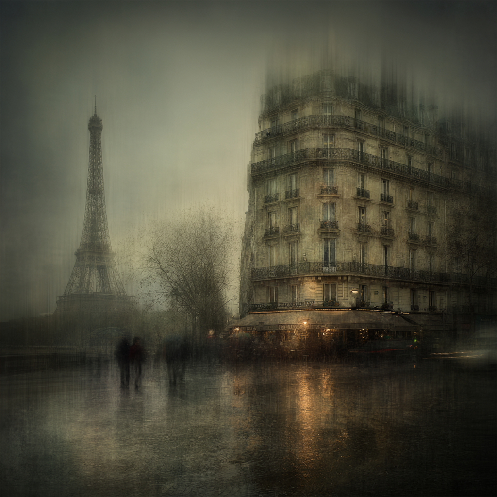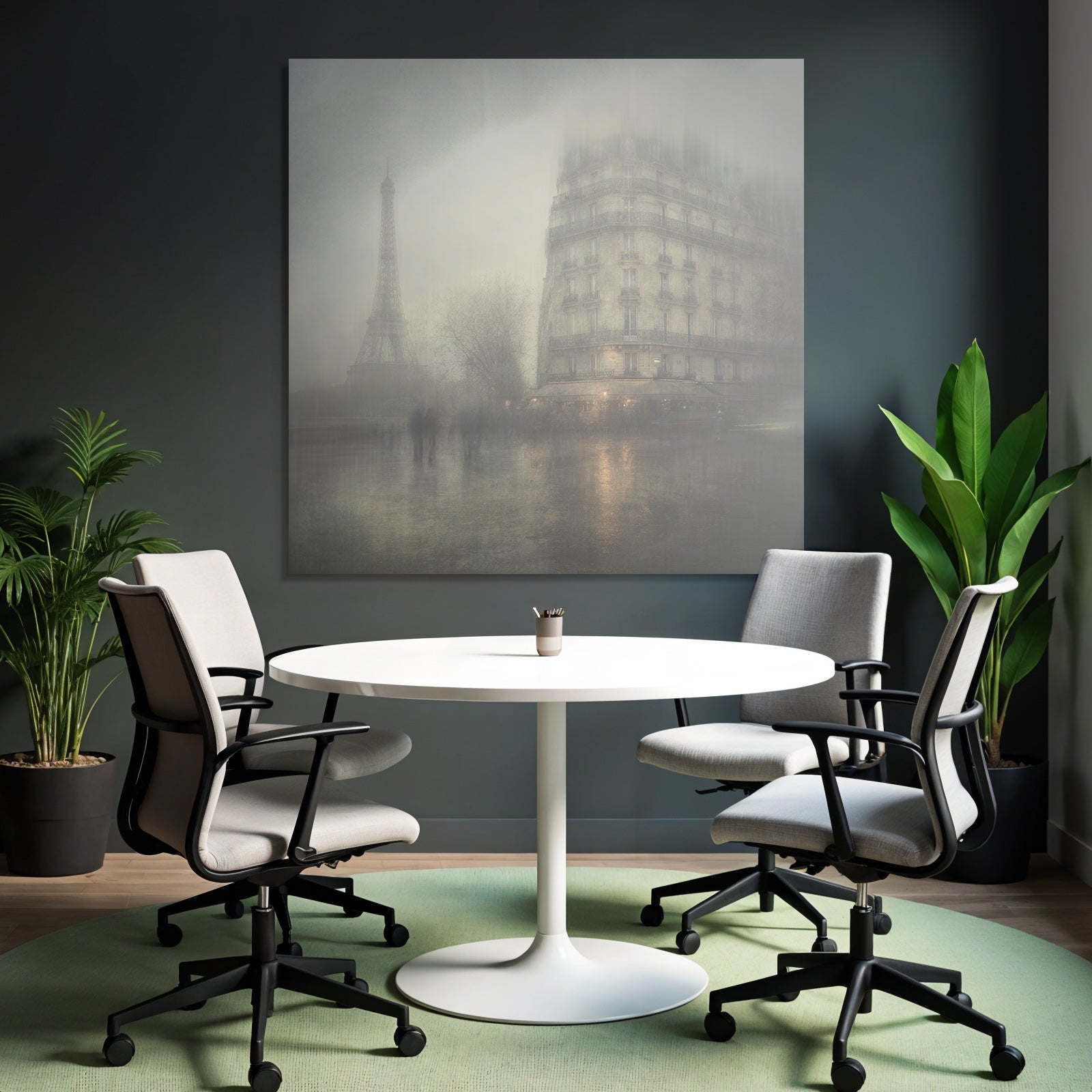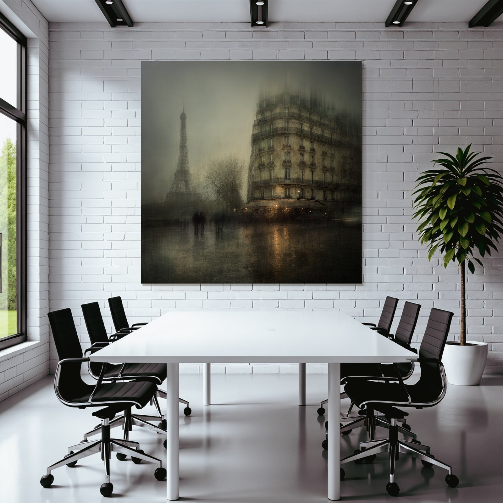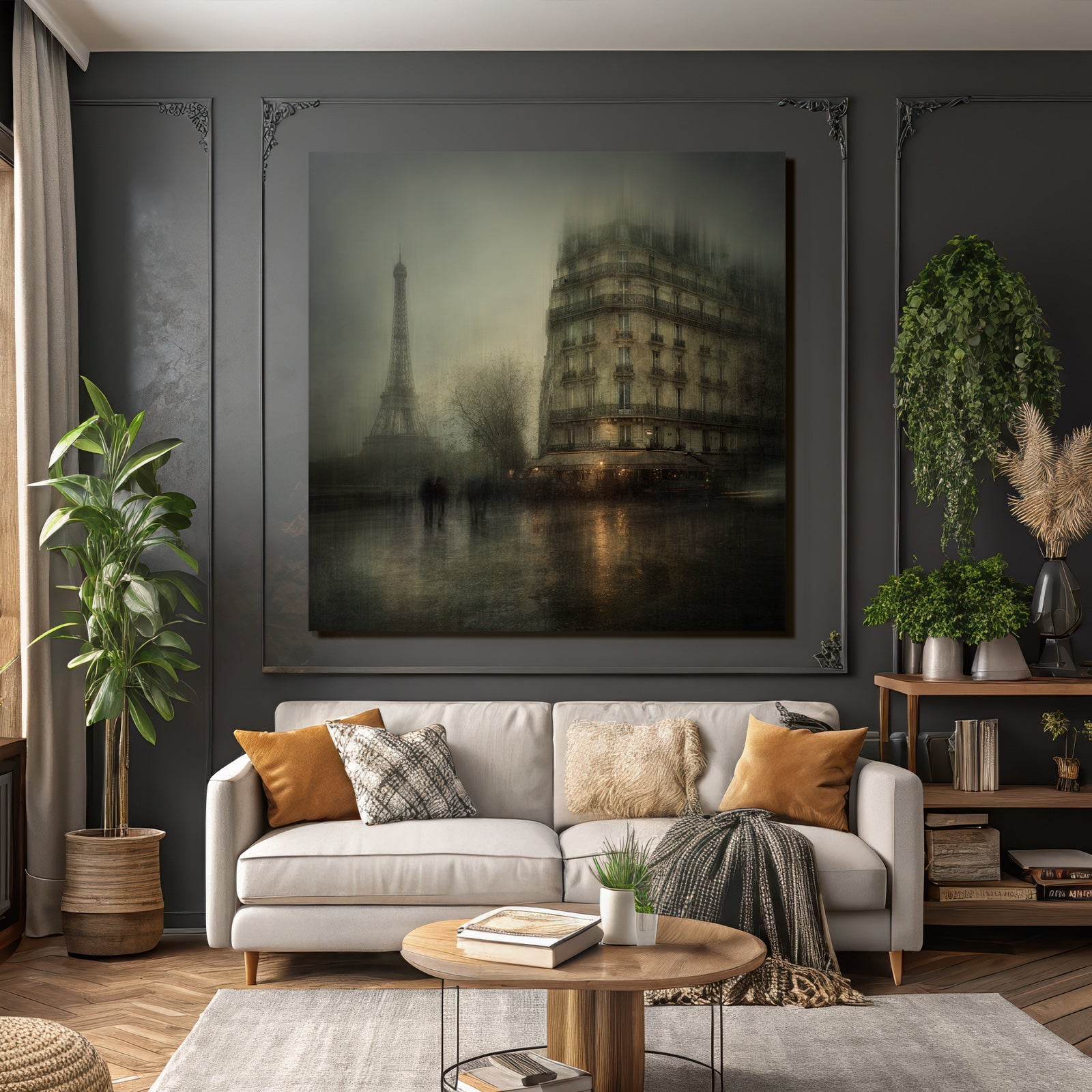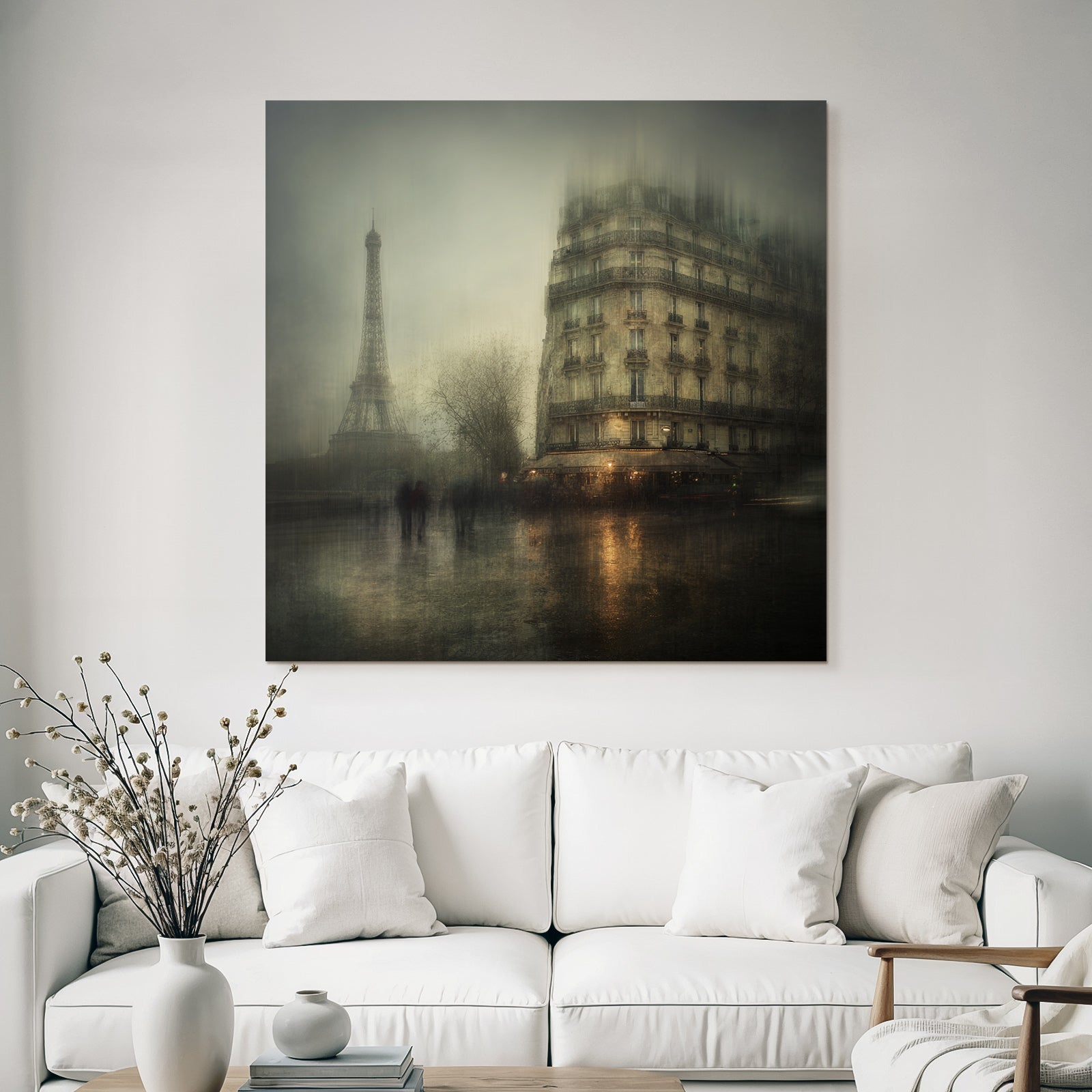 Ein Highlight für Wohnzimmer, Studio oder Empfangsbereich: „Nebliger Regenabend Am Eiffelturm“ bringt den Stil Staedtekunst auf Stoff – gespannt im edlen FameFrame.