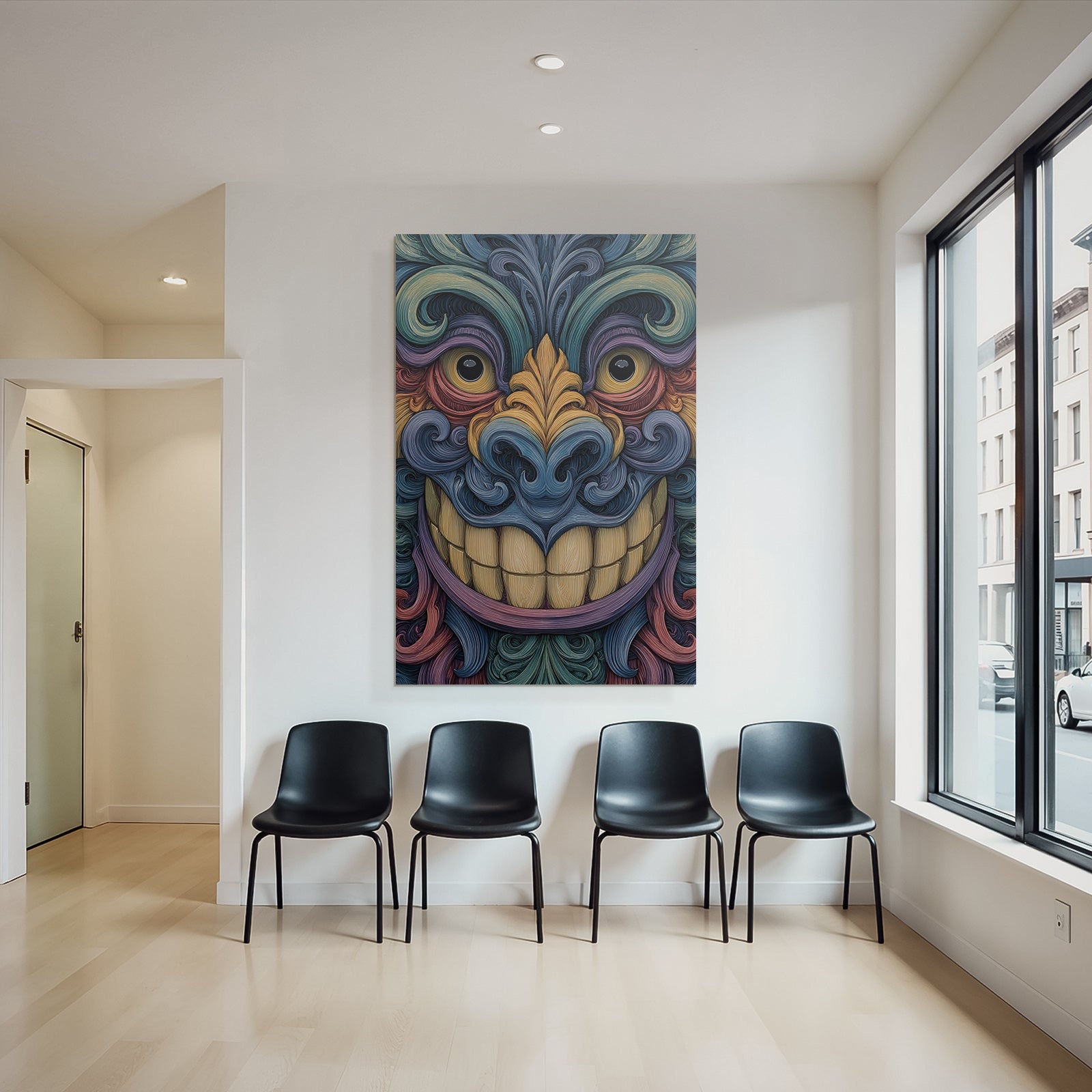 Setz ein Statement: „Bunte Mystische Maske Mit Wirbelmustern“ im Stil Psychedelische Kunst wird im FameFrame™ zum echten Kunstobjekt an Deiner Wand.