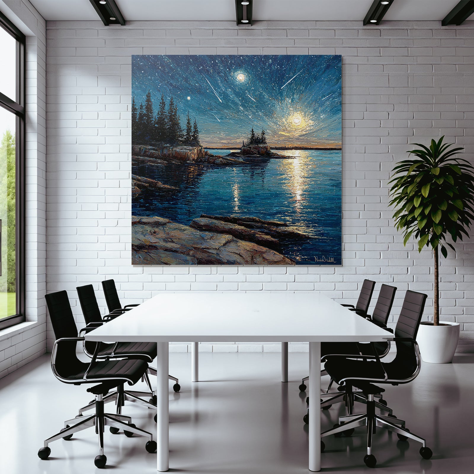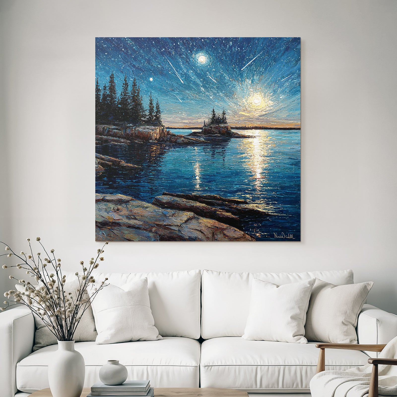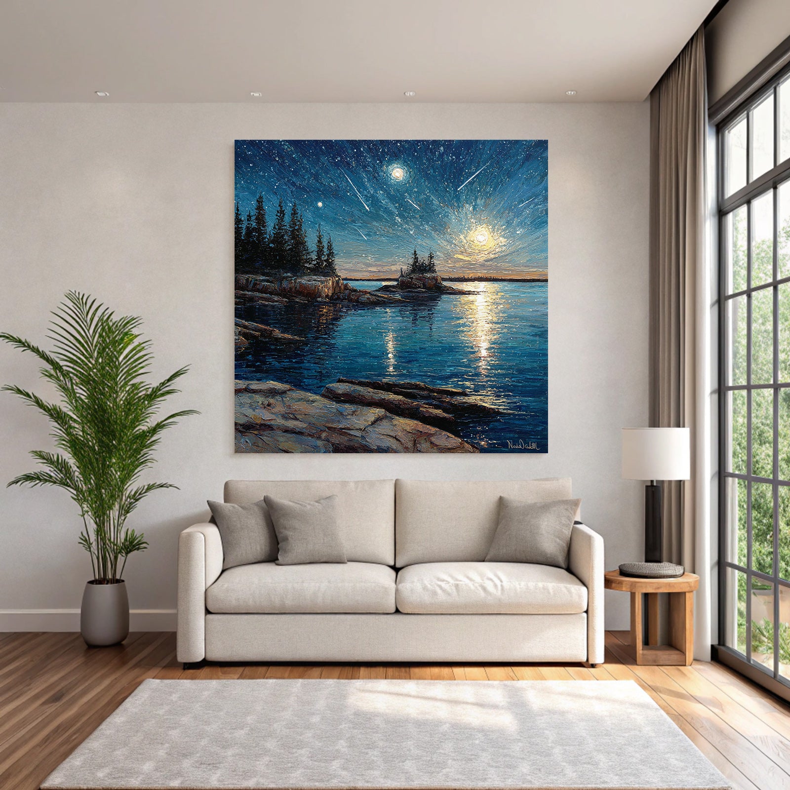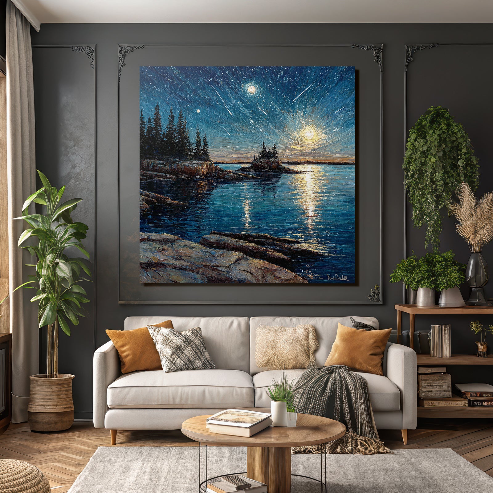 „Nächtliche Felsenküste Mit Sternenhimmel Und Baumsilhoütten“ ist das Highlight für jede Wand. Als brillanter Textildruck im Stil Psychedelische Kunst wird es im FameFrame™ zu einem dynamischen und wandelbaren Kunstobjekt.