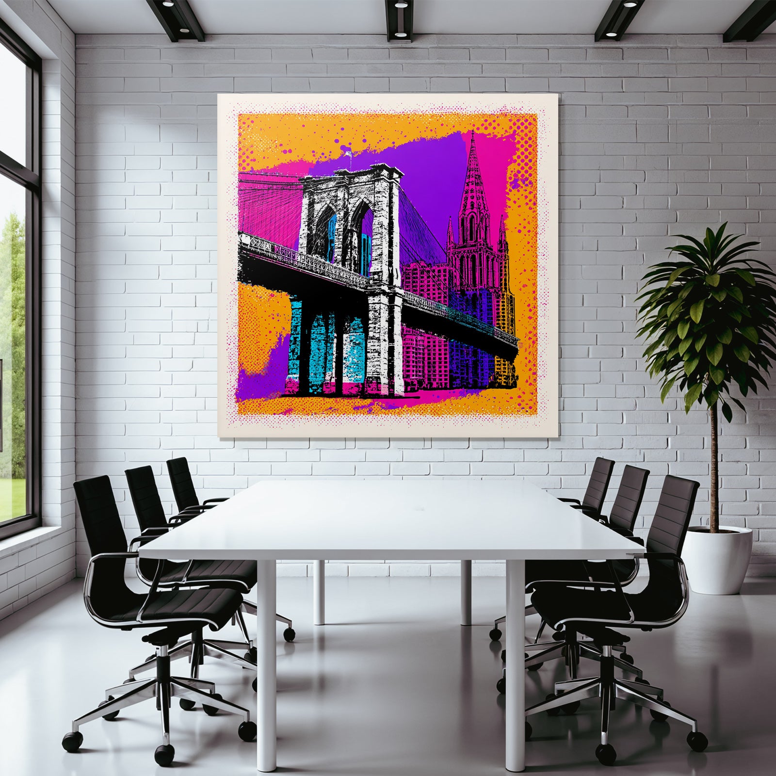 Bring die Atmosphäre von Pop Art in Dein Zuhause – mit „PopArt Bunte Brooklyn Brücke Pop Kunst“ auf Stoff im austauschbaren FameFrame™.