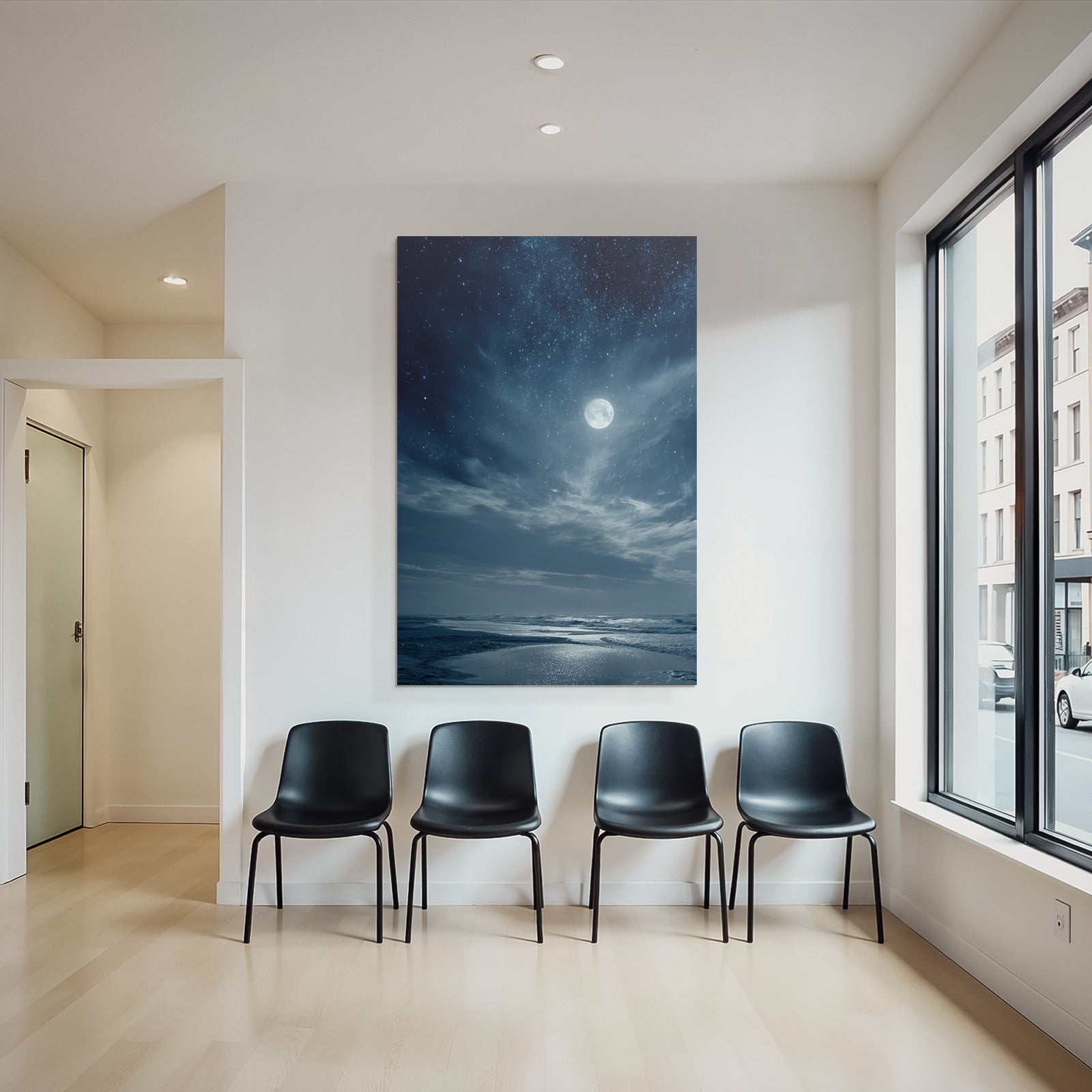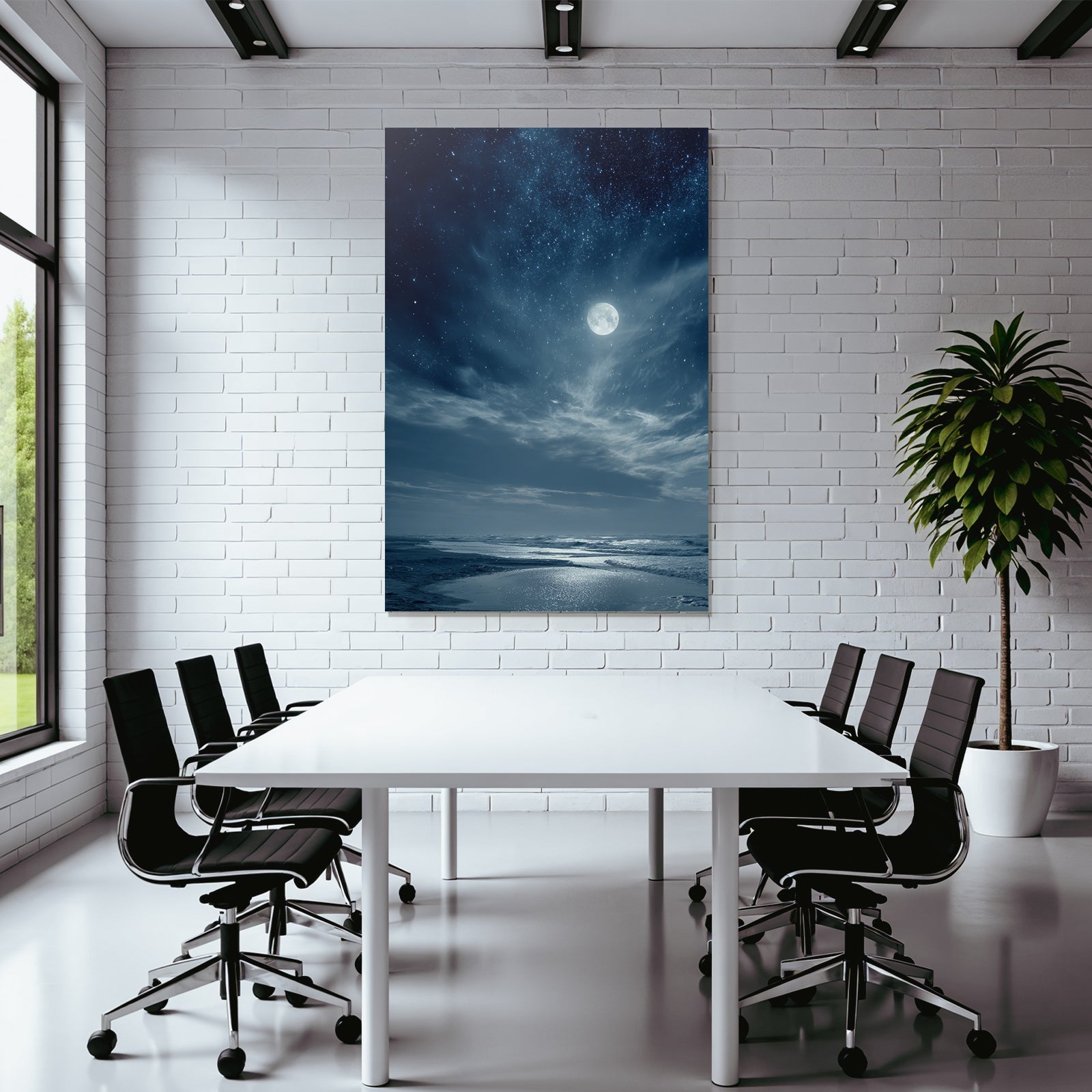 Gestalten Sie Ihr Homeoffice oder Büro inspirierend und modern. „Strandnacht Mit Vollmond Und Sternenhimmel“ im Psychedelische Kunst-Look sorgt im FameFrame™ für eine kreative Arbeitsatmosphäre.