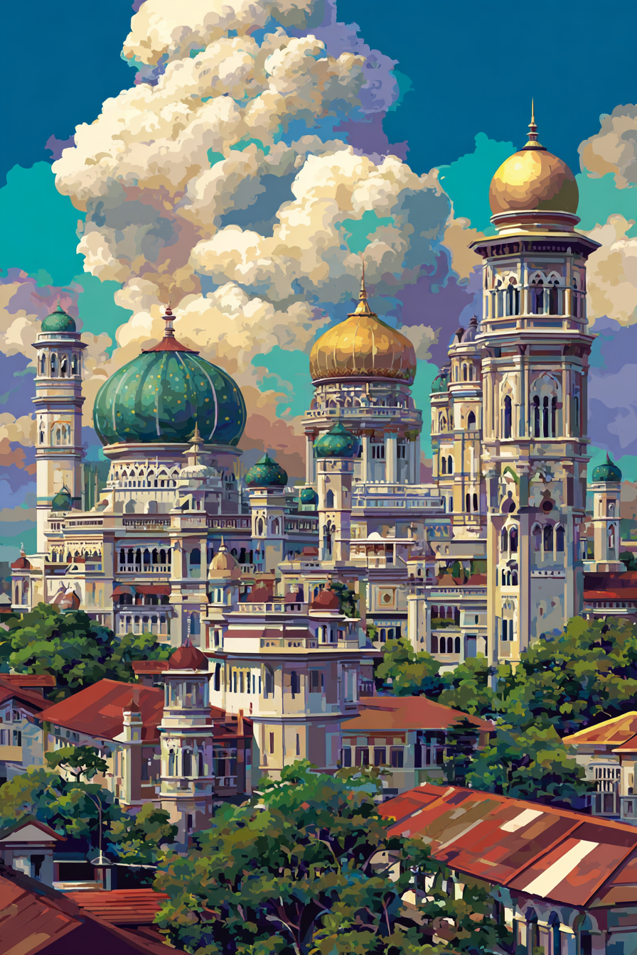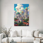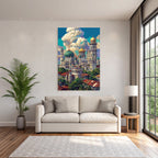 „Bunte Stilisierte Architektur Szene Mit Kuppeln Und Türme“ – ein Motiv, das begeistert. Inspiriert vom Stil Tattoo Aesthetik, setzt dieses Werk im edlen FameFrame einen unverwechselbaren Akzent in Ihren Räumen.