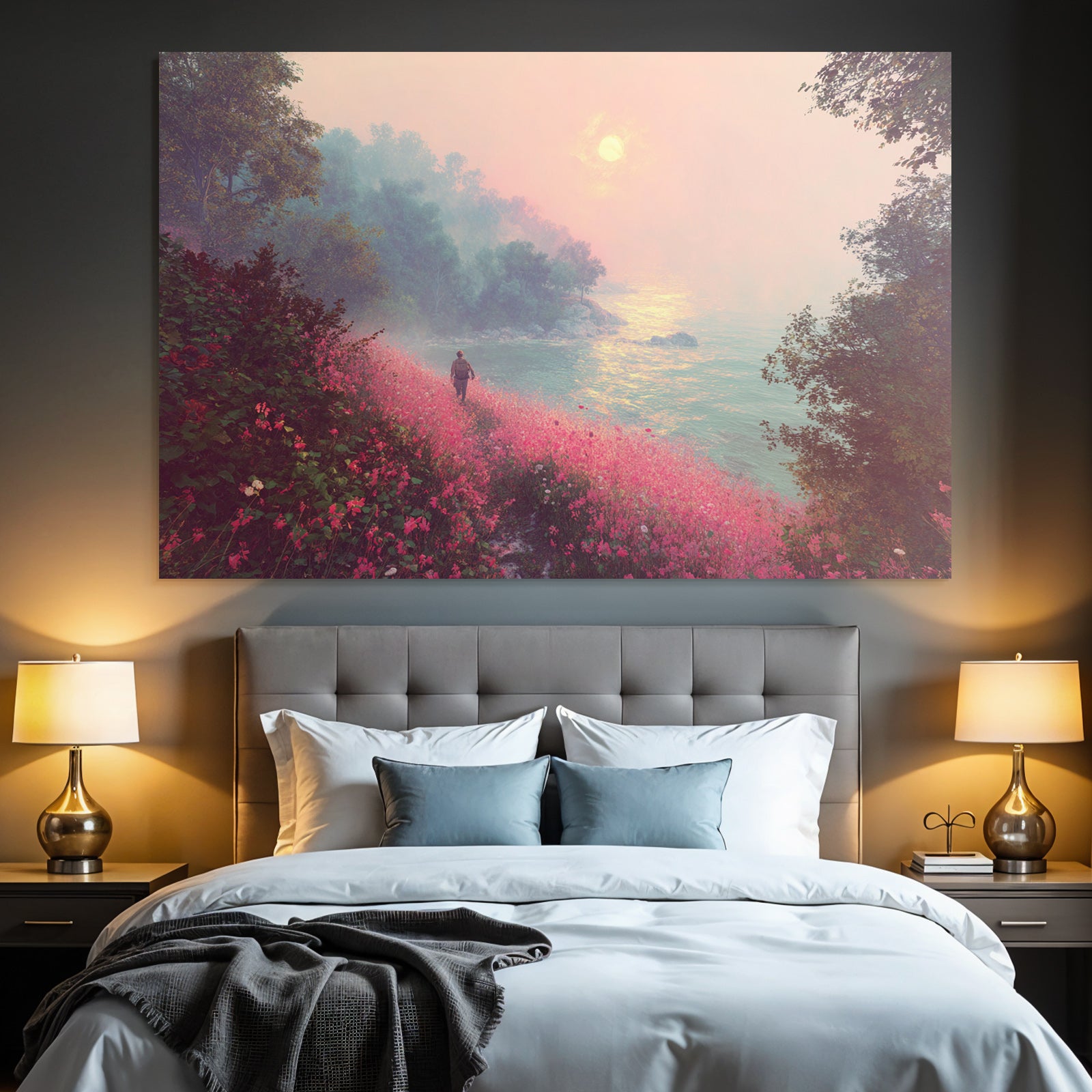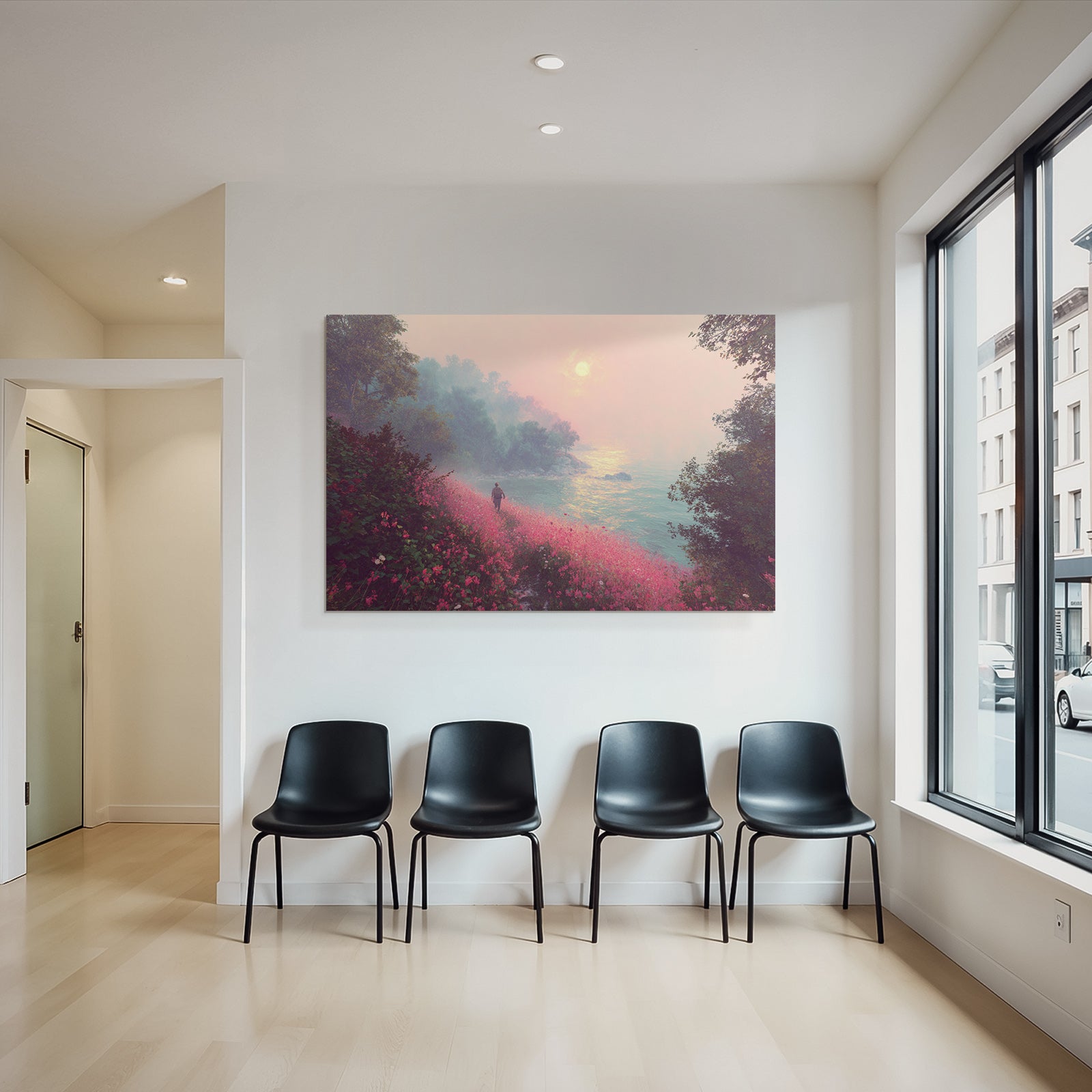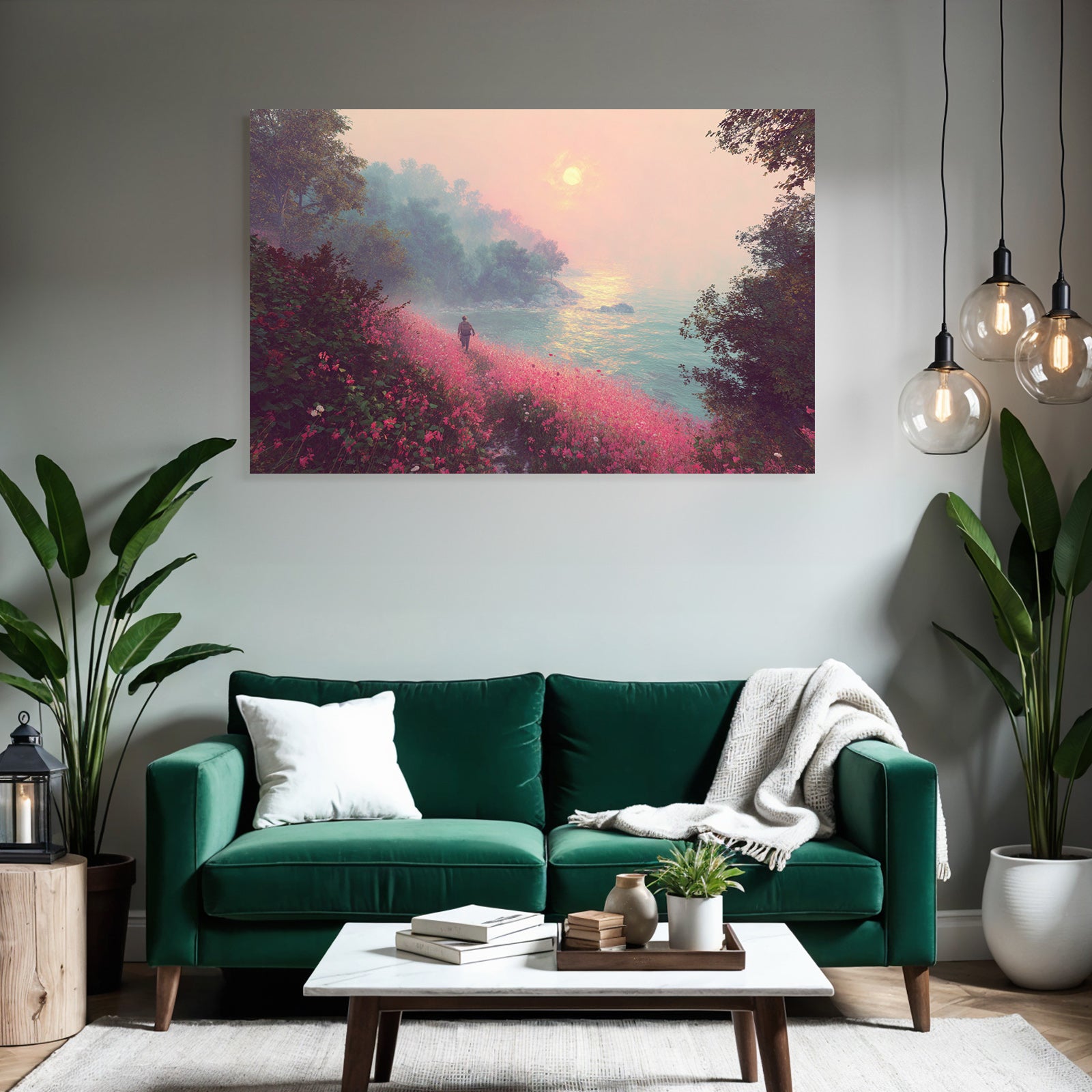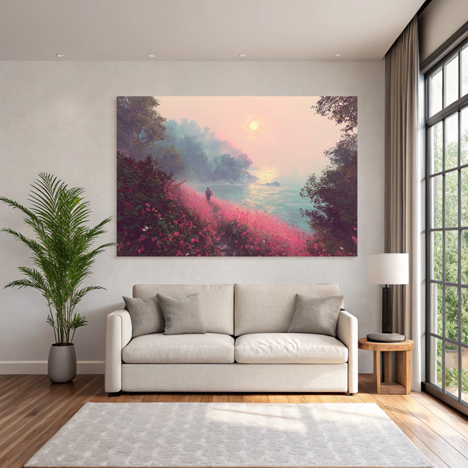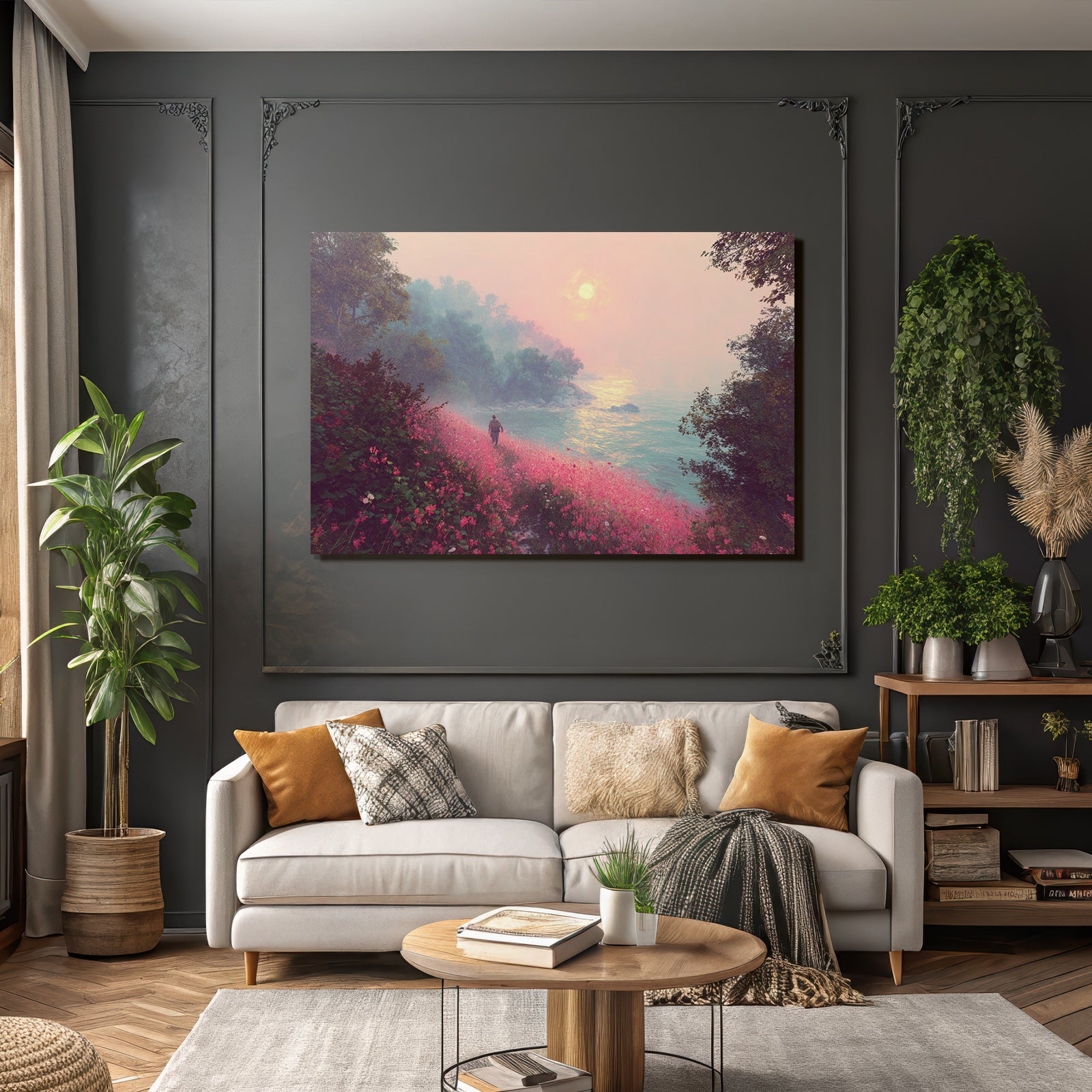 Ein Meisterwerk im Stil Yoga und Meditation: „Yoga Meditation Friedliche Landschaft Mit Blumen Sunset Und Person Am Strand“ fängt die Atmosphäre und die typischen Elemente dieses Stils ein und wird im FameFrame™ zum zeitlosen Hingucker.