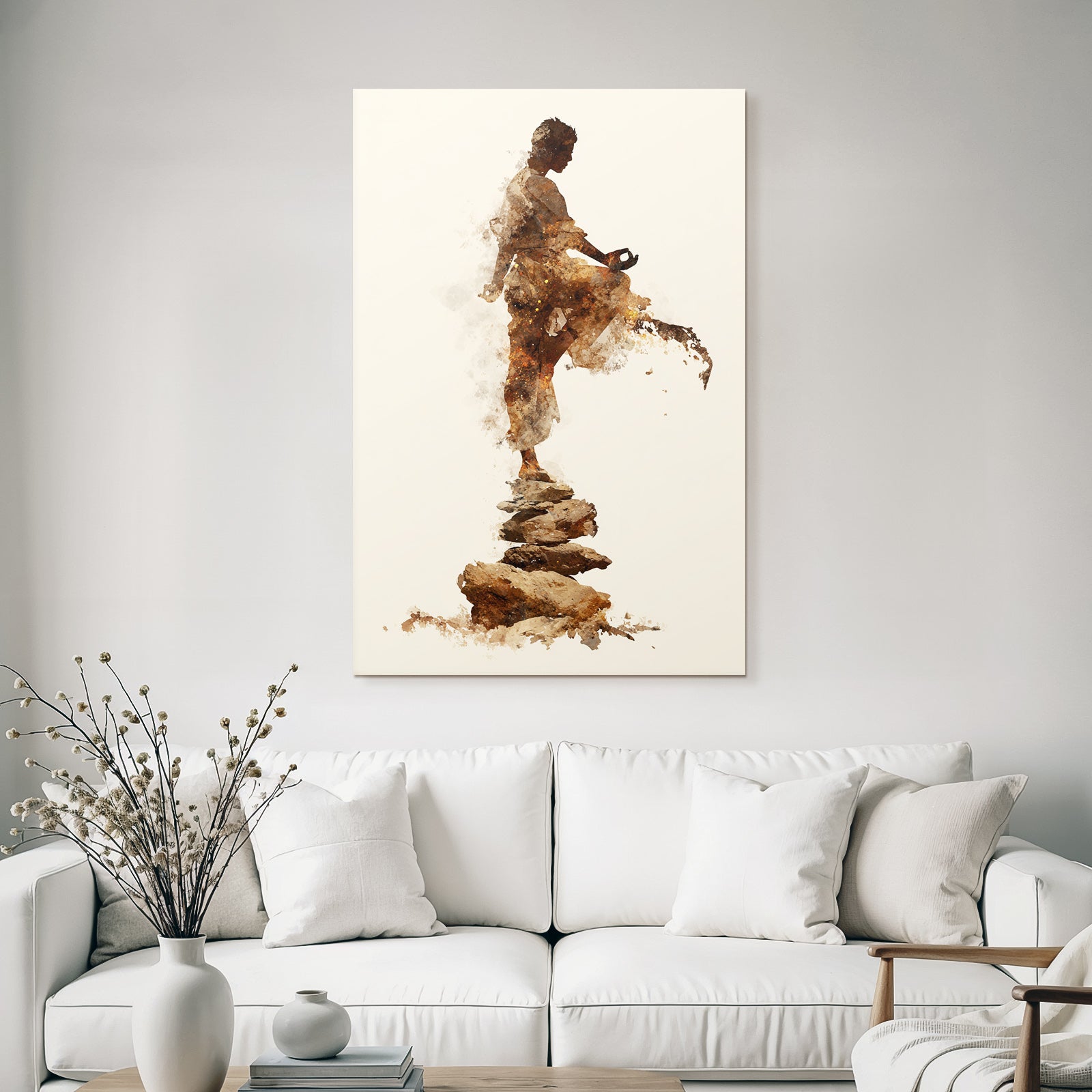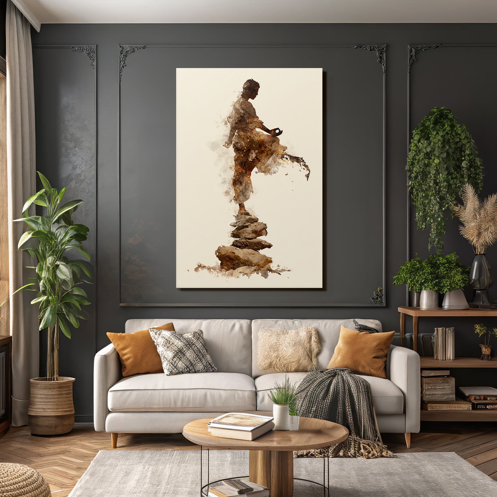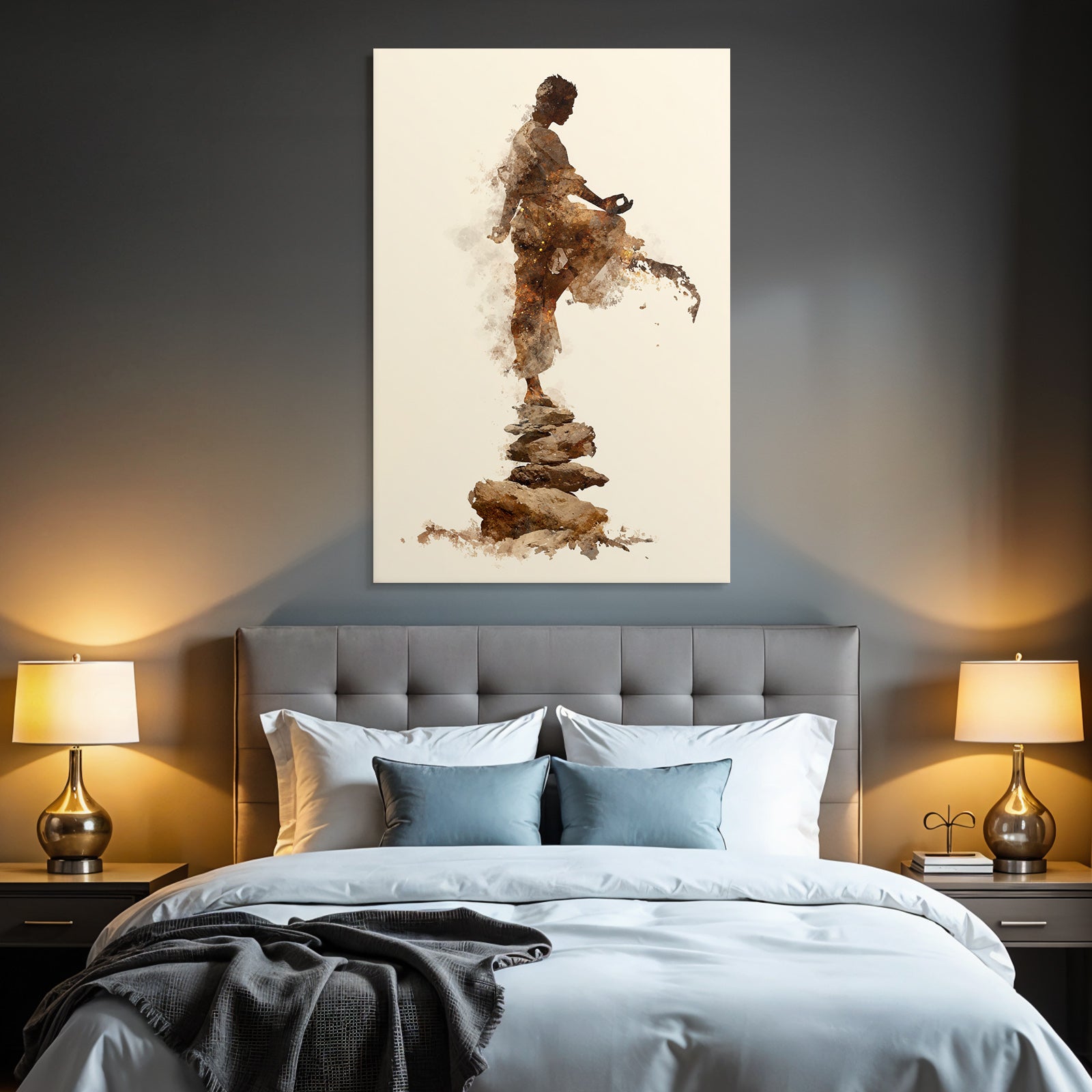 Verwandeln Sie Ihr Schlafzimmer in eine Oase der Ruhe. Das Motiv „Yoga Meditation Meditierende Figuren Auf Steinen Wasserfarbe Abstrakt“ im Stil Yoga und Meditation wirkt im FameFrame™ besonders harmonisch und beruhigend.
