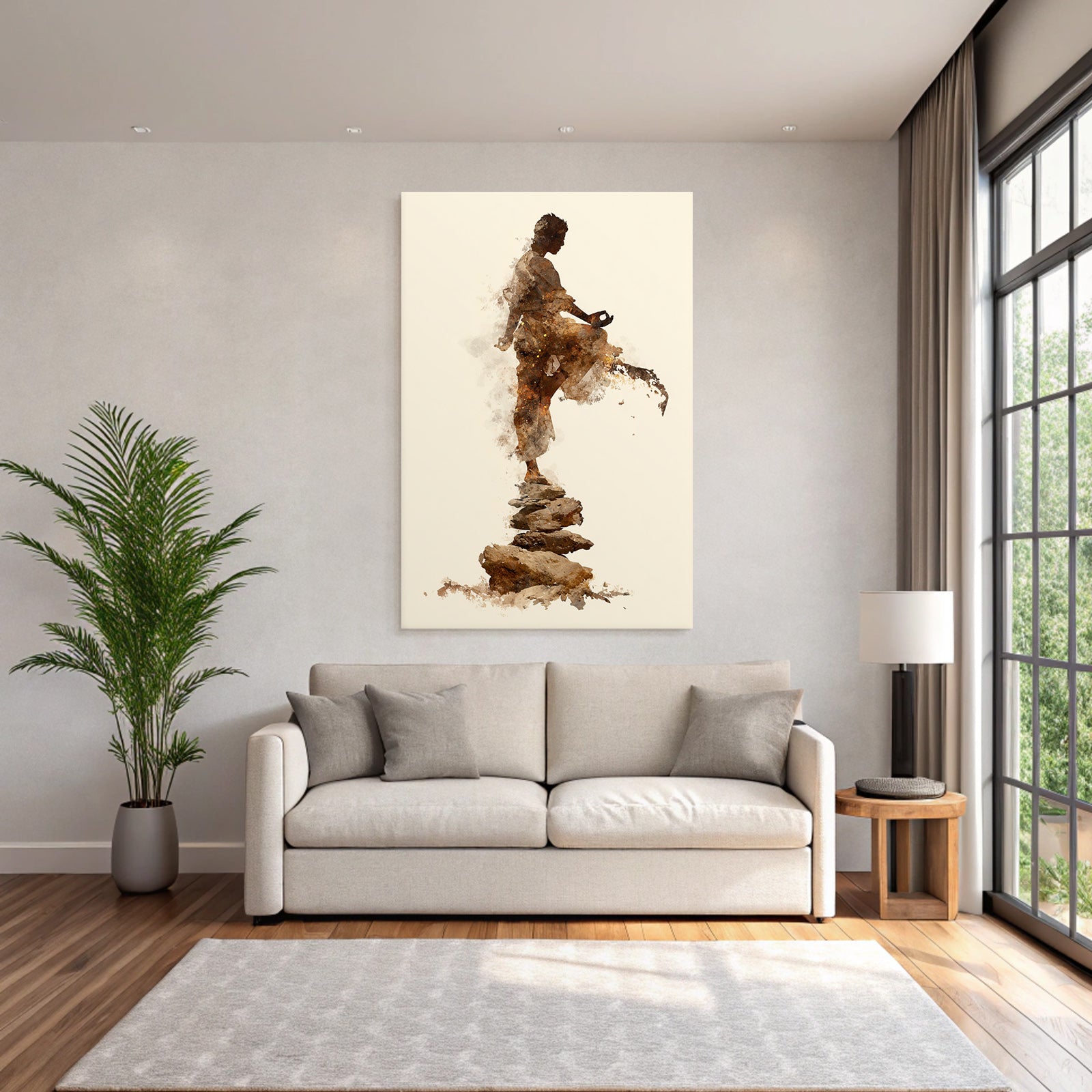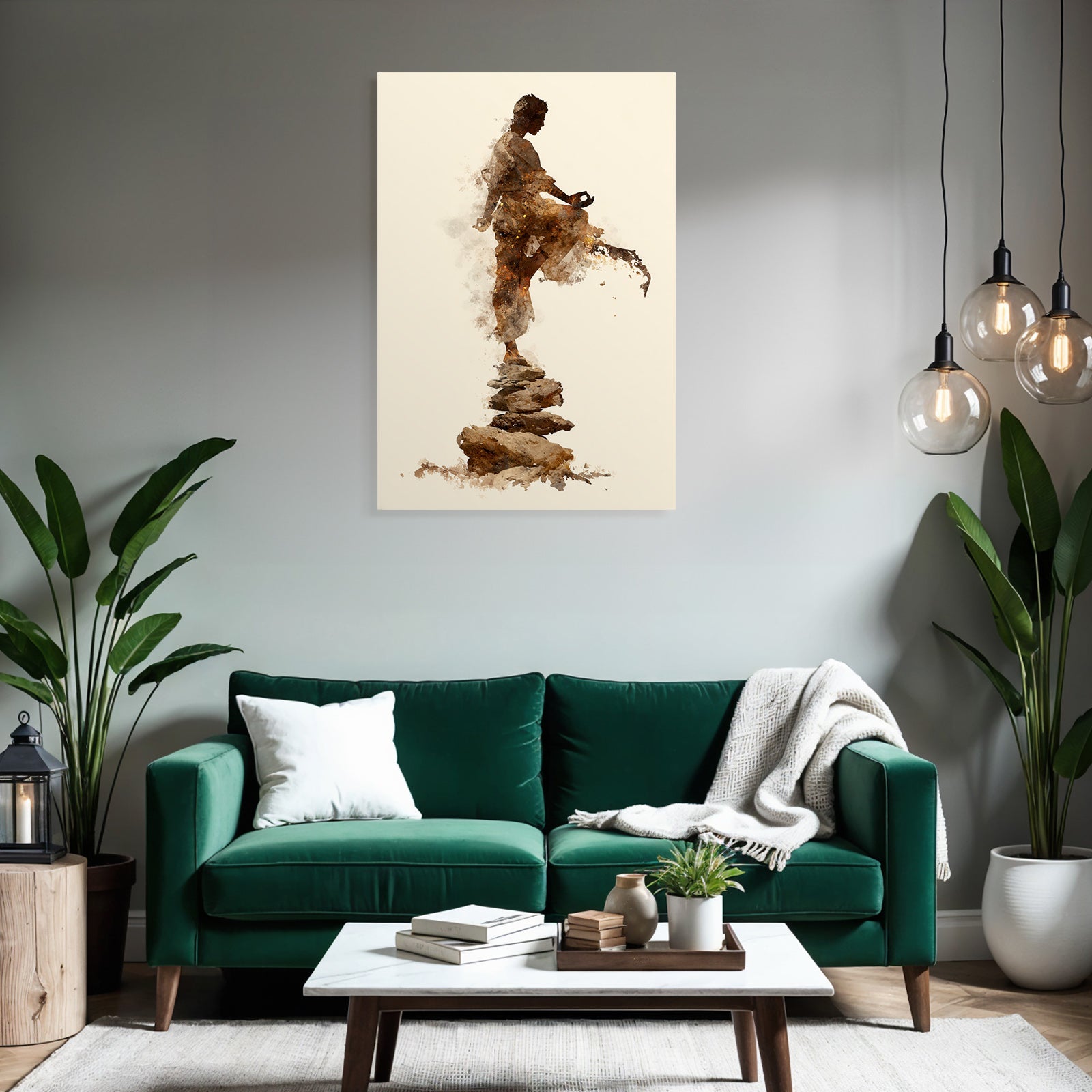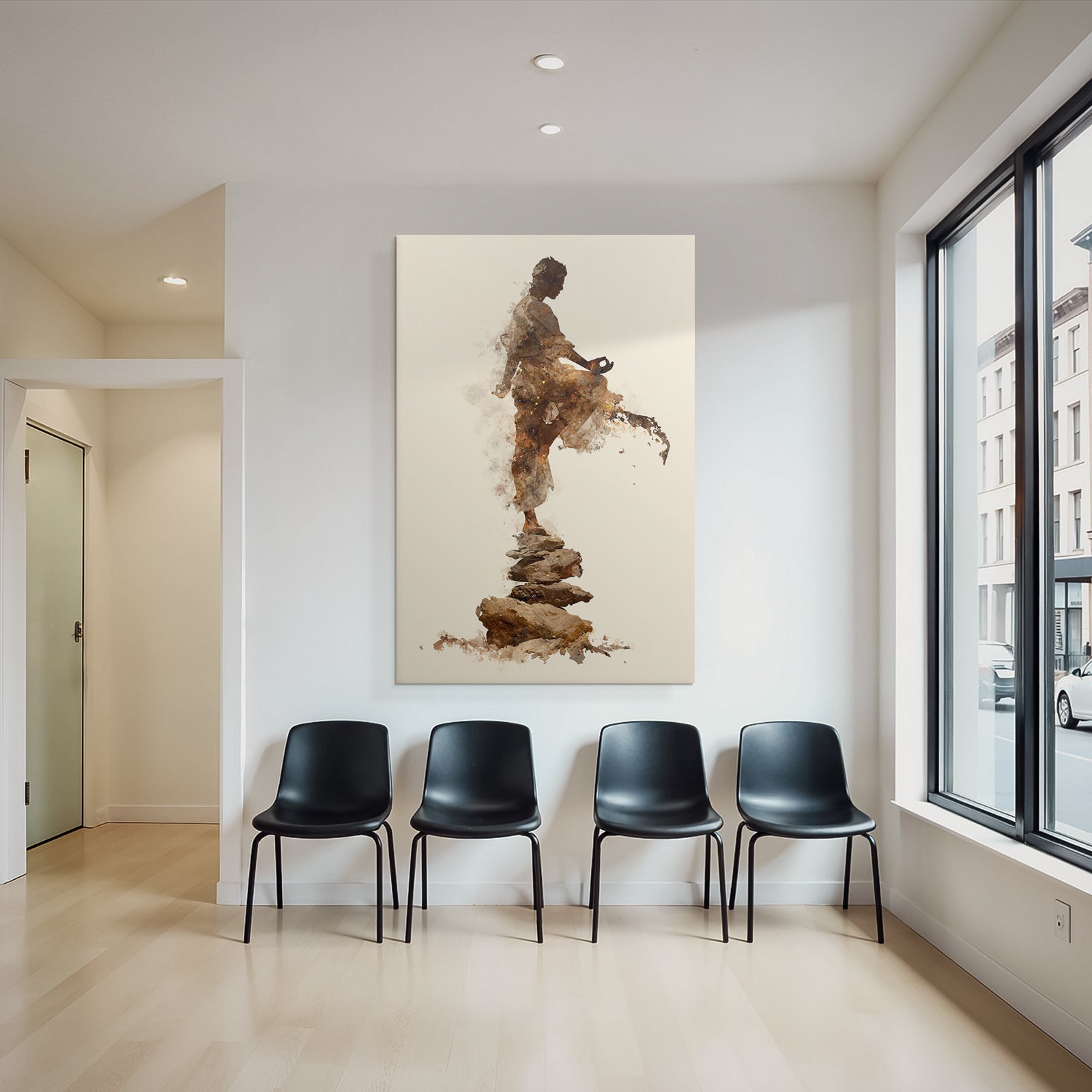 Verwandeln Sie Ihr Schlafzimmer in eine Oase der Ruhe. Das Motiv „Yoga Meditation Meditierende Figuren Auf Steinen Wasserfarbe Abstrakt“ im Stil Yoga und Meditation wirkt im FameFrame™ besonders harmonisch und beruhigend.