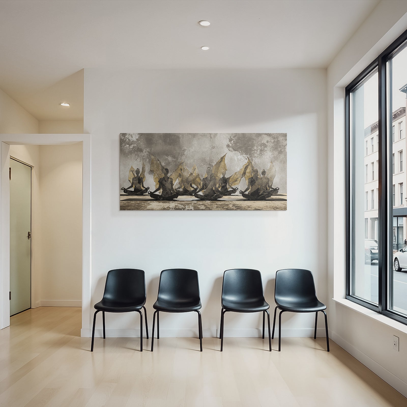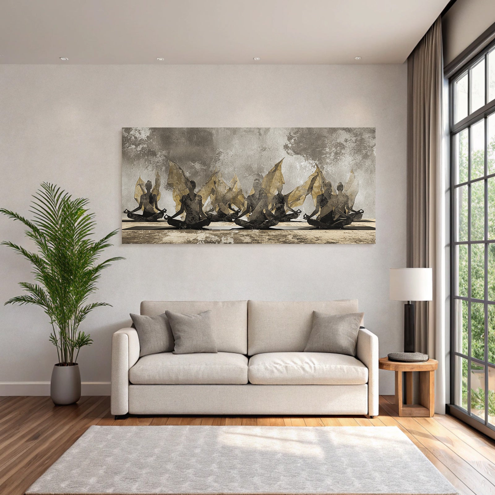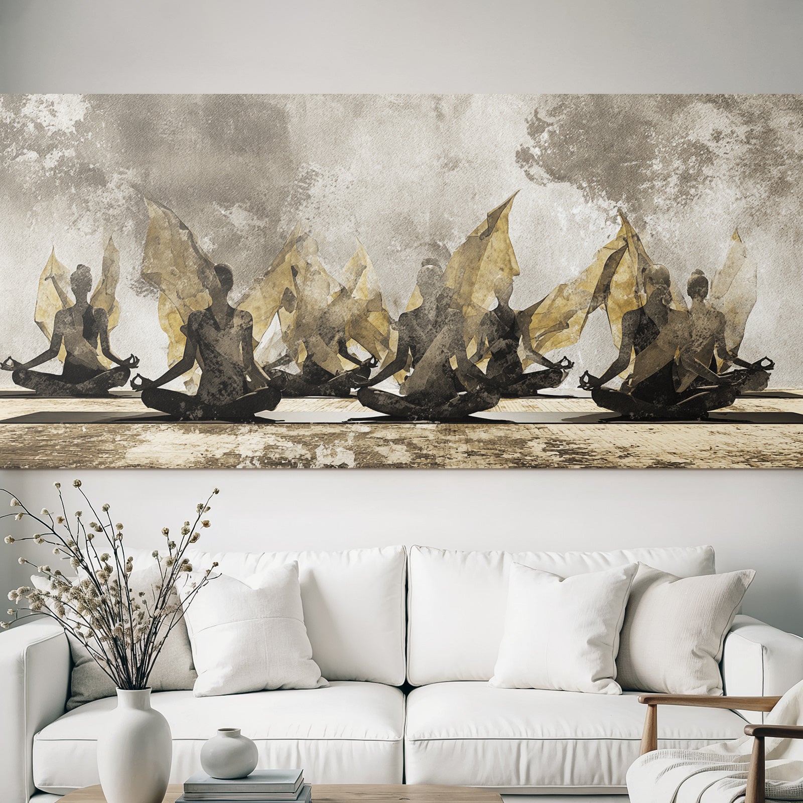 Erlebe Kunst im Stil Yoga und Meditation neu: „Yoga Meditation Meditierende Figuren Mit Fantastischen Flügeln Auf Der Suche Nach Transformation“ wird durch den eleganten FameFrame™ zum Blickfang in jedem Raum.
