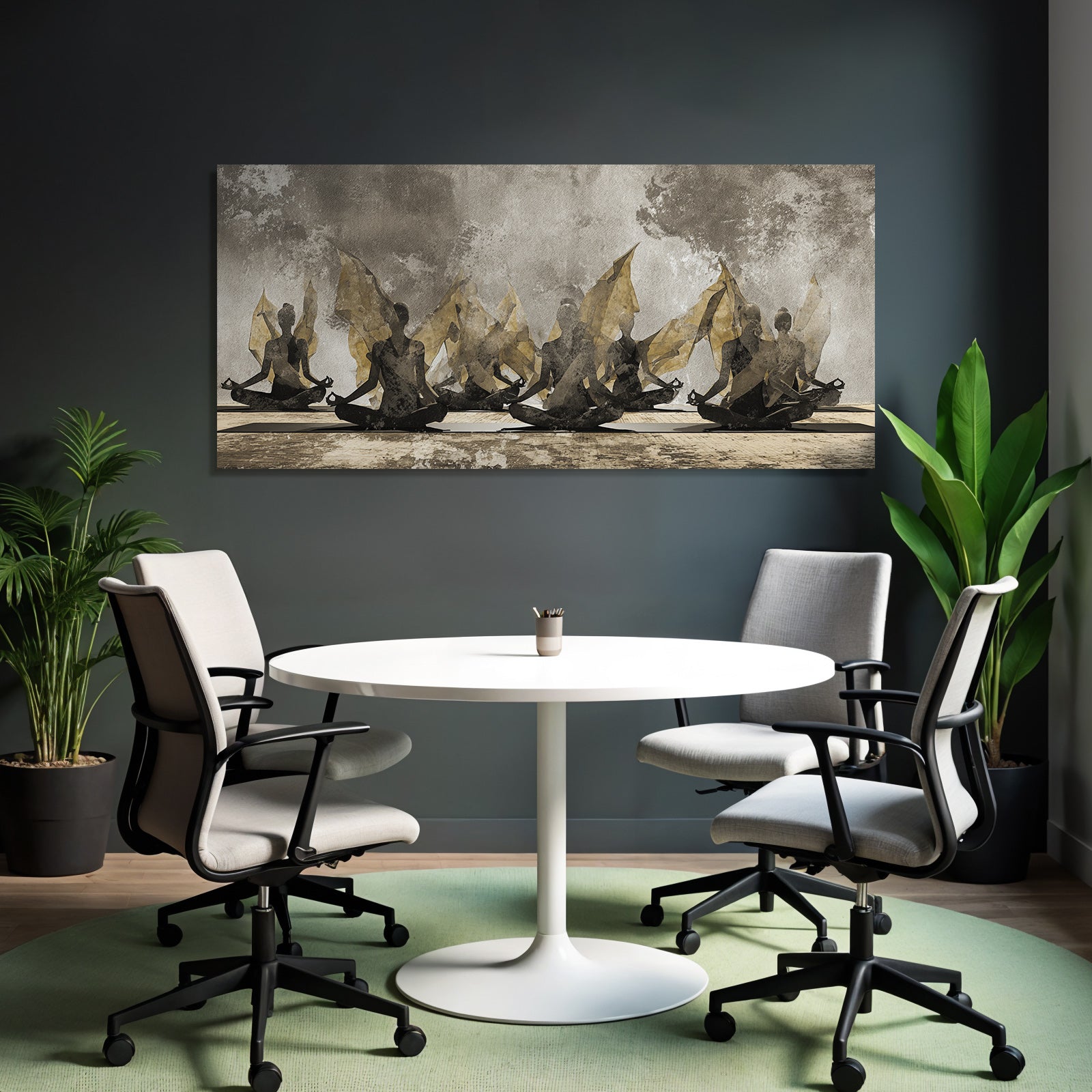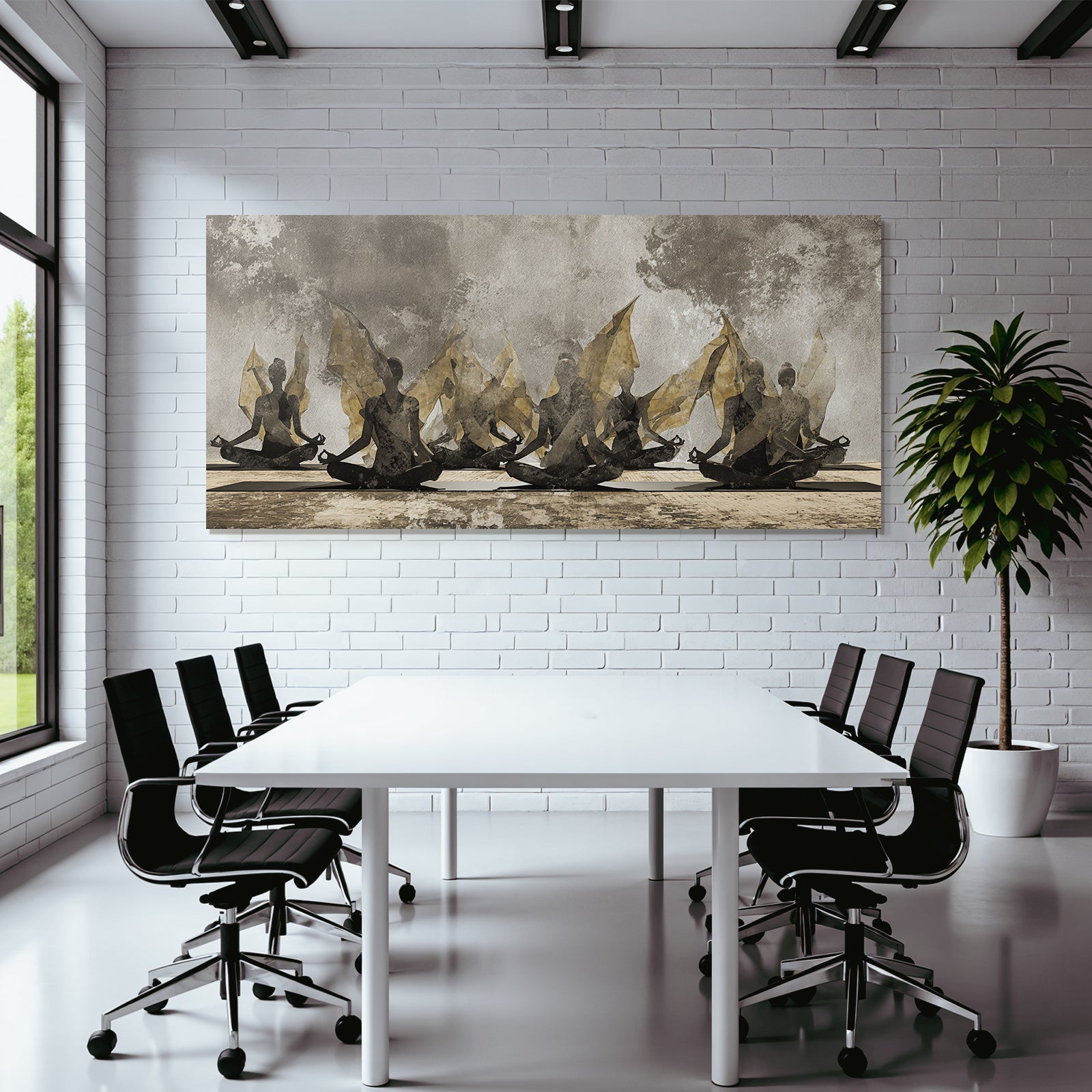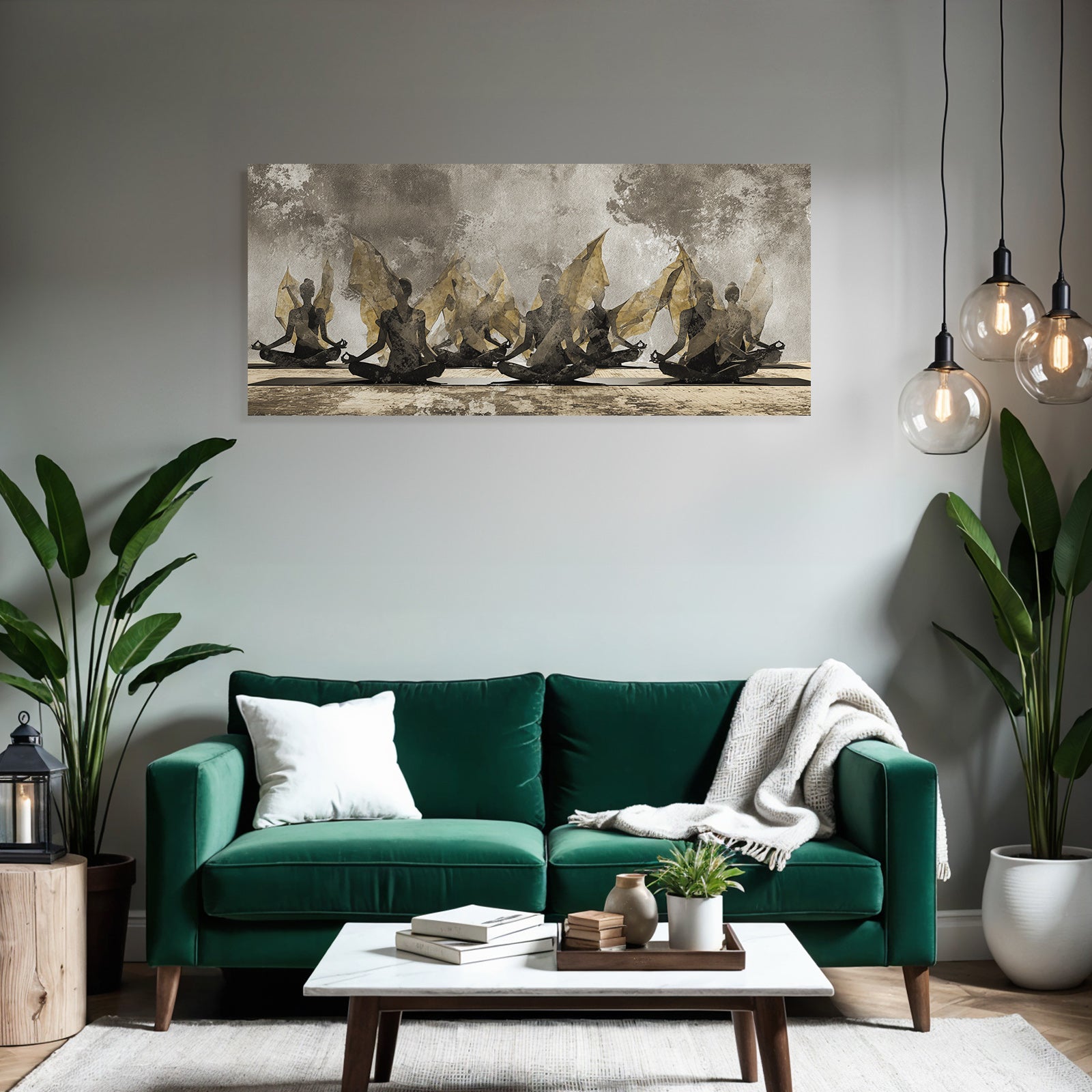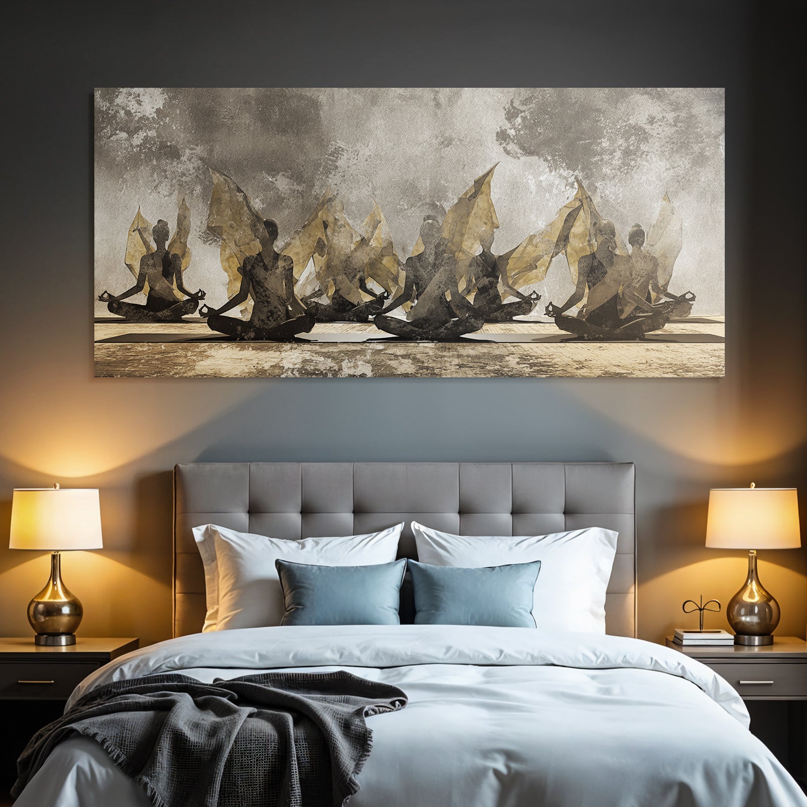 Erlebe Kunst im Stil Yoga und Meditation neu: „Yoga Meditation Meditierende Figuren Mit Fantastischen Flügeln Auf Der Suche Nach Transformation“ wird durch den eleganten FameFrame™ zum Blickfang in jedem Raum.