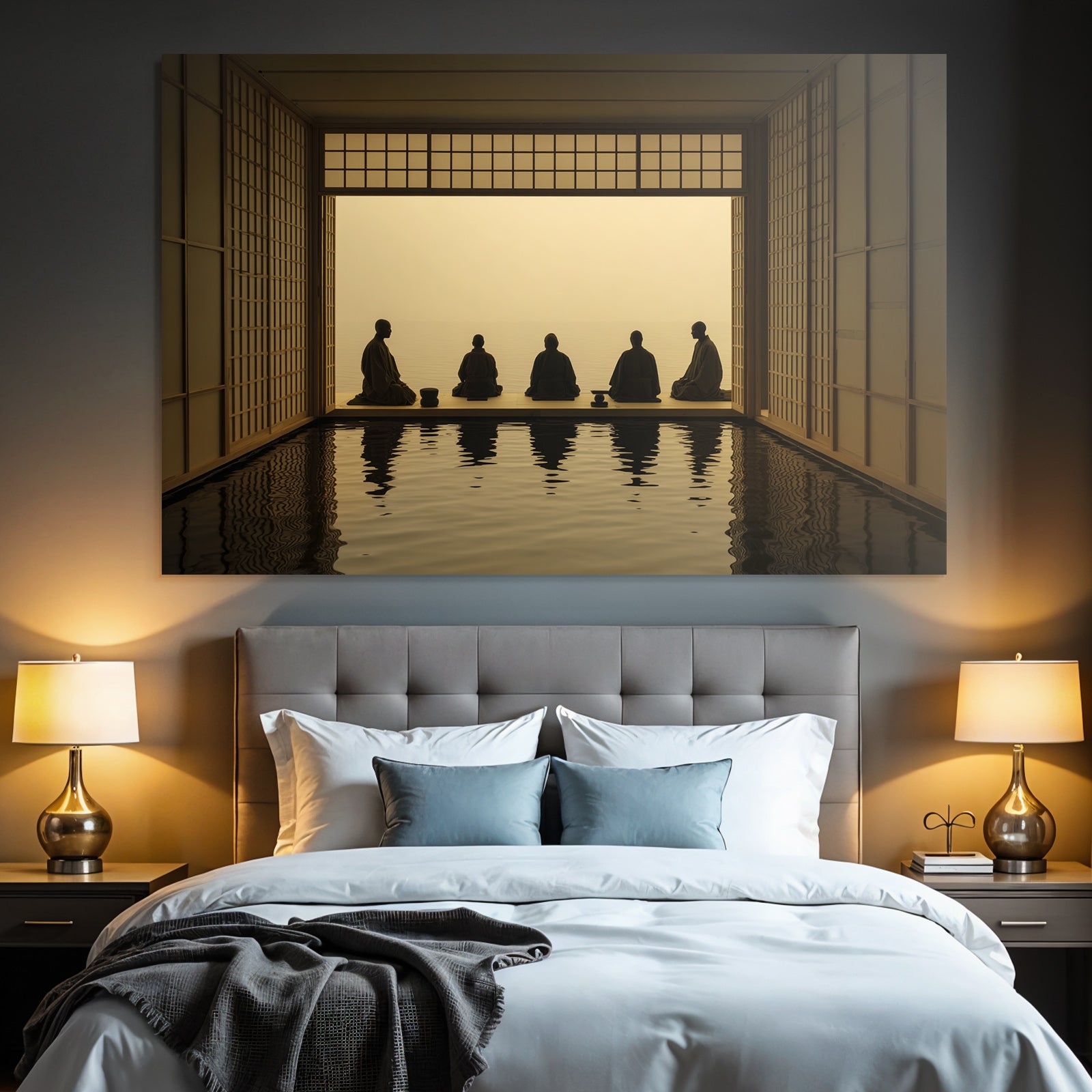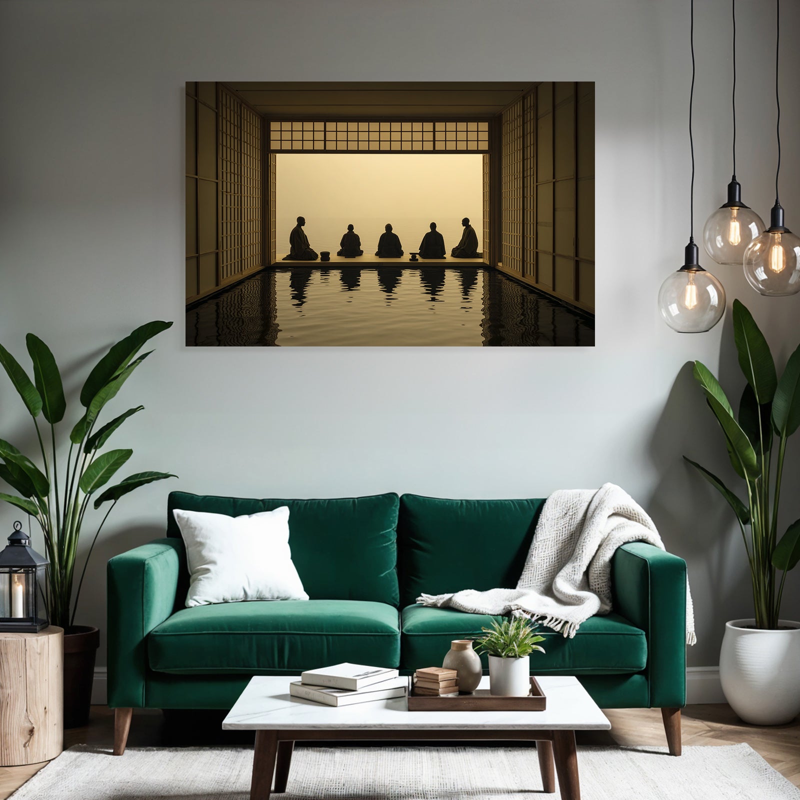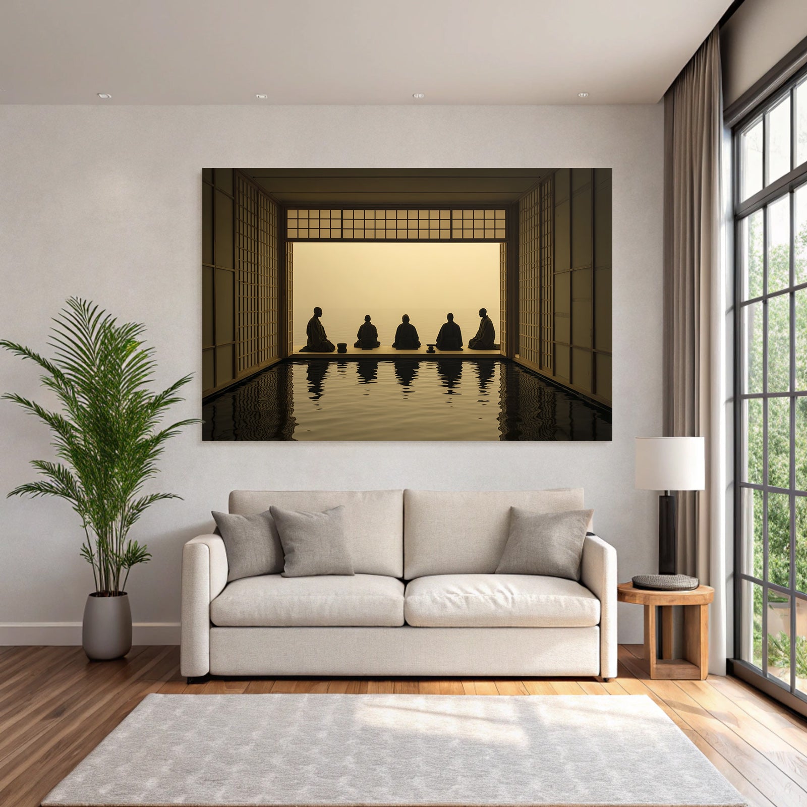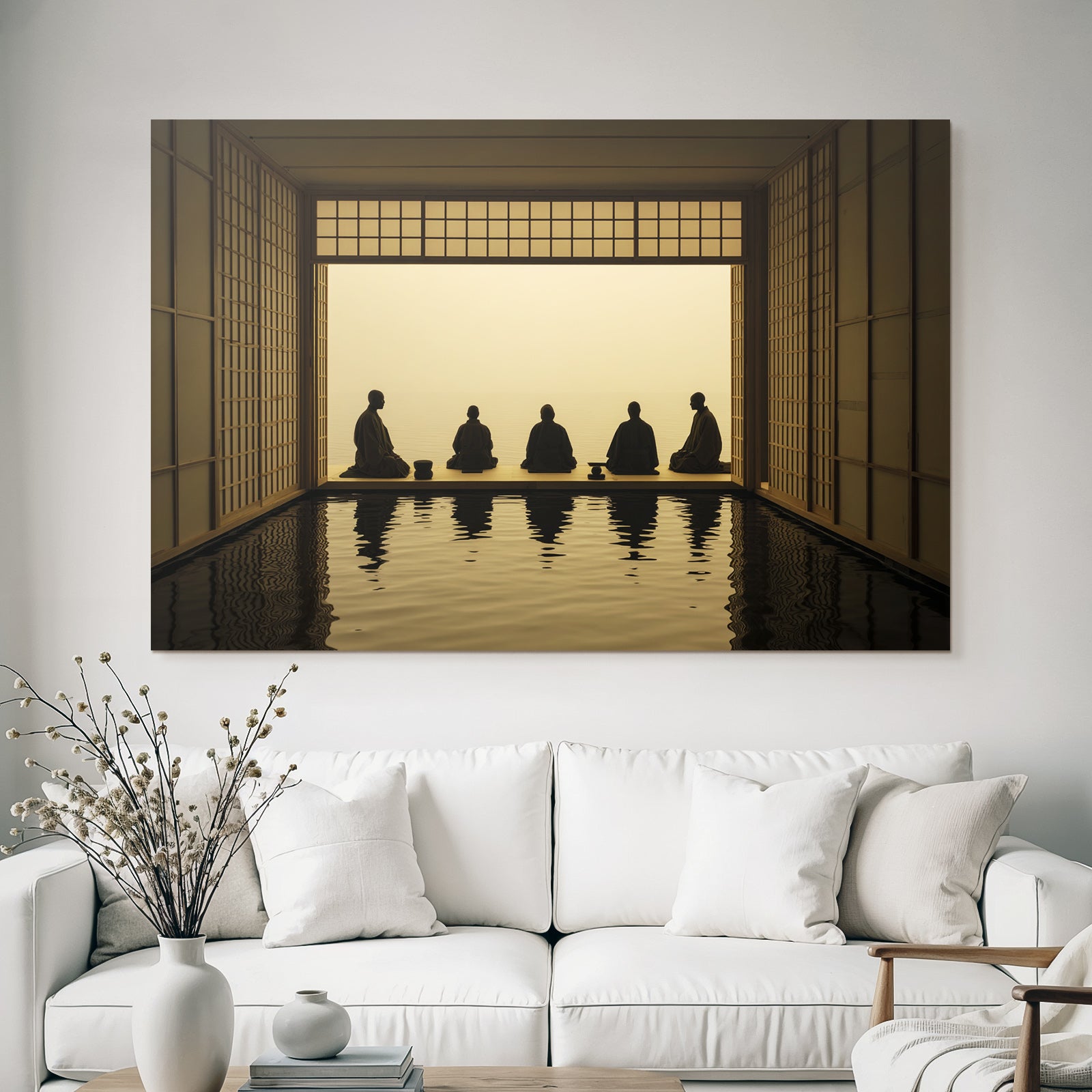 Spüren Sie die Energie von „Yoga Meditation Ruhige Szene Mit Mönchen Am Wasser“. Die dynamische Komposition im Stil Yoga und Meditation wird durch die matte Oberfläche des Textildrucks im FameFrame™ besonders intensiv.