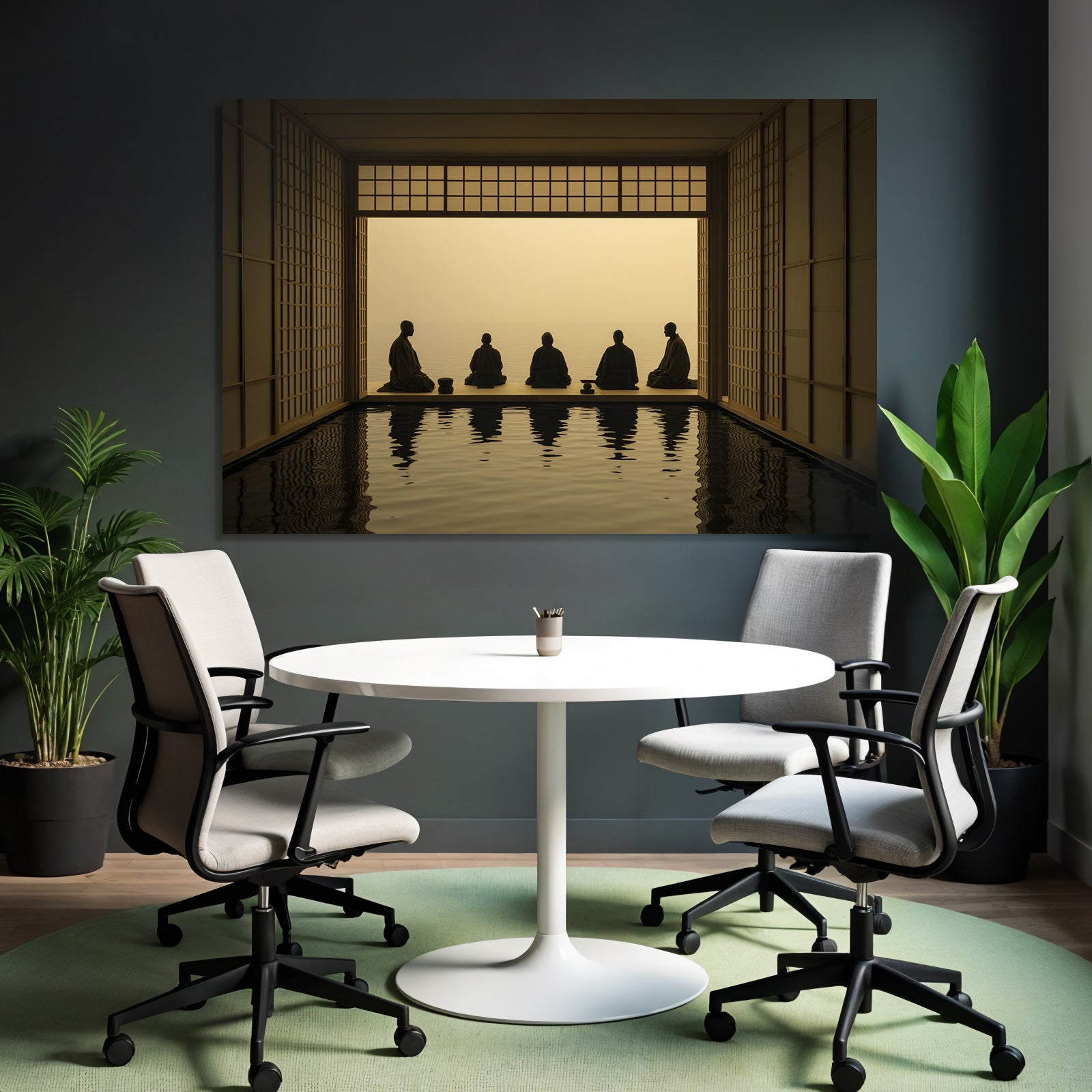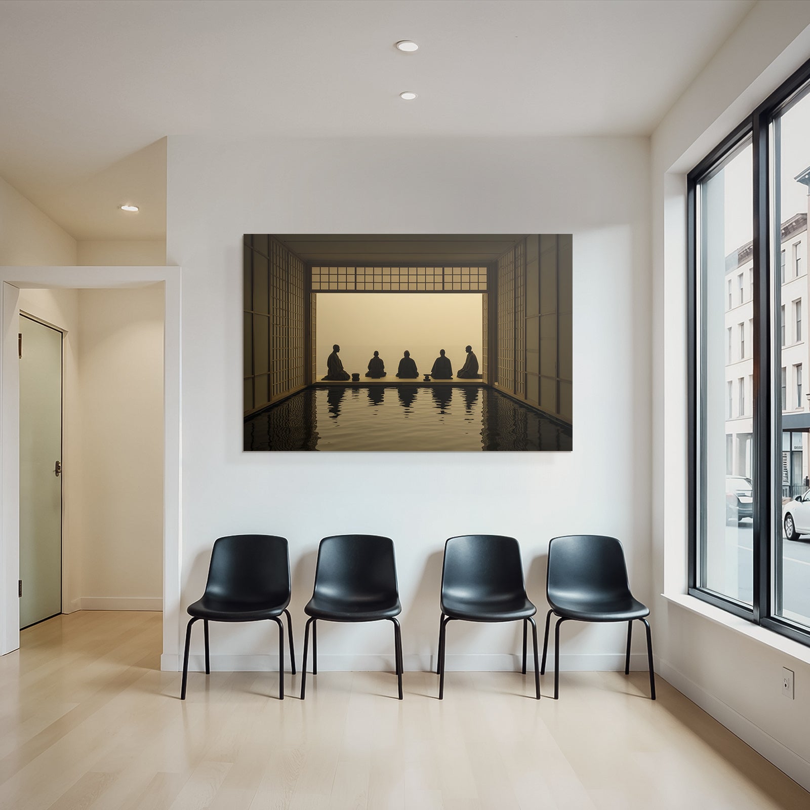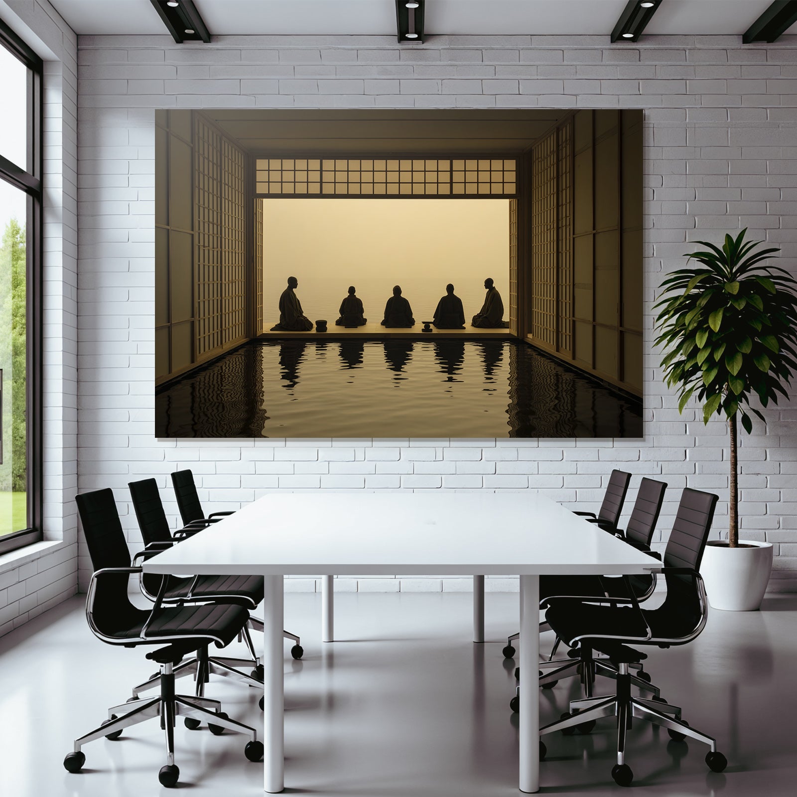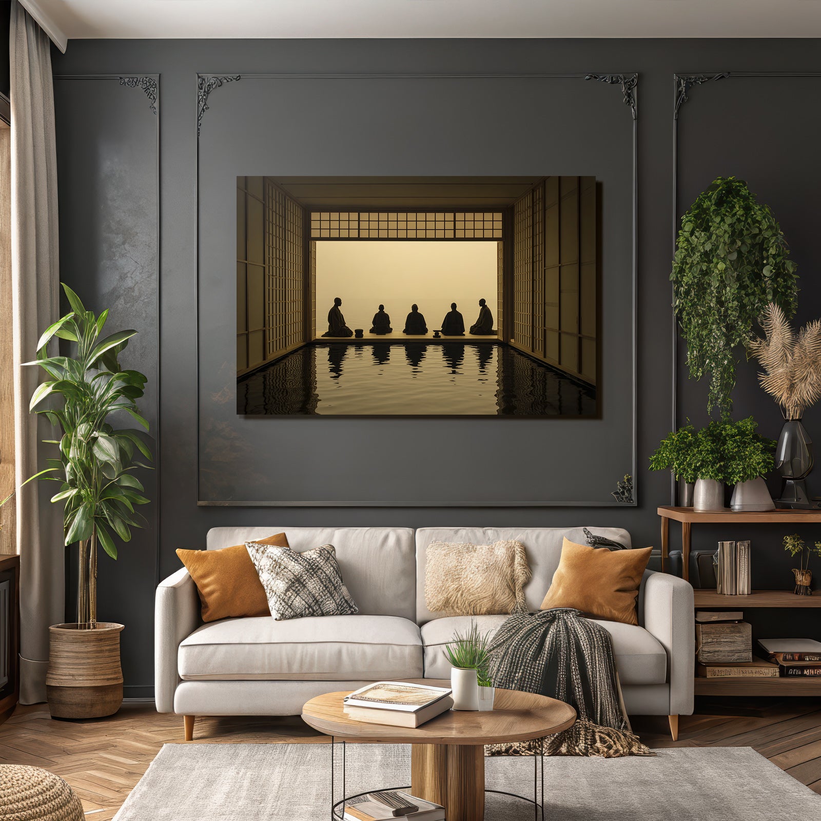 Spüren Sie die Energie von „Yoga Meditation Ruhige Szene Mit Mönchen Am Wasser“. Die dynamische Komposition im Stil Yoga und Meditation wird durch die matte Oberfläche des Textildrucks im FameFrame™ besonders intensiv.