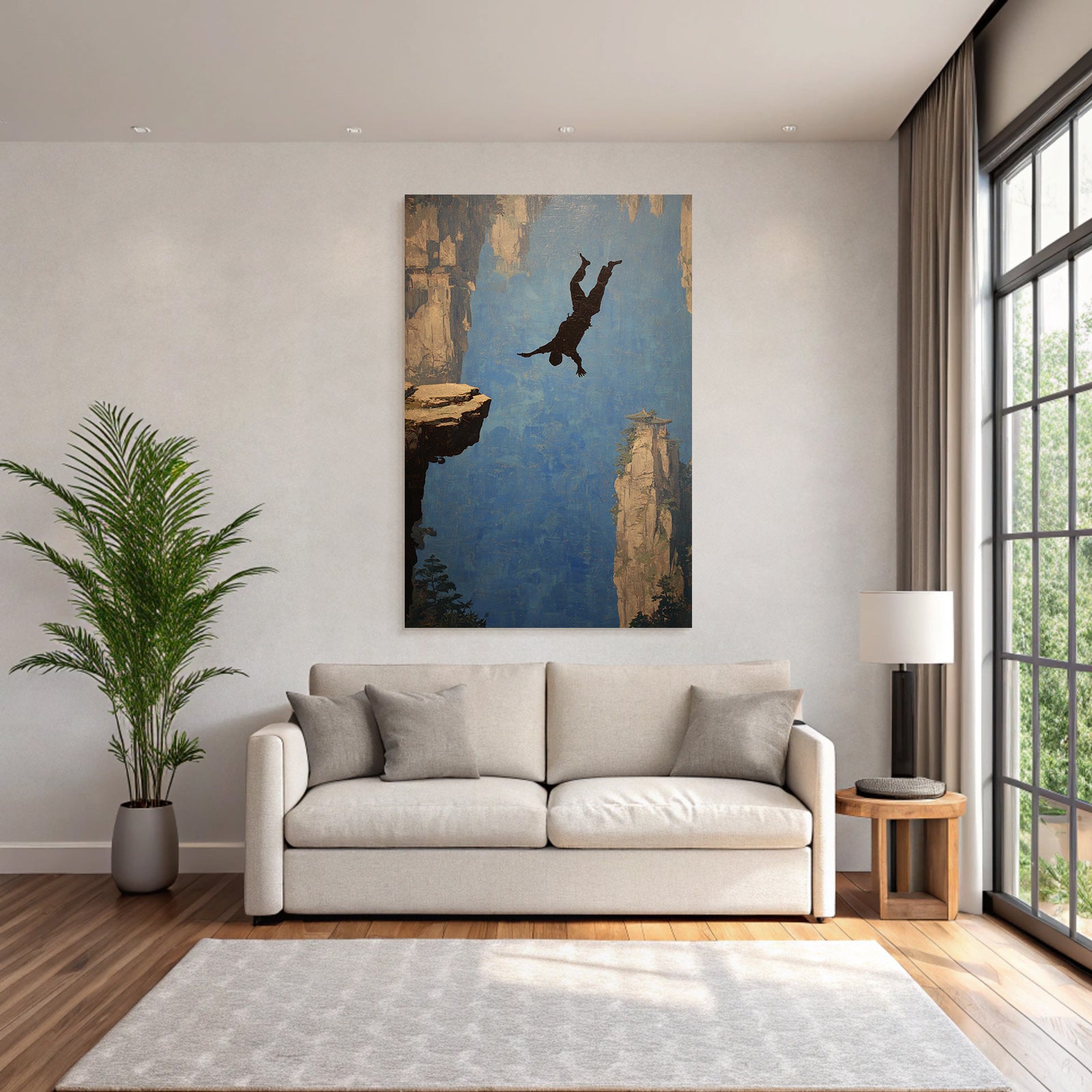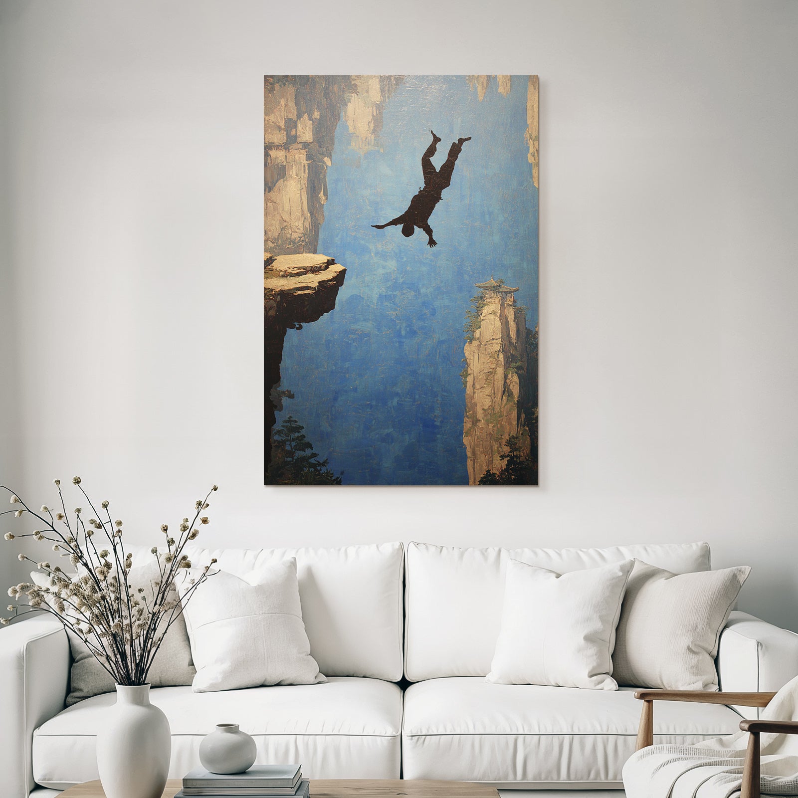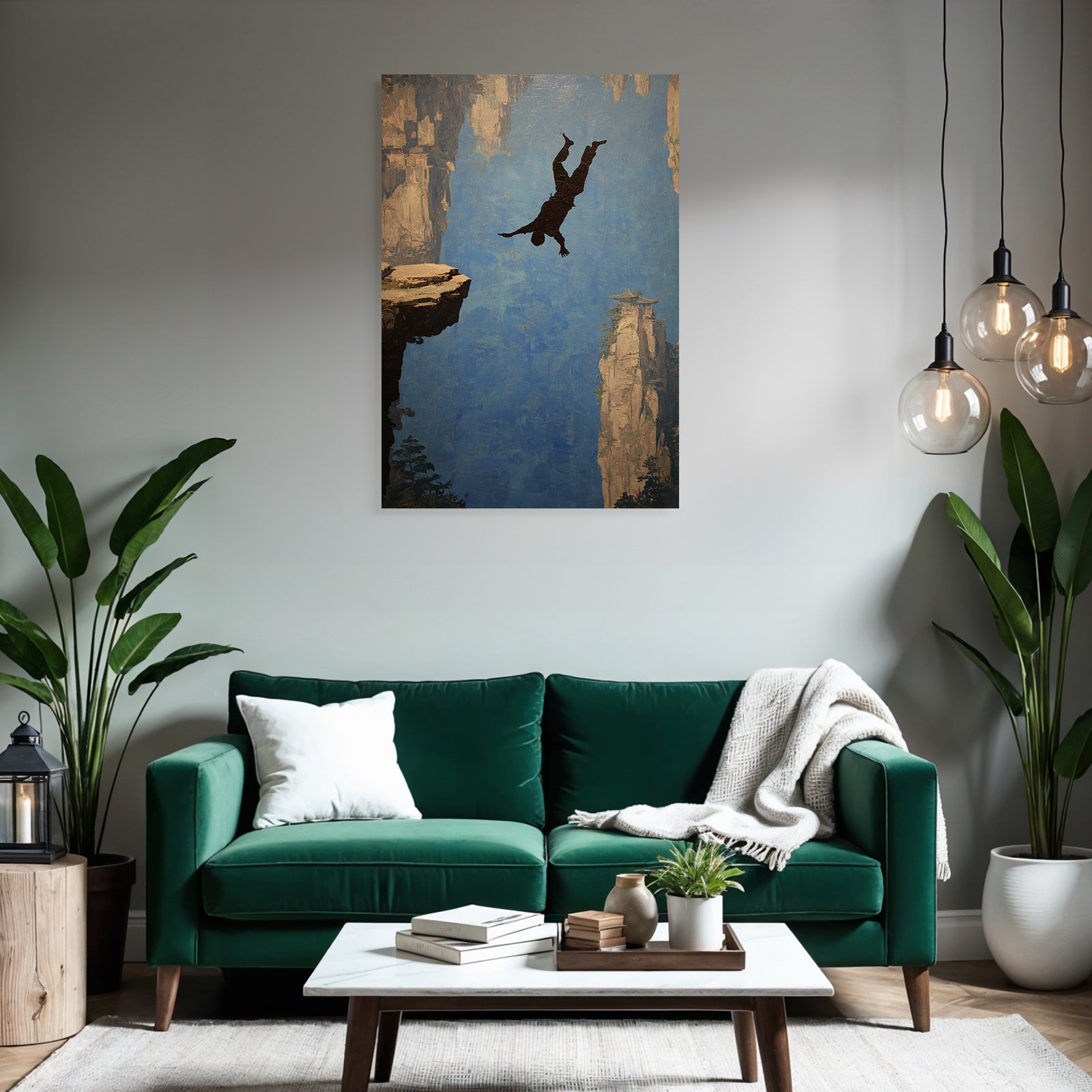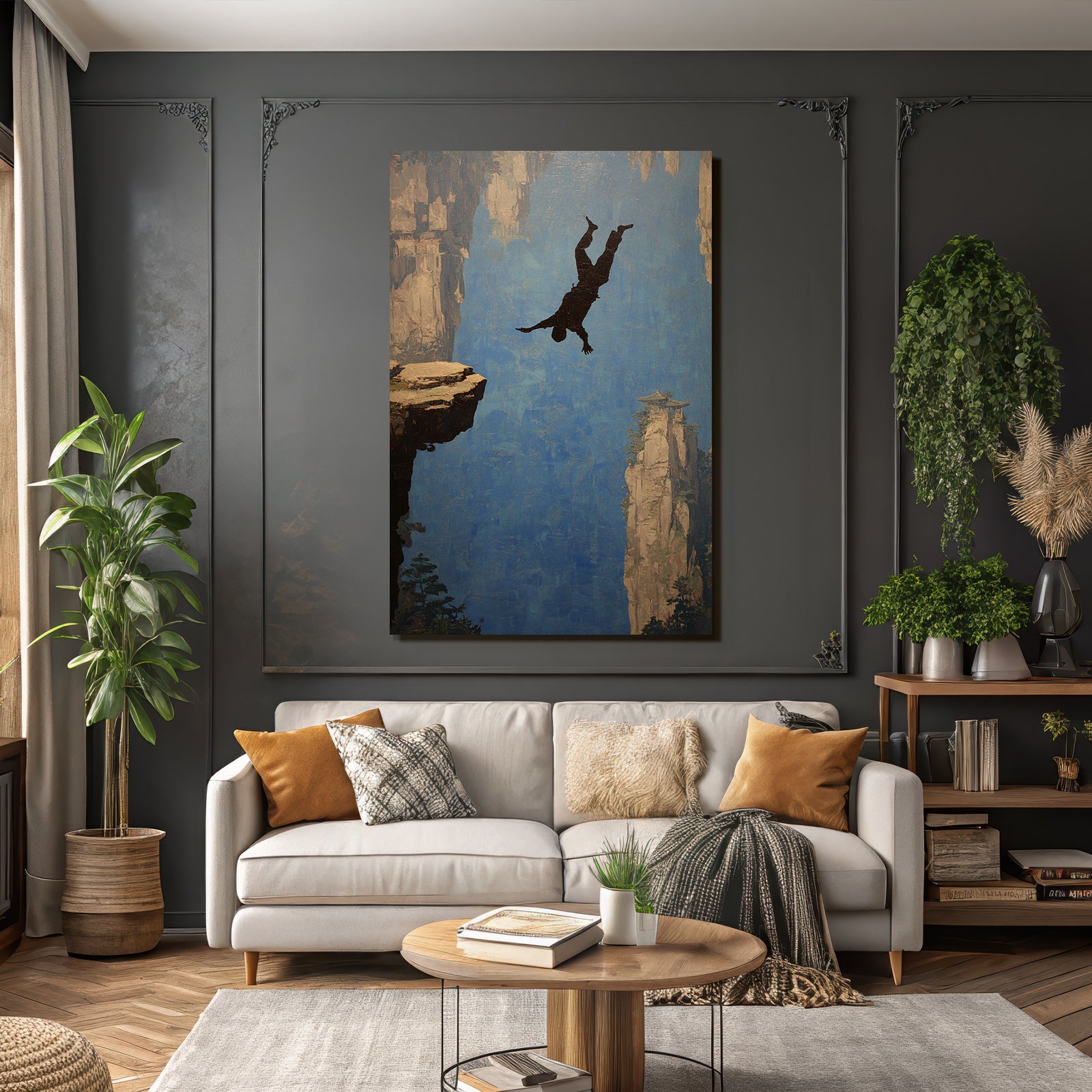 Ob im Wohnzimmer oder Essbereich – das Werk „Yoga Meditation Schatten Der Person Fallend Zwischen Felsen Und Blaüm Himmel“ im Stil Yoga und Meditation wird im FameFrame™ zum stilvollen Blickfang.