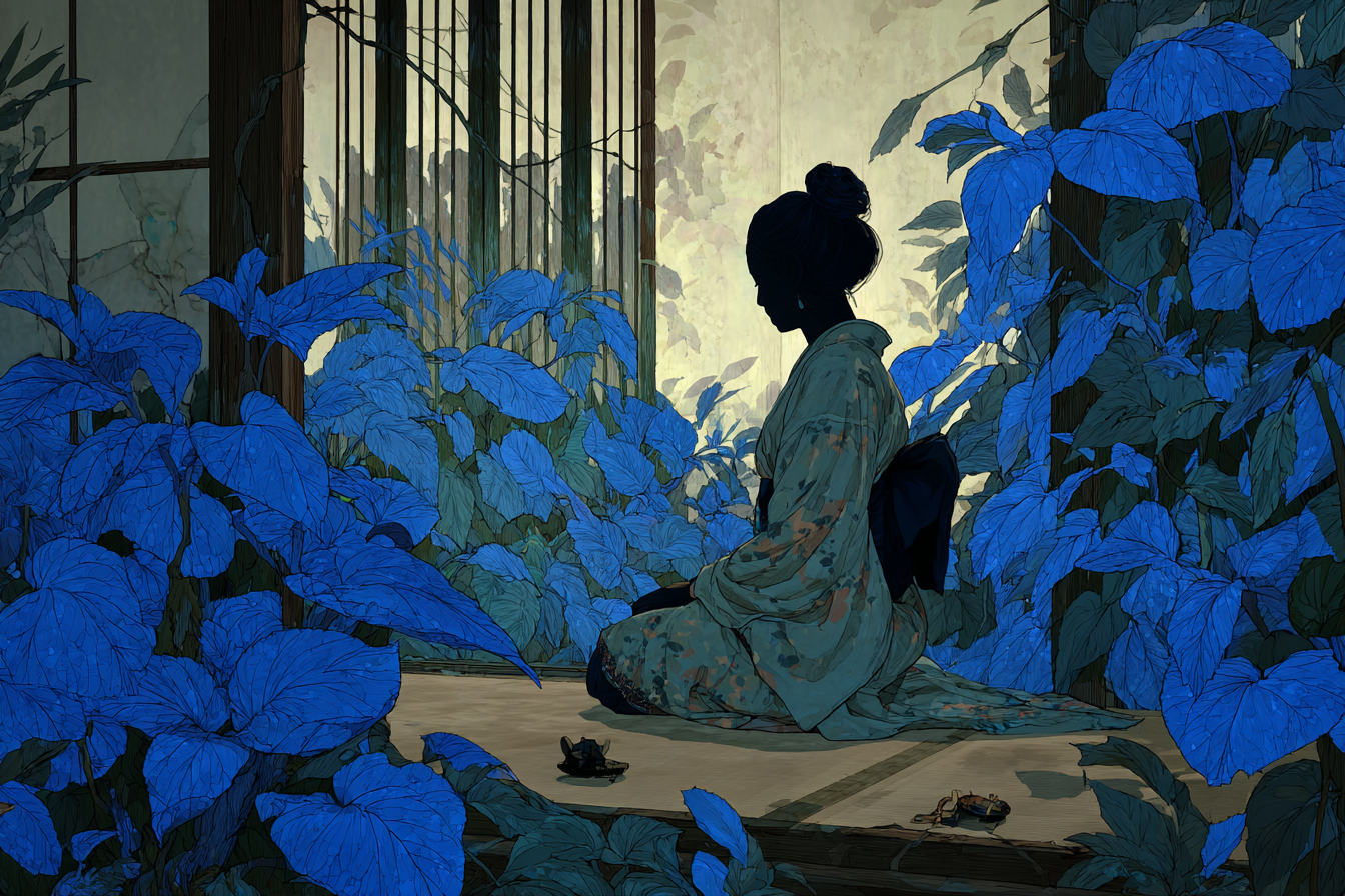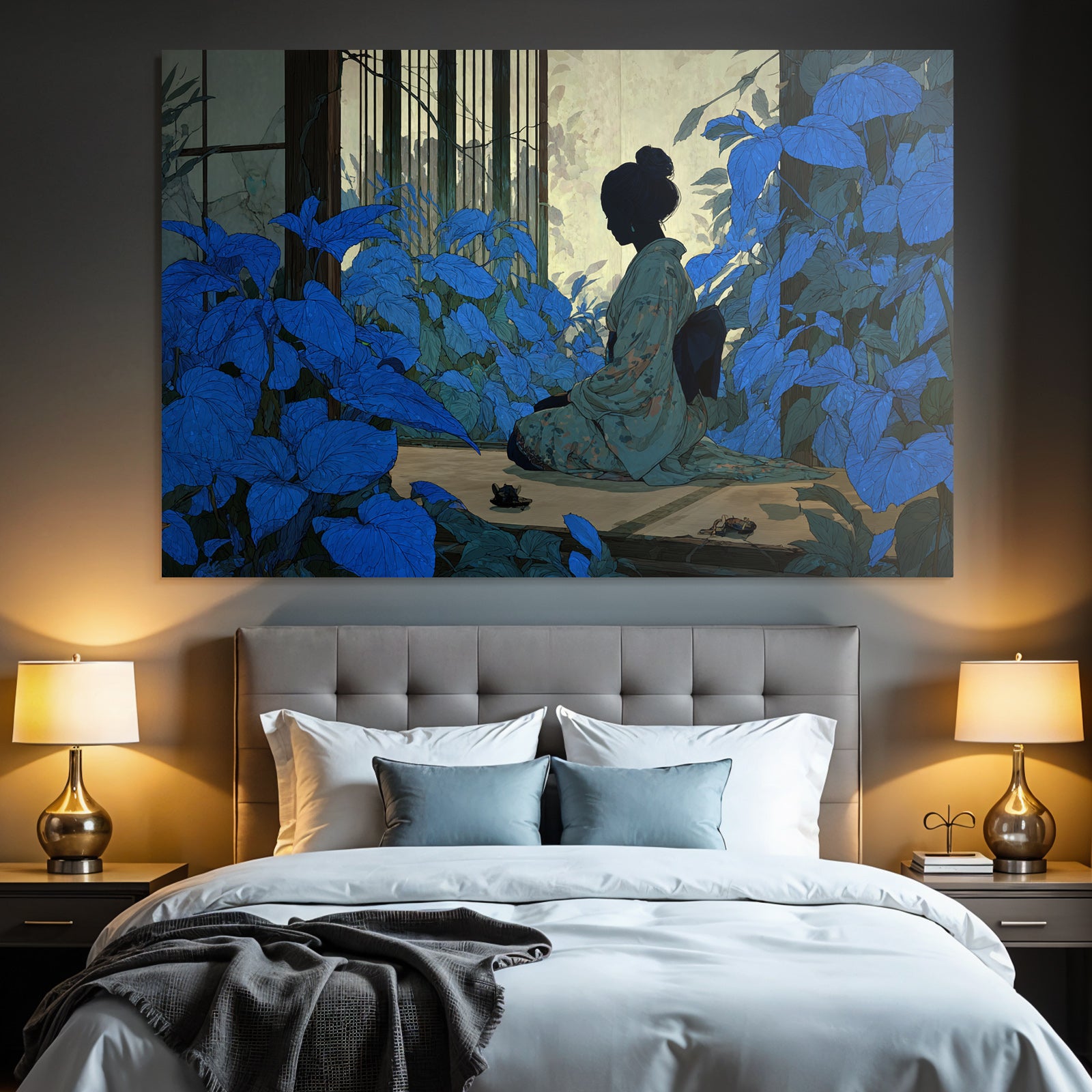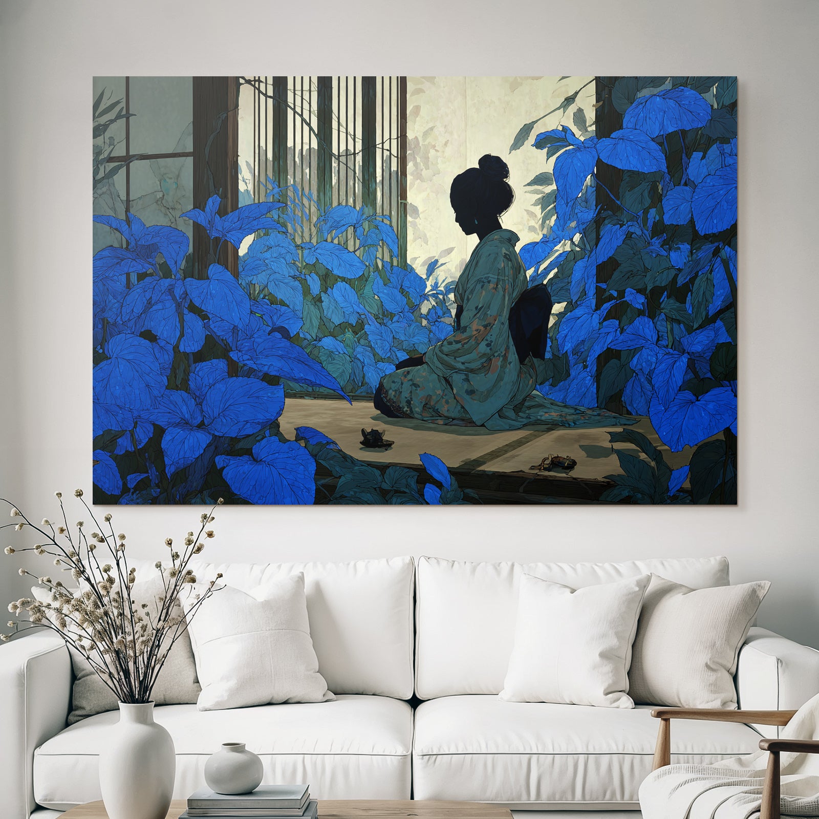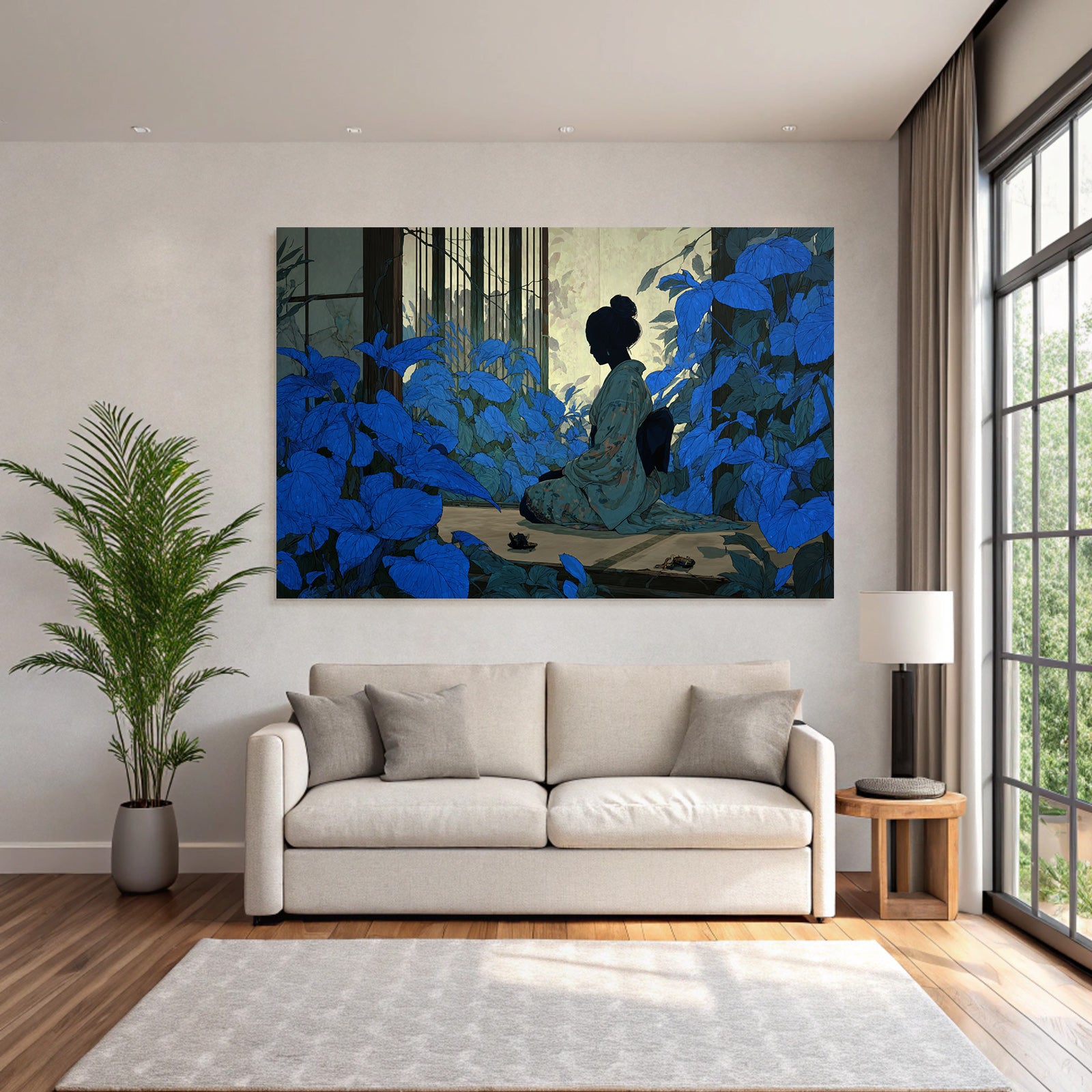 Ein Stück Yoga und Meditation für Deine vier Wände: Das Werk „Yoga Meditation Traditionelle Anzug In Mit Blaün Blättern Sanfte Umgebung“ im hochwertigen FameFrame™ bringt kreative Energie in jeden Raum.