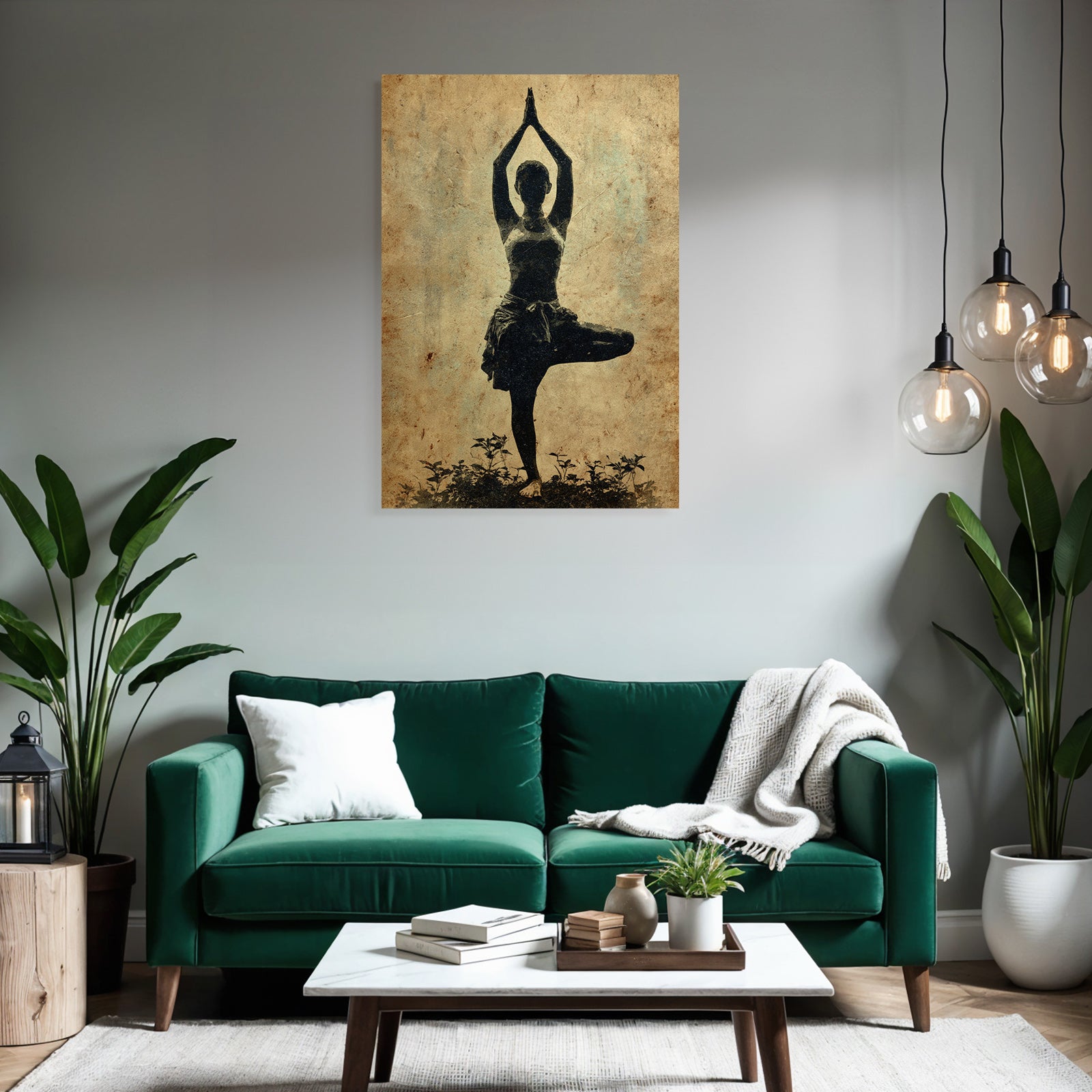 „Yoga Meditation Yoga Pose Silhoütte Mit Pflanzen Und Altem Hintergrund“ verleiht Ihrem Raum Charakter. Die Anlehnung an den Stil Yoga und Meditation, kombiniert mit der schlichten Eleganz des FameFrame™, schafft eine einzigartige Atmosphäre.