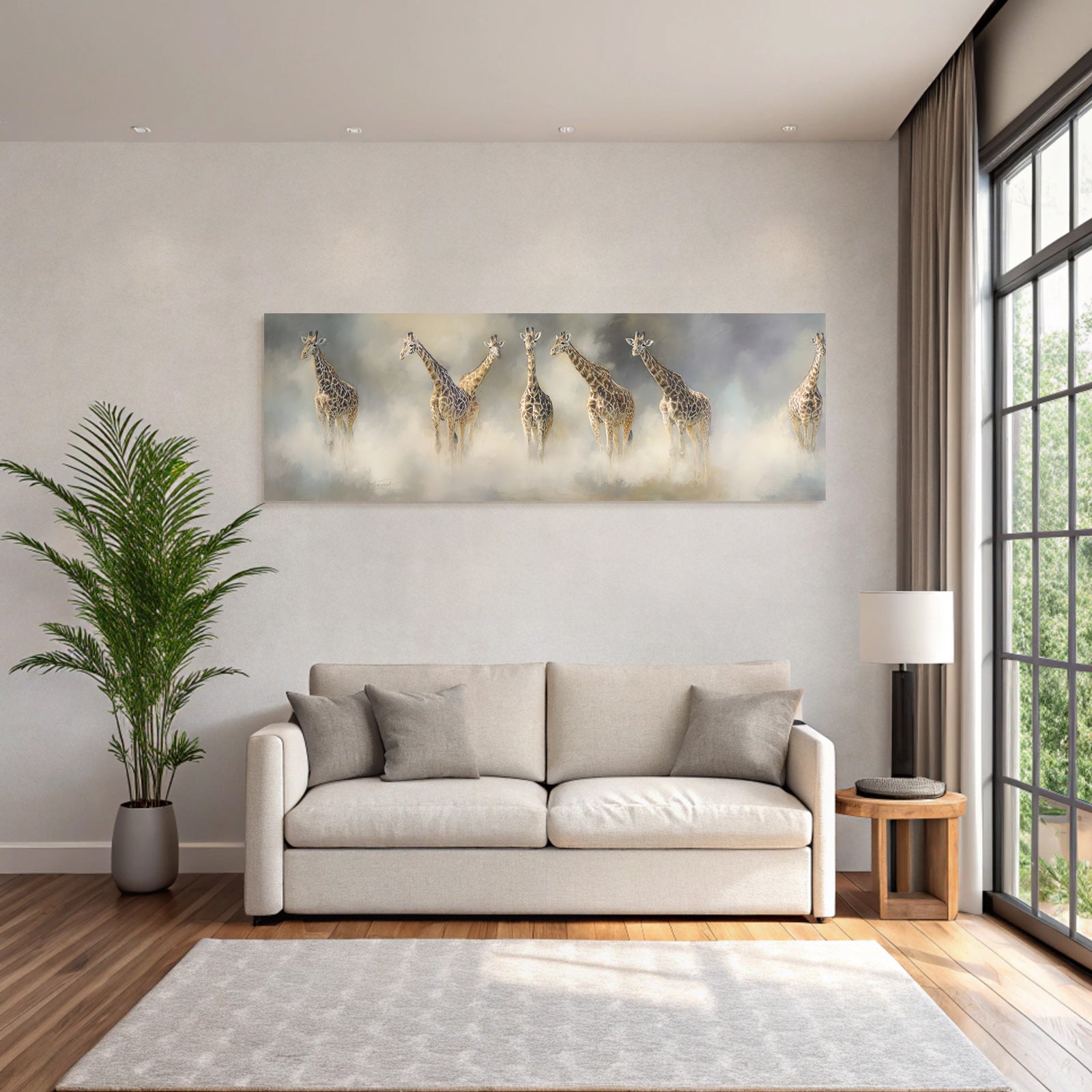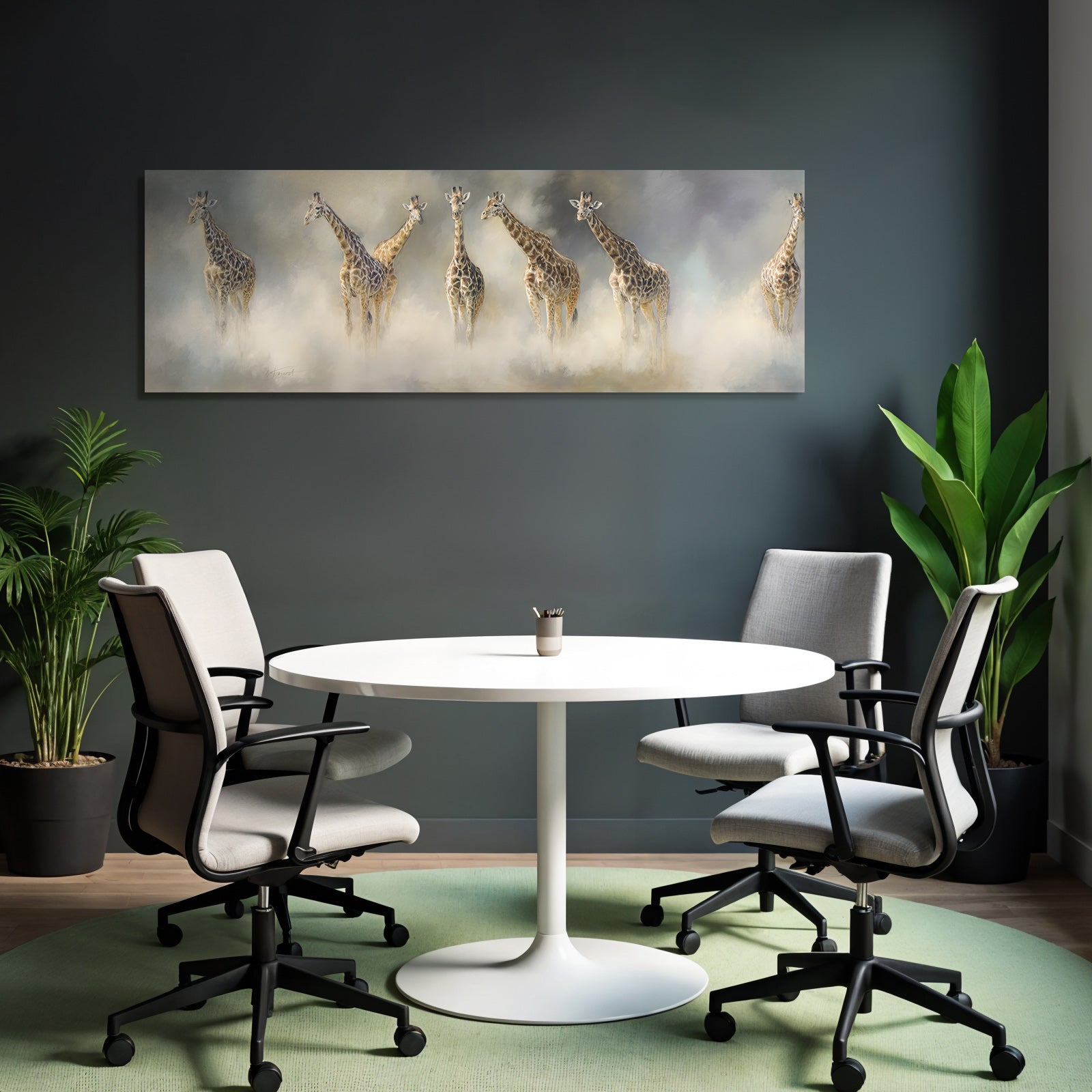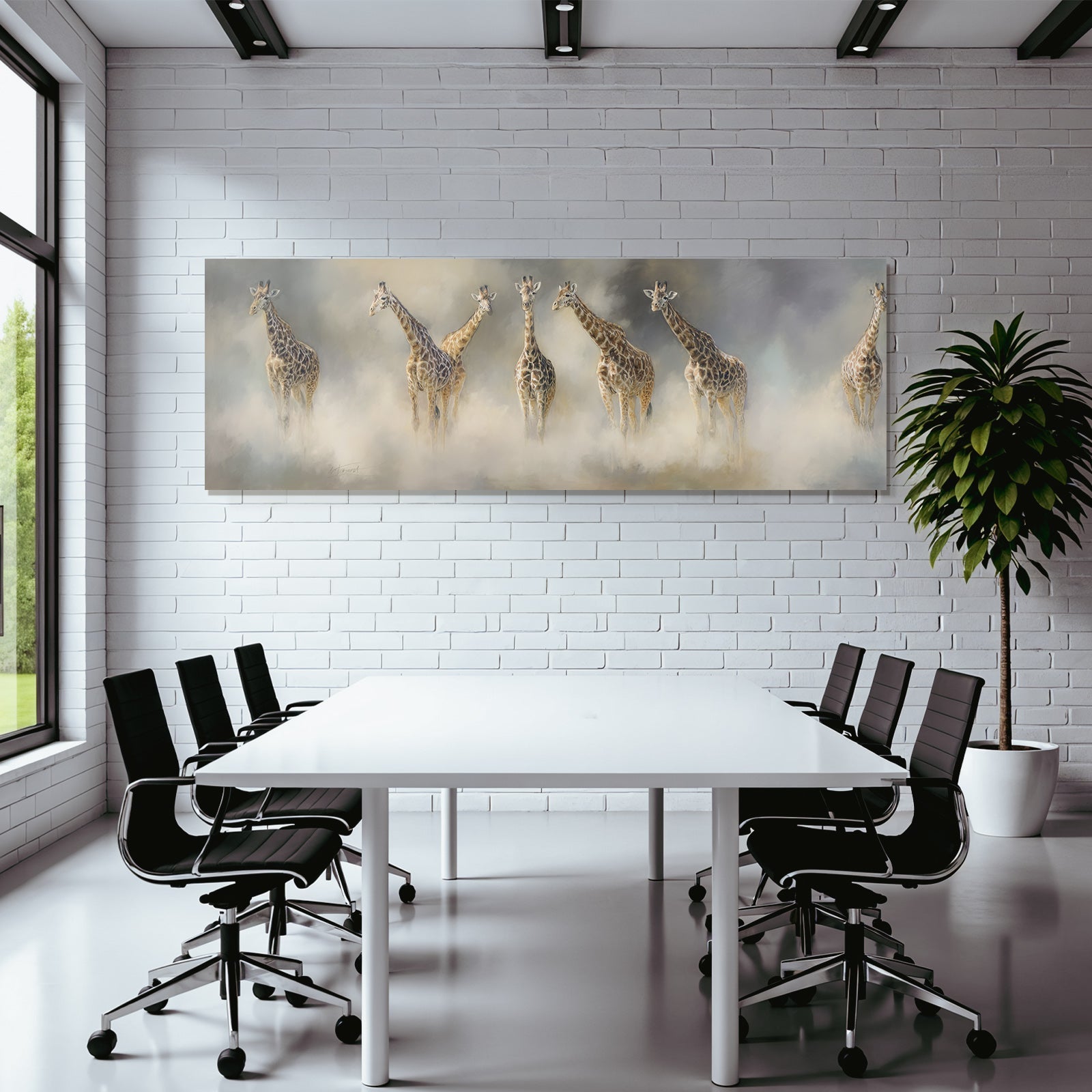 Ein Highlight für jeden Besprechungsraum oder eine großzügige Lobby. Das Werk „Giraffen Im Nebeltraum“ im Stil Safari und Wildtiere demonstriert im FameFrame Stilbewusstsein und Klasse.