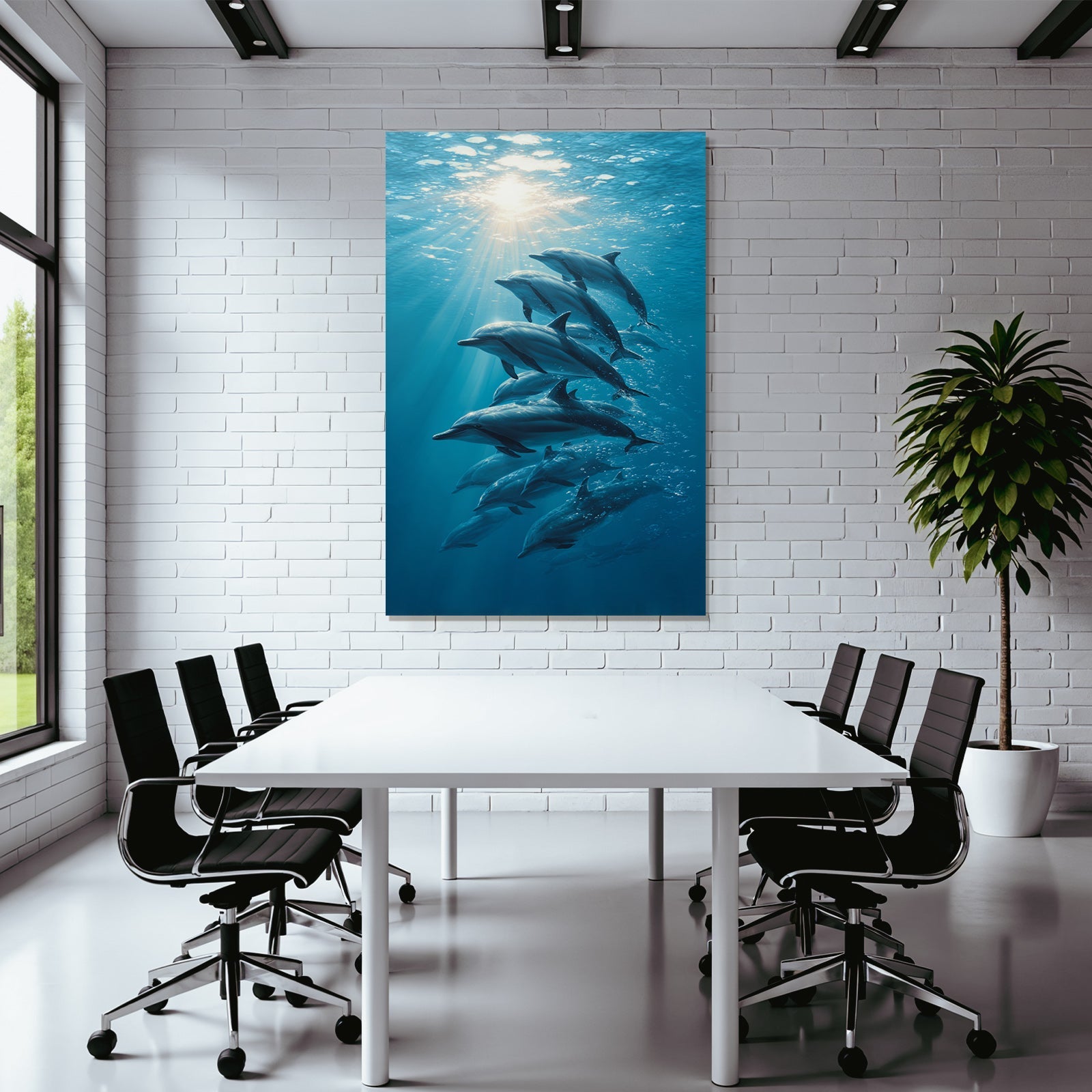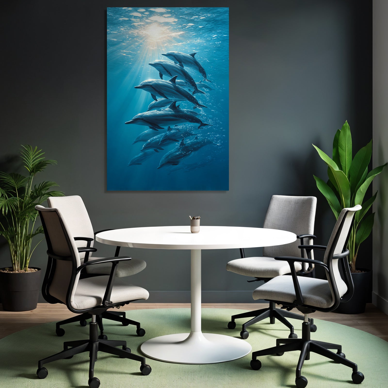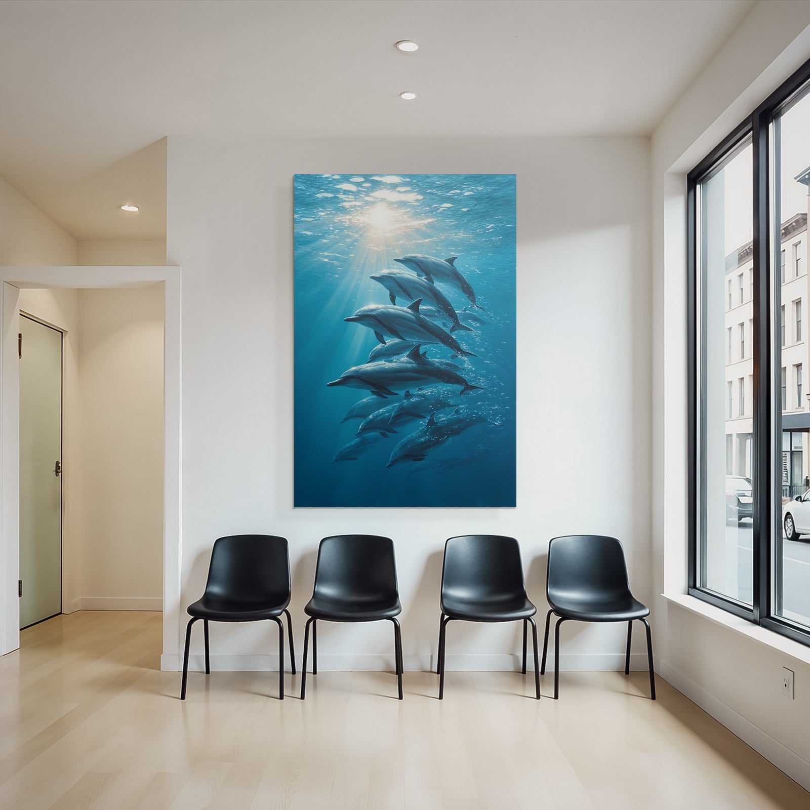 Dieses Werk mit dem Titel „Meeres Delfine Schwimmen Unterwasser Sonnenlicht“ ist eine meisterhafte Interpretation des Stils Meerestiere. Auf Stoff gespannt im FameFrame, entsteht ein fast schwebender Eindruck.