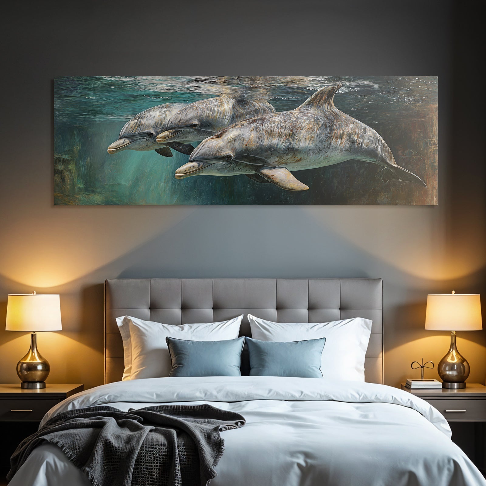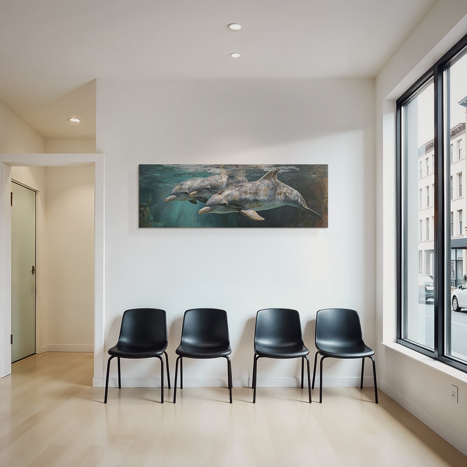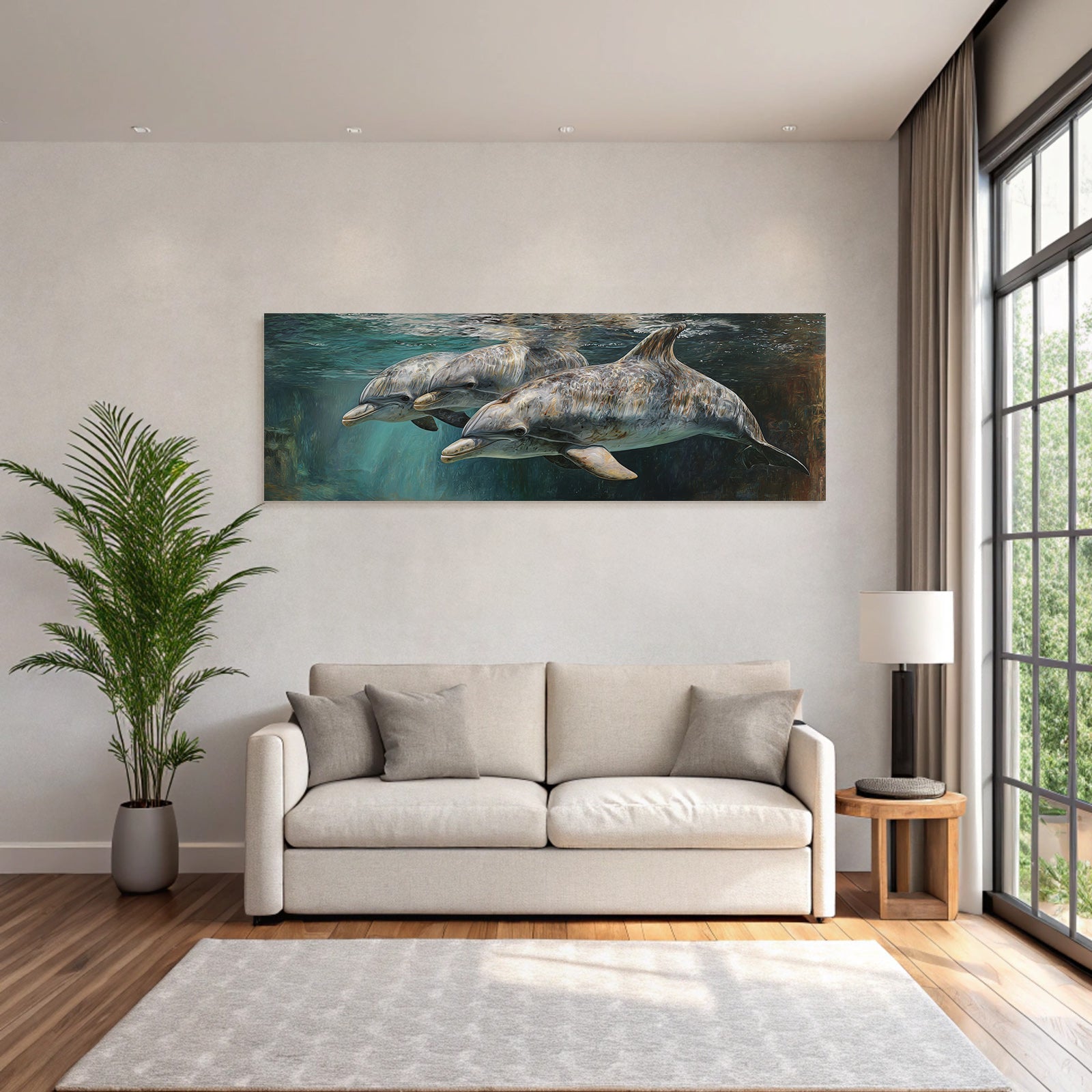 Ob für eine exklusive Boutique, ein modernes Restaurant oder Ihr Esszimmer – „Meeres Gruppe Von Delfinen Unterwasser“ im Meerestiere-Design schafft im FameFrame ein unvergessliches Ambiente.