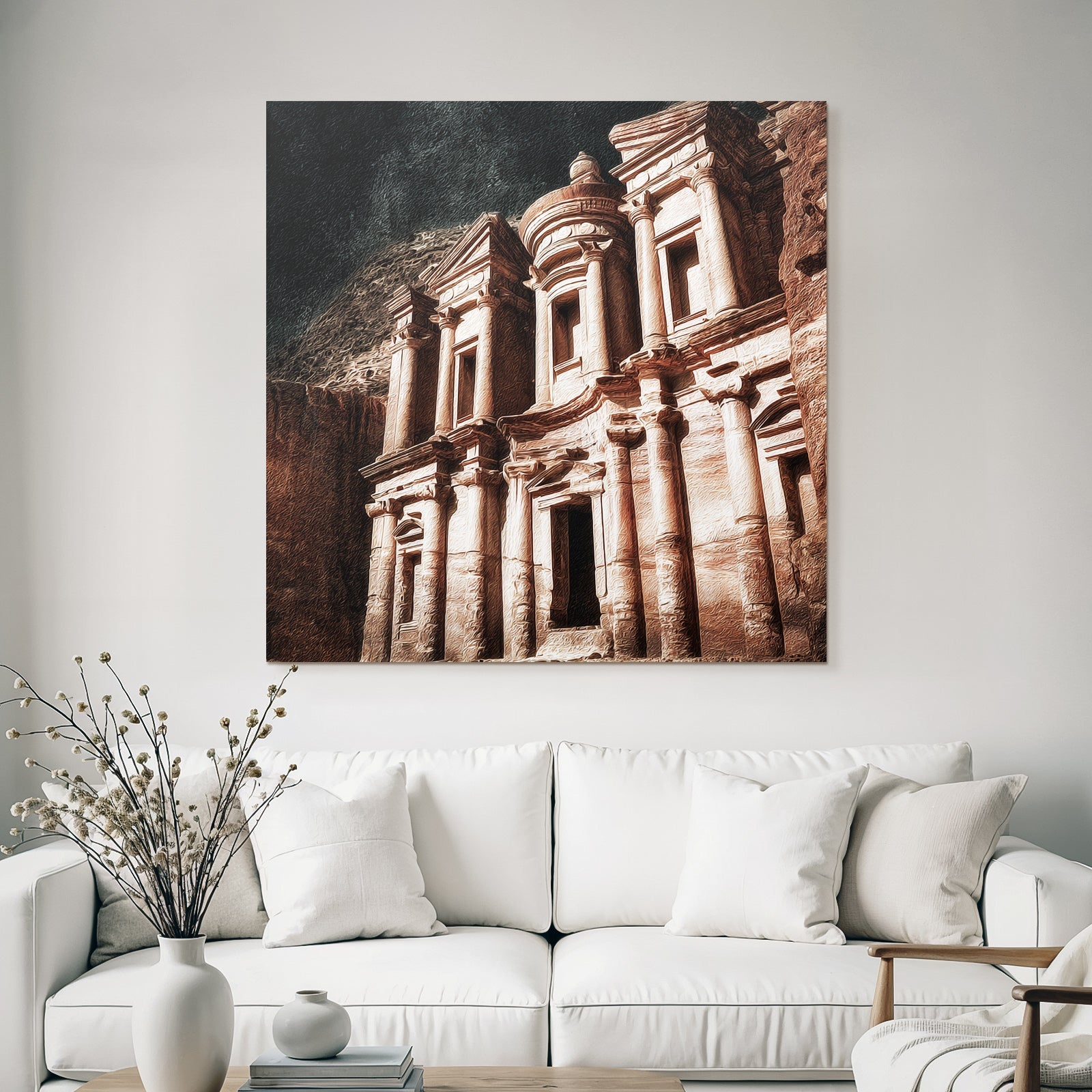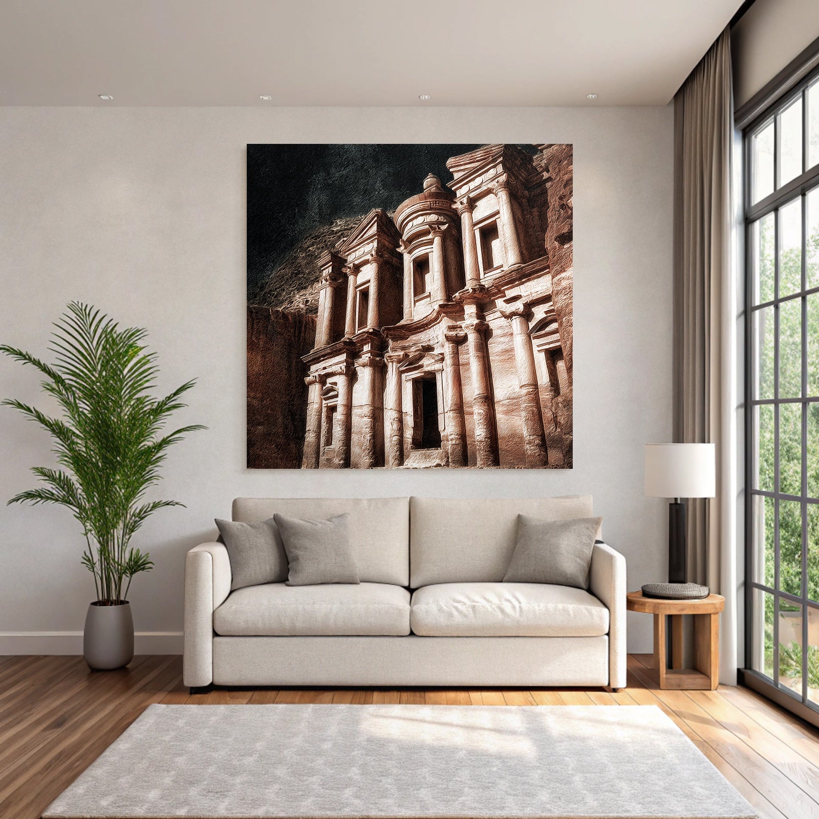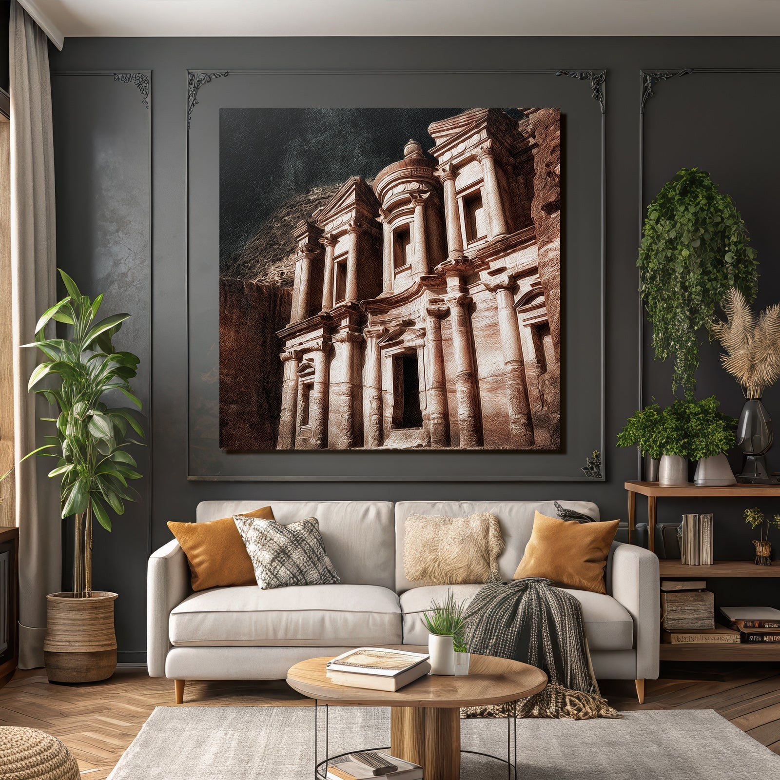 „Felsstadt Petra Schatzhausfassade“ im Stil UNESCO Weltkulturerbe sorgt für stilvolle Ruhe im Schlafzimmer oder inspirierende Energie im Büro – perfekt im FameFrame inszeniert.
