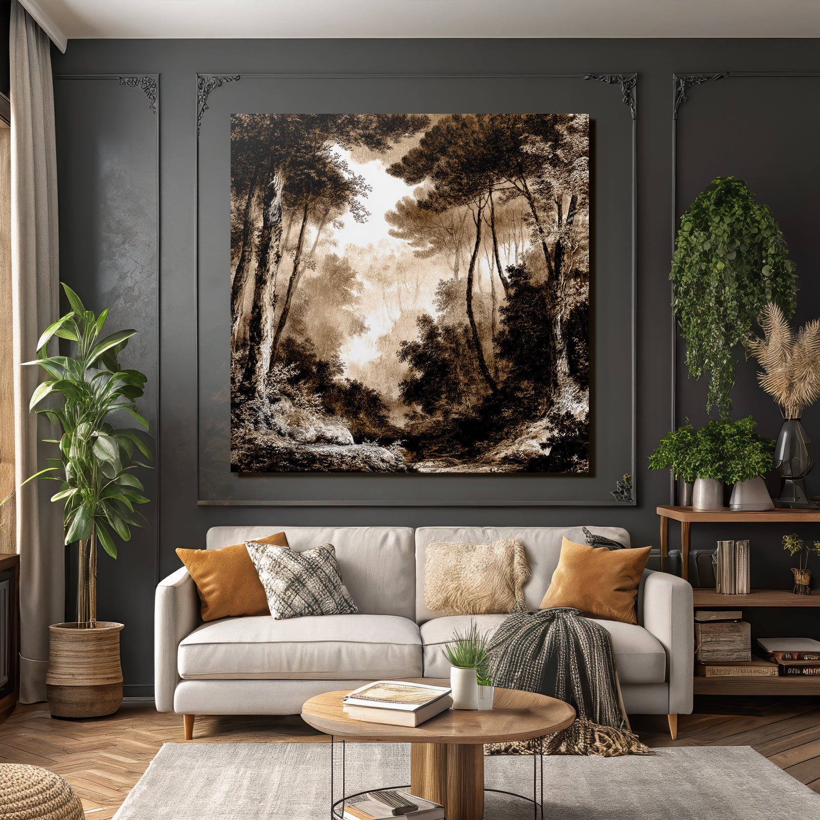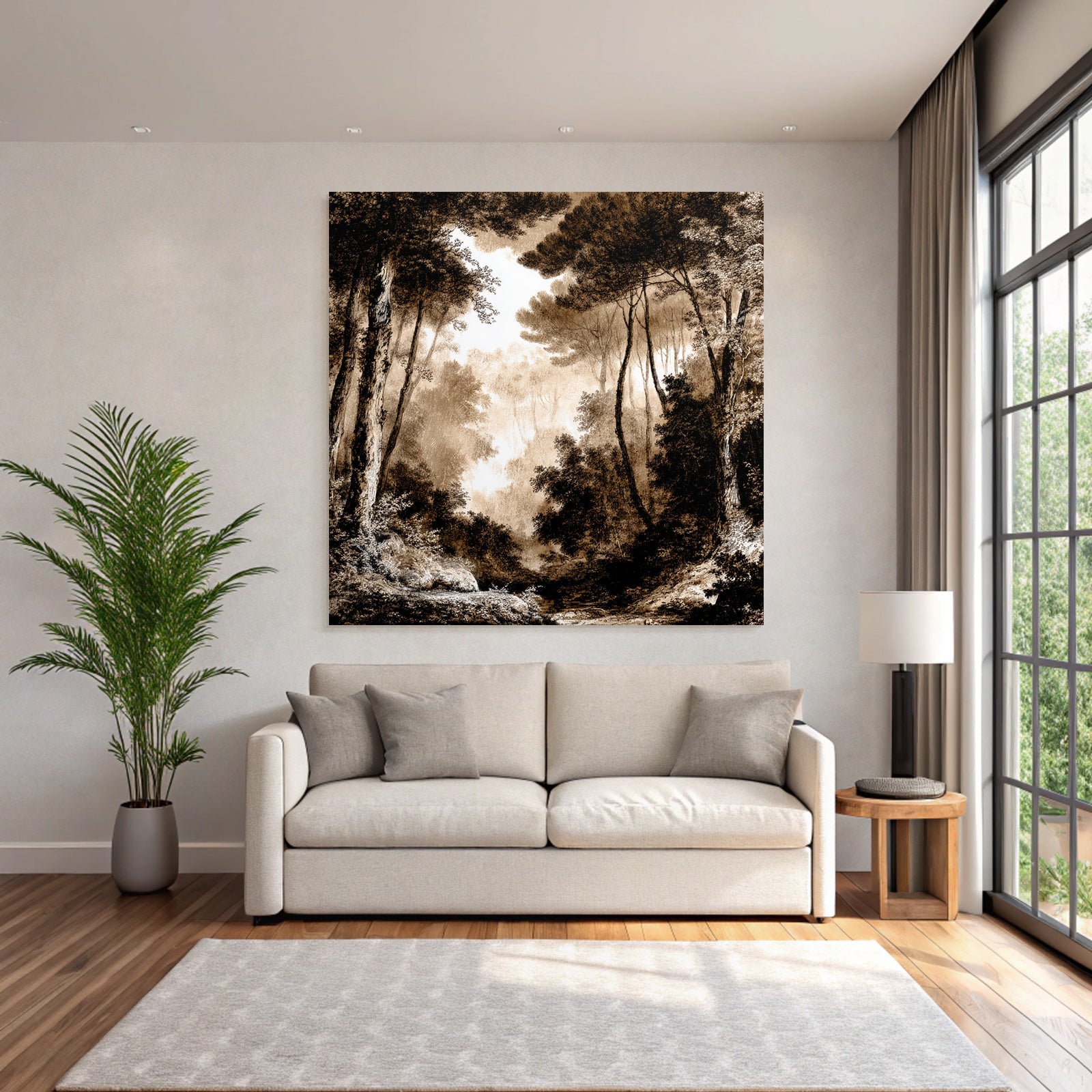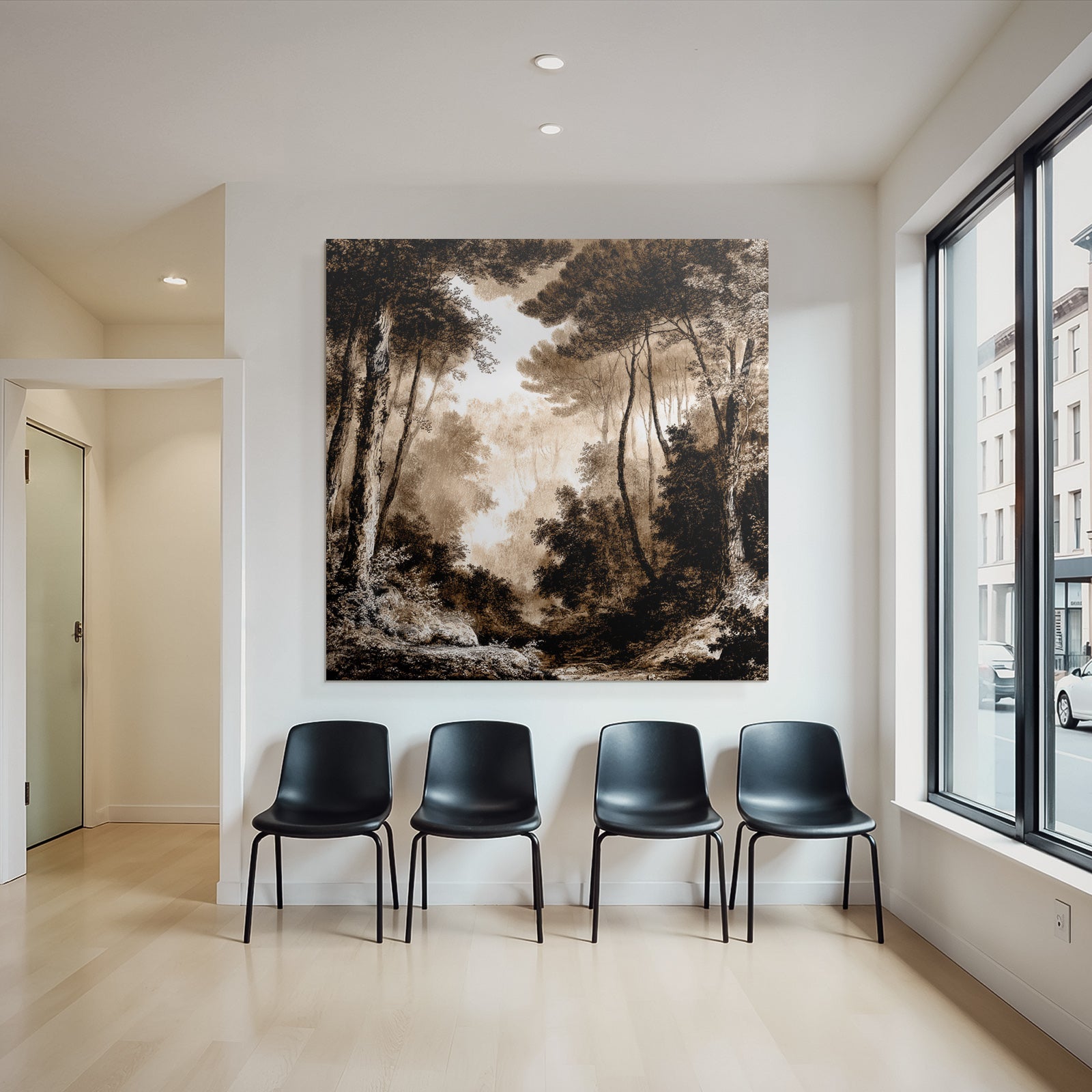 Mit dem Werk „Vernebelter Sepia Wald“ im Stil UNESCO Weltkulturerbe gestaltest Du Dein Wartezimmer oder Deine Hotel-Lobby eindrucksvoll und modern – auf Stoff im FameFrame.