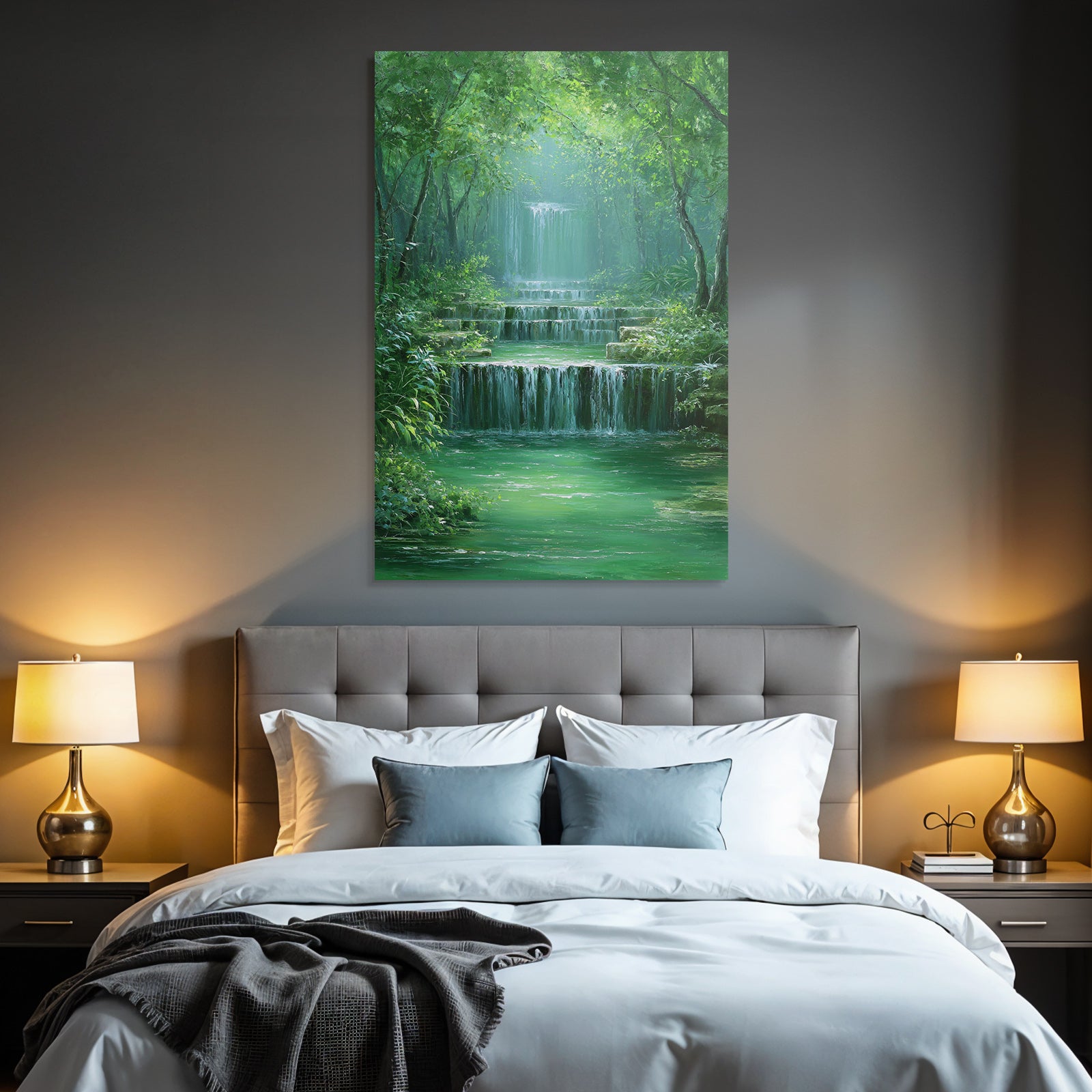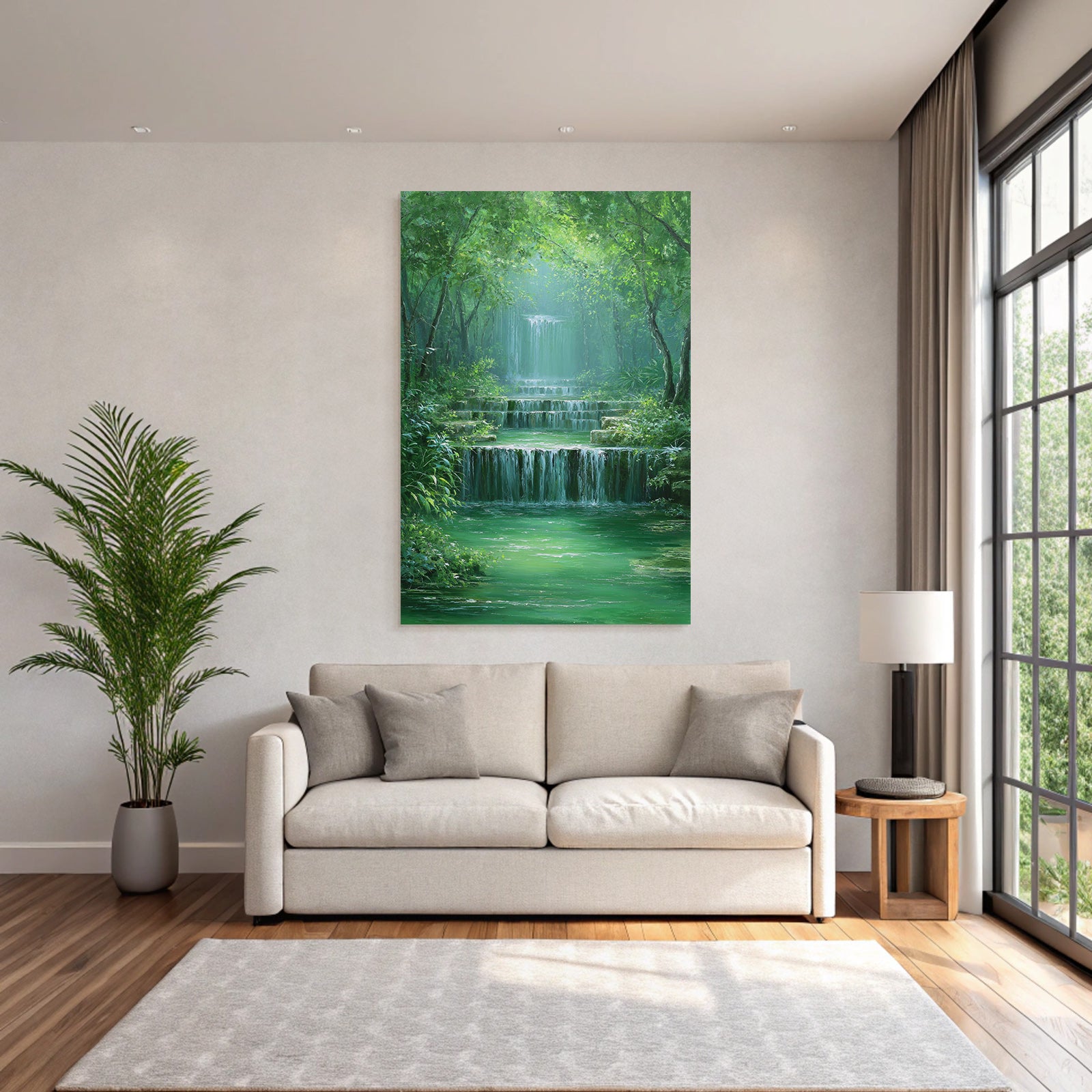 Kunst trifft Design: „Grüne Landschaft Mit Wasserfällen“ im Stil Wasserfaelle und Tropfen entfaltet im FameFrame seine volle Ausdruckskraft.