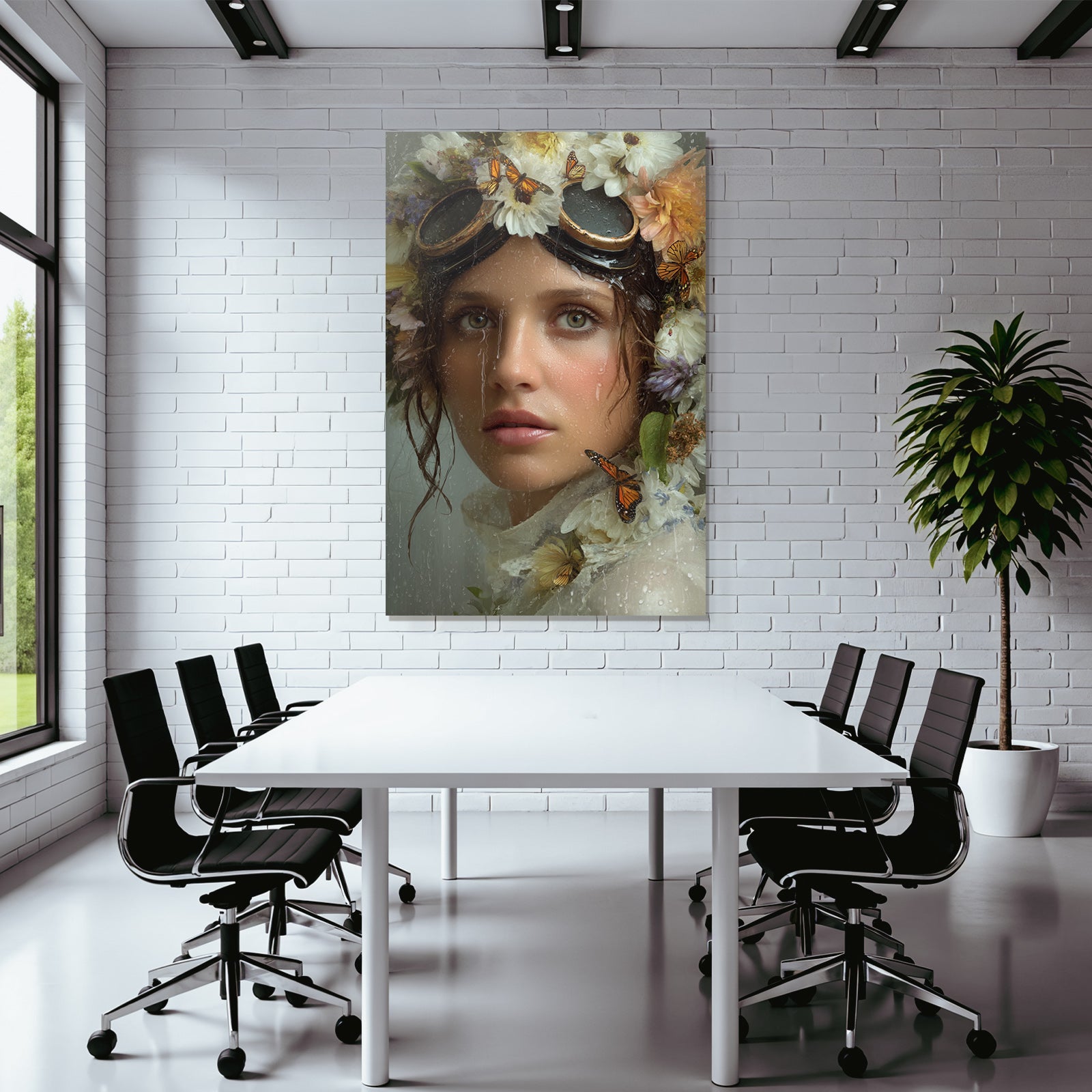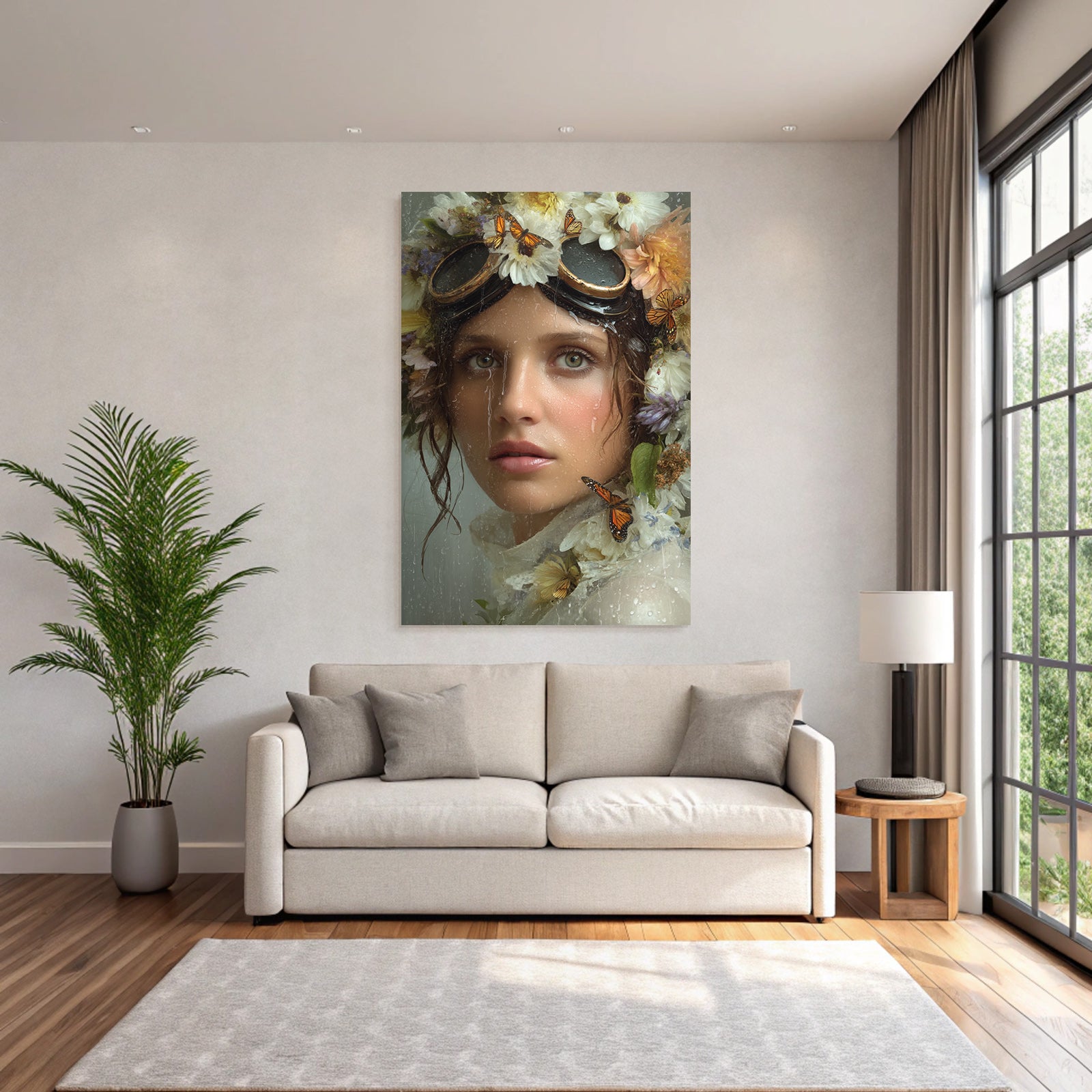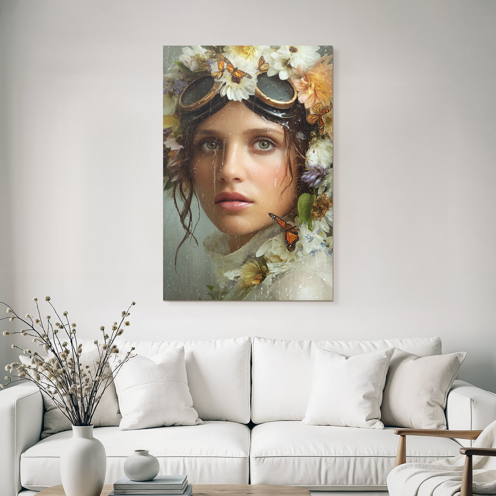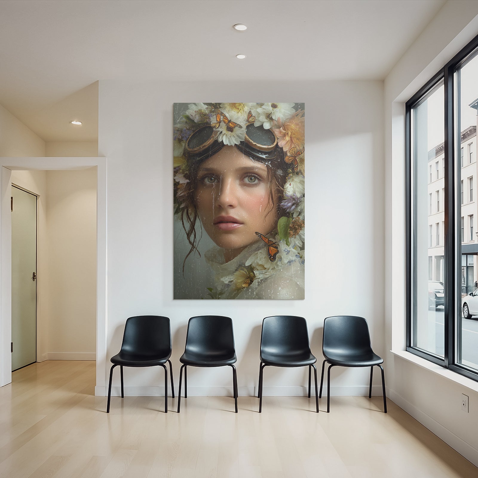 With the work “Flower Wreath Woman Butterflies Water Dreamer Label” in the digital art style, you can design your waiting room or hotel lobby in an impressive and modern way – on fabric in the FameFrame .