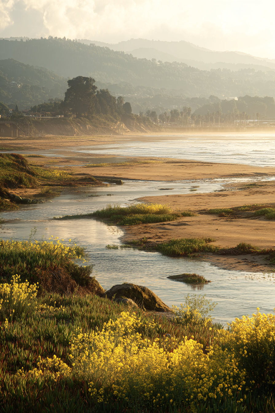 Perfekt für Ihr Wohnzimmer oder einen stilvollen Empfangsbereich: Das Werk „Friedliche Naturlandschaft Fluss Flora Hügel Warmes Licht“ im Stil Dünen und Heide wird im FameFrame™ zum Mittelpunkt des Raumes.