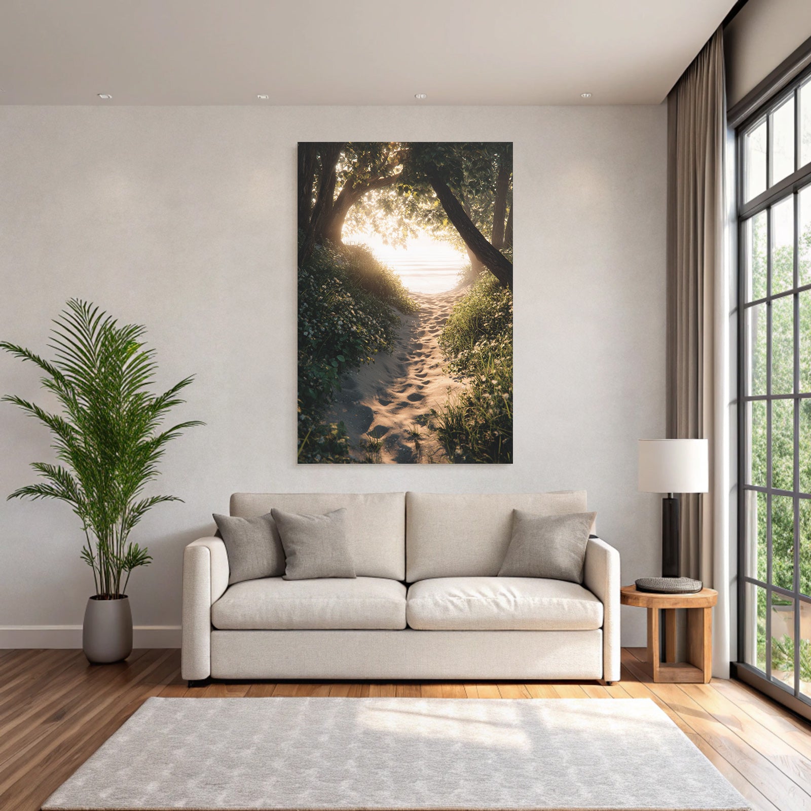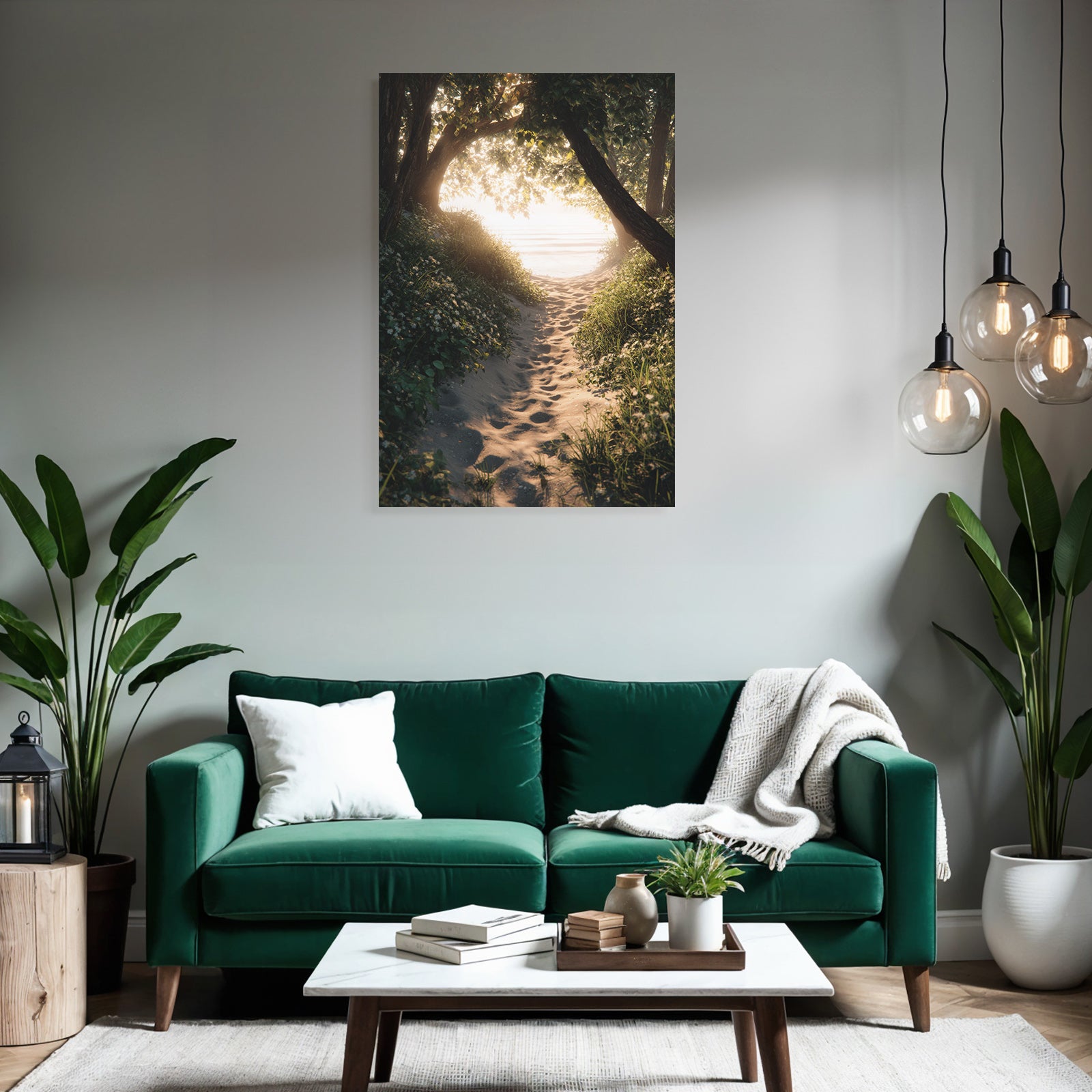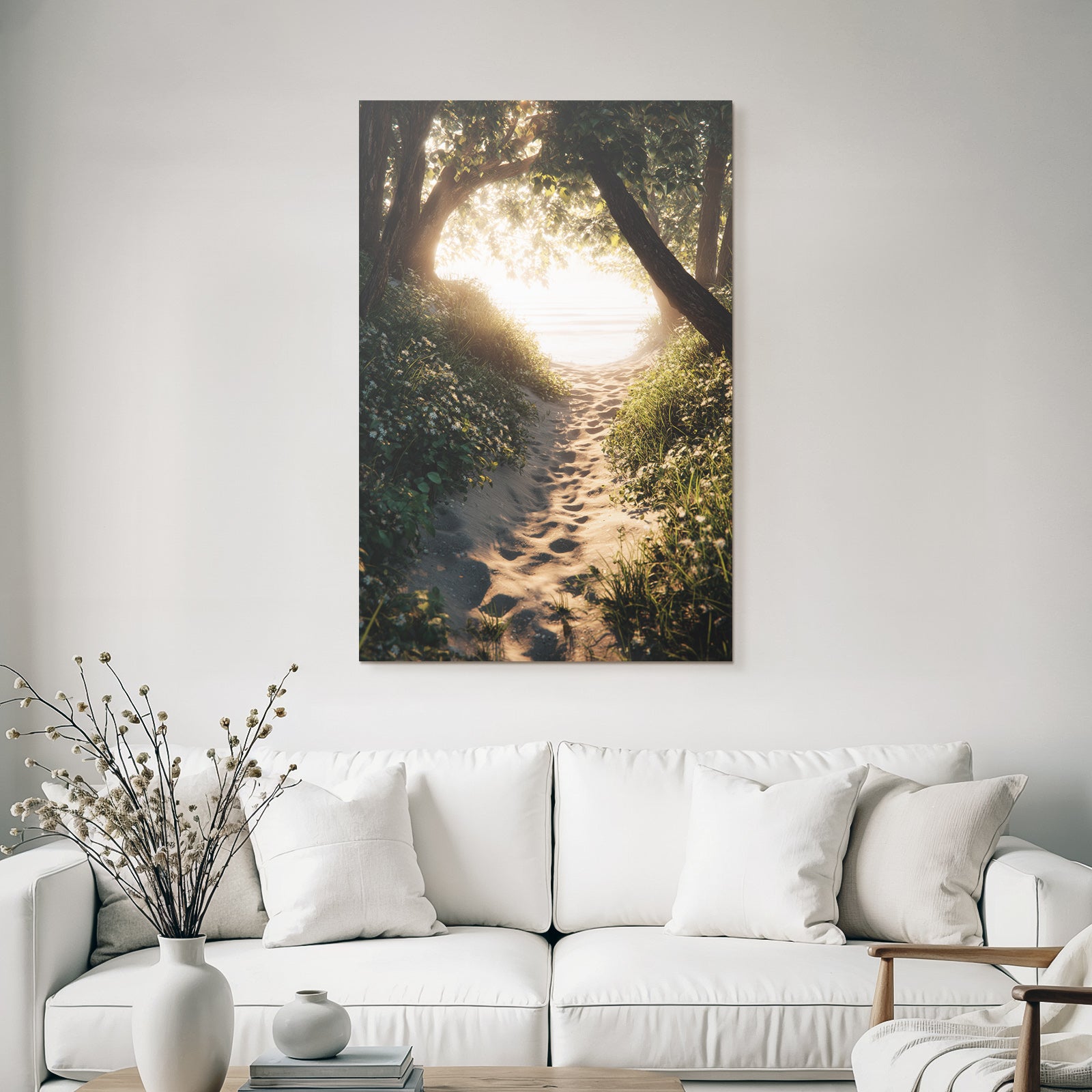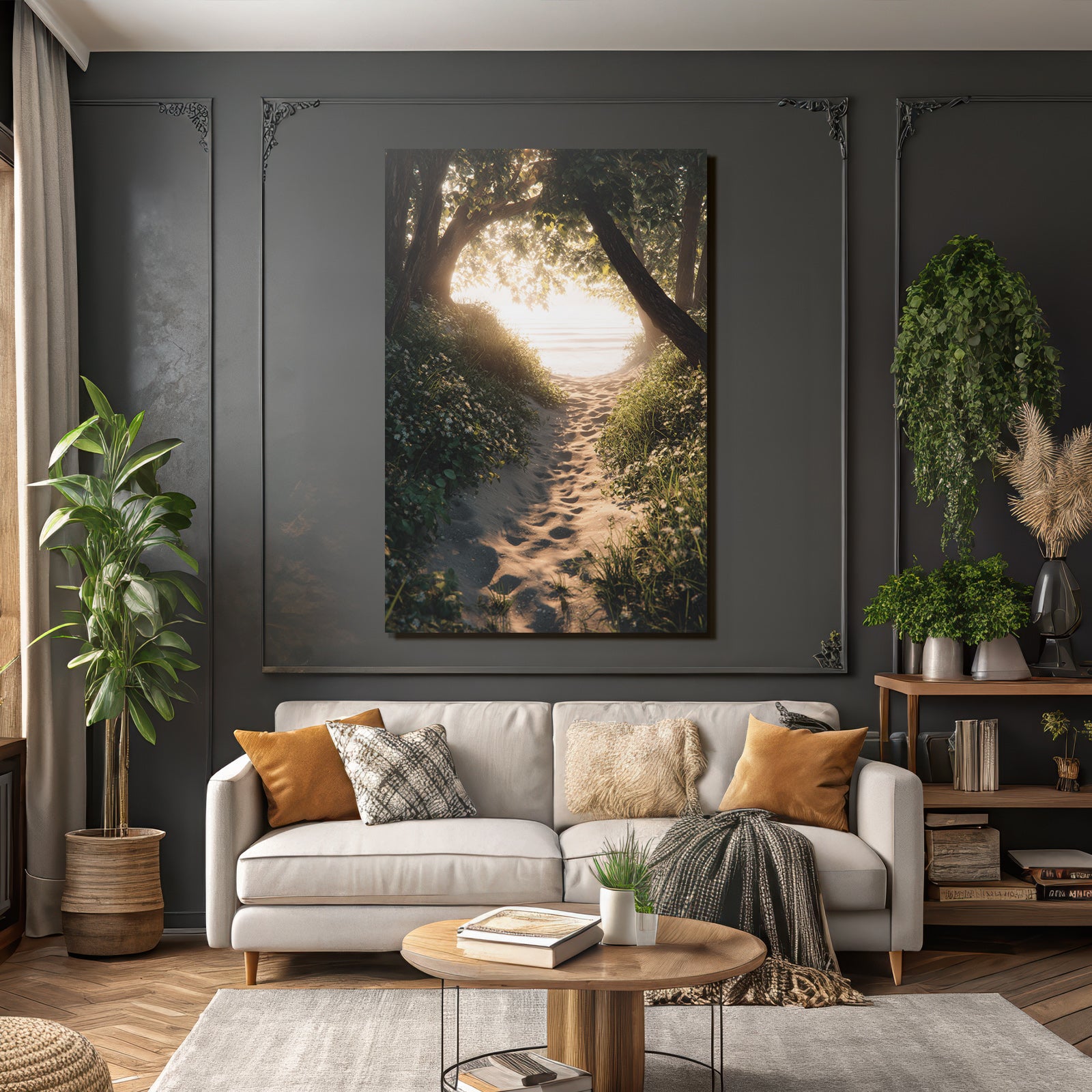 Dünen und Heide in seiner schönsten Form. Das Motiv „Ruhiger Naturweg Zum Wasser Mit Fussabdrücken“ besticht durch seine klare Komposition und wird im FameFrame™ zu einem Kunstobjekt von bleibendem Wert.