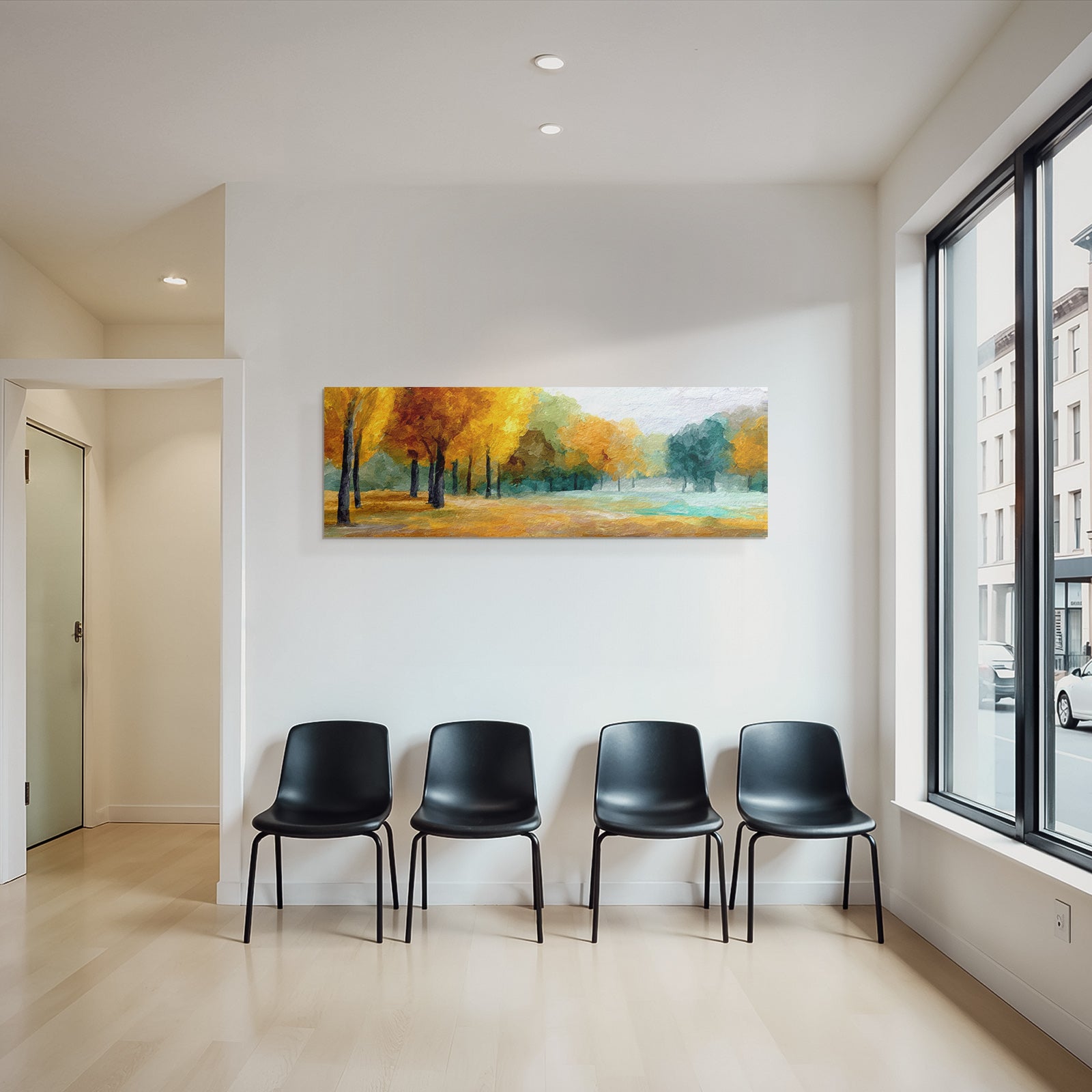 Ein einzigartiges Kunstwerk der Produktlinie FameFrame™ mit dem Titel „Herbstlandschaft Im Waldpark In Aquarell“, im Stil Expressionismus.
