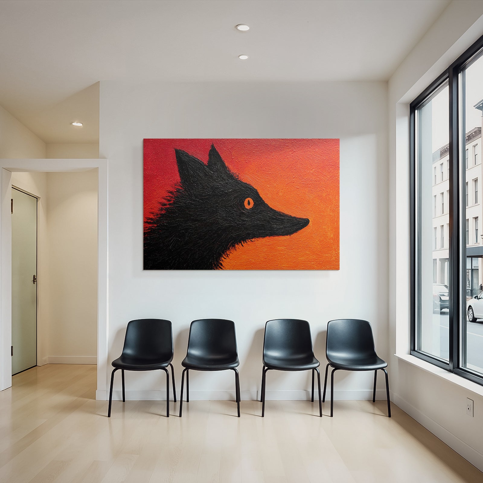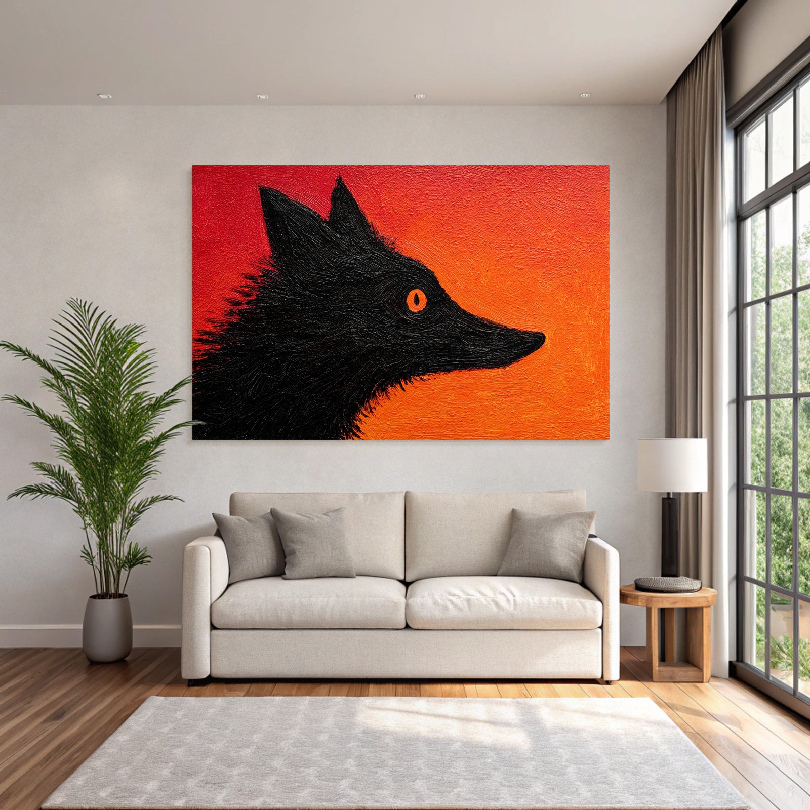 Setzen Sie im Flur oder Eingangsbereich ein erstes Willkommens-Statement. „Roter Orange Hintergrund Mit Wolfsilhoütte“ im Stil Expressionismus zieht im FameFrame™ sofort alle Blicke auf sich.